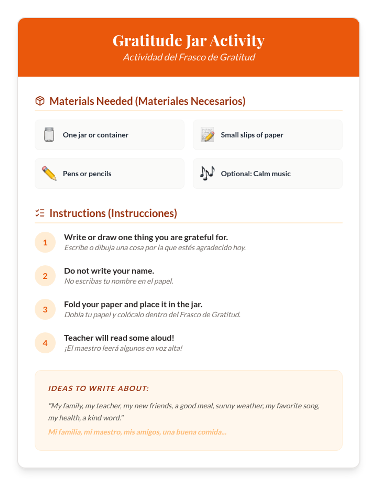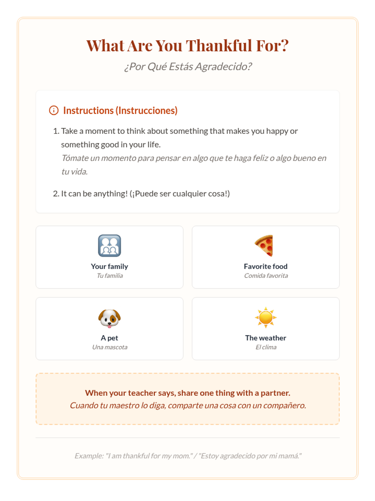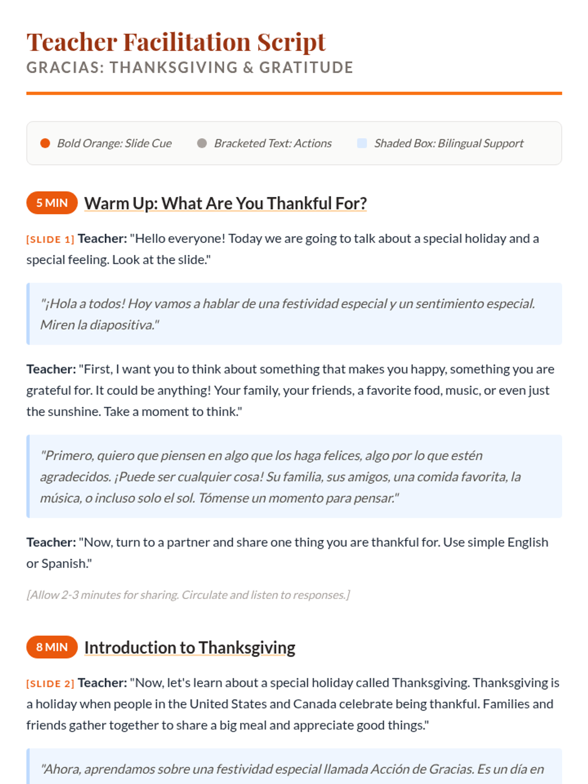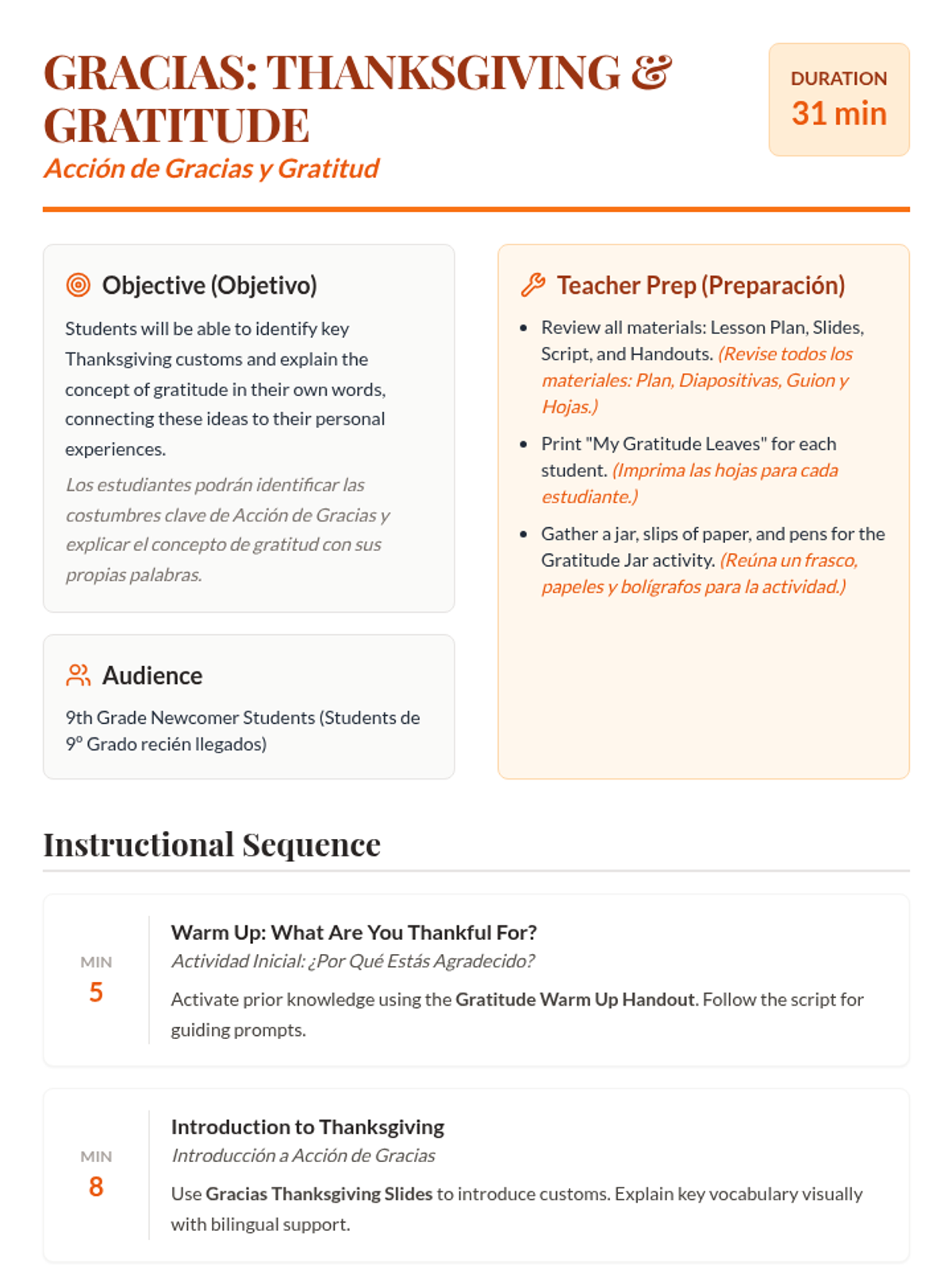 A 31-minute lesson for 9th-grade newcomer students exploring Thanksgiving traditions and the universal concept of gratitude through bilingual instruction and reflective activities.