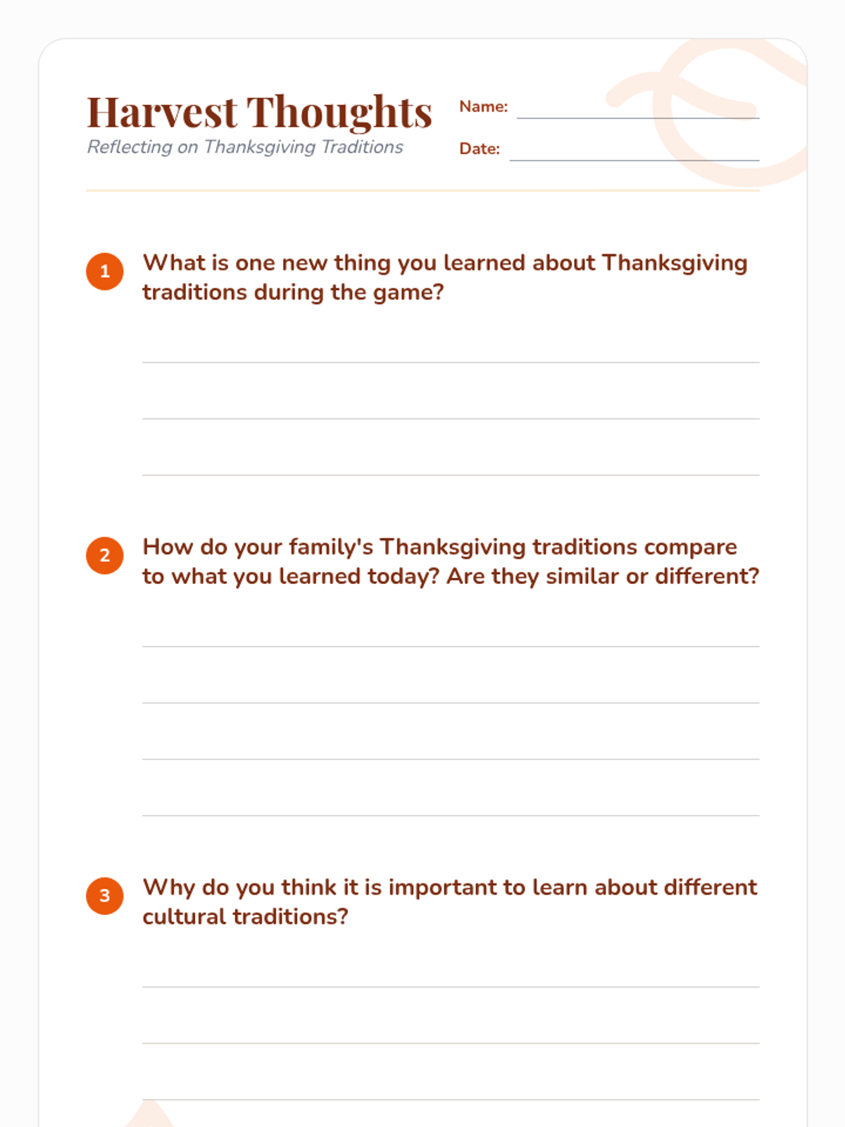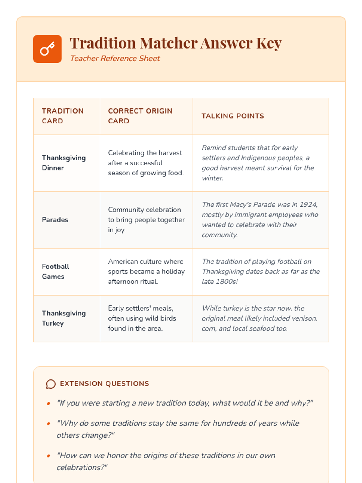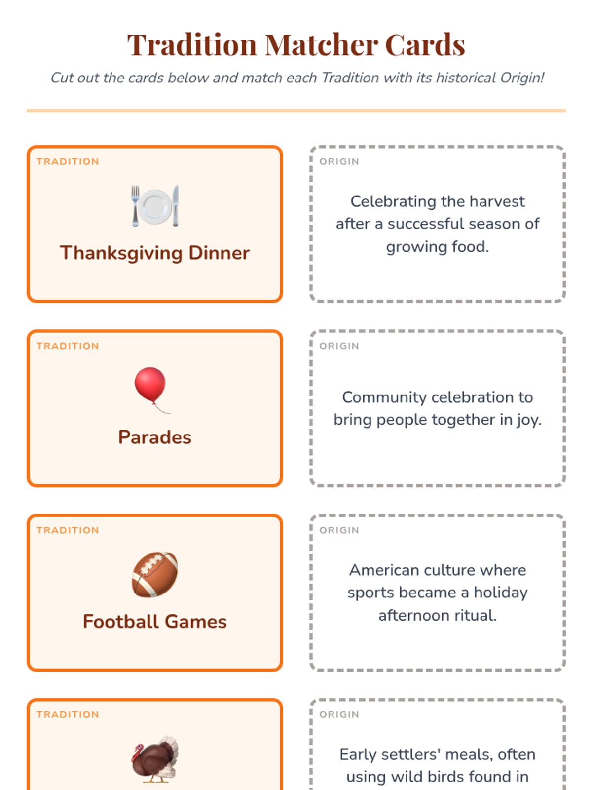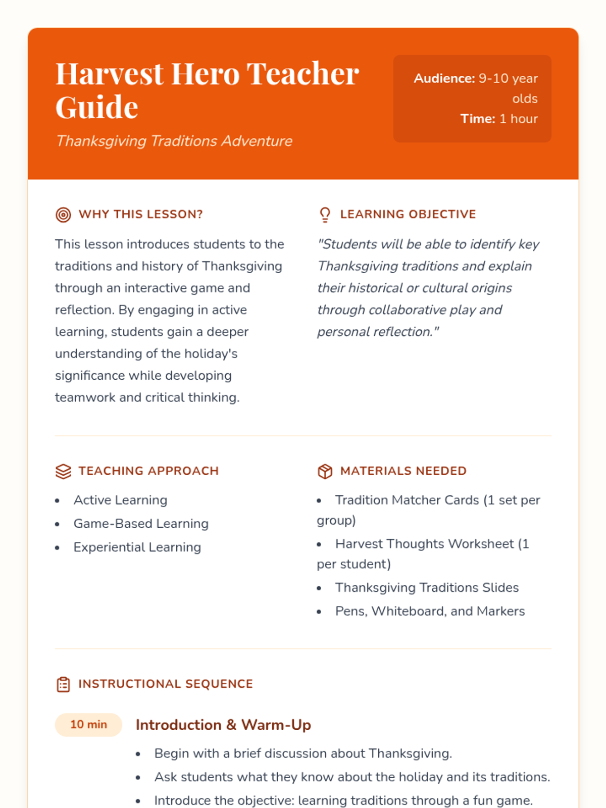 This lesson introduces 9-10 year olds to the history and traditions of Thanksgiving through an interactive matching game and reflective activities, fostering cultural awareness and teamwork.