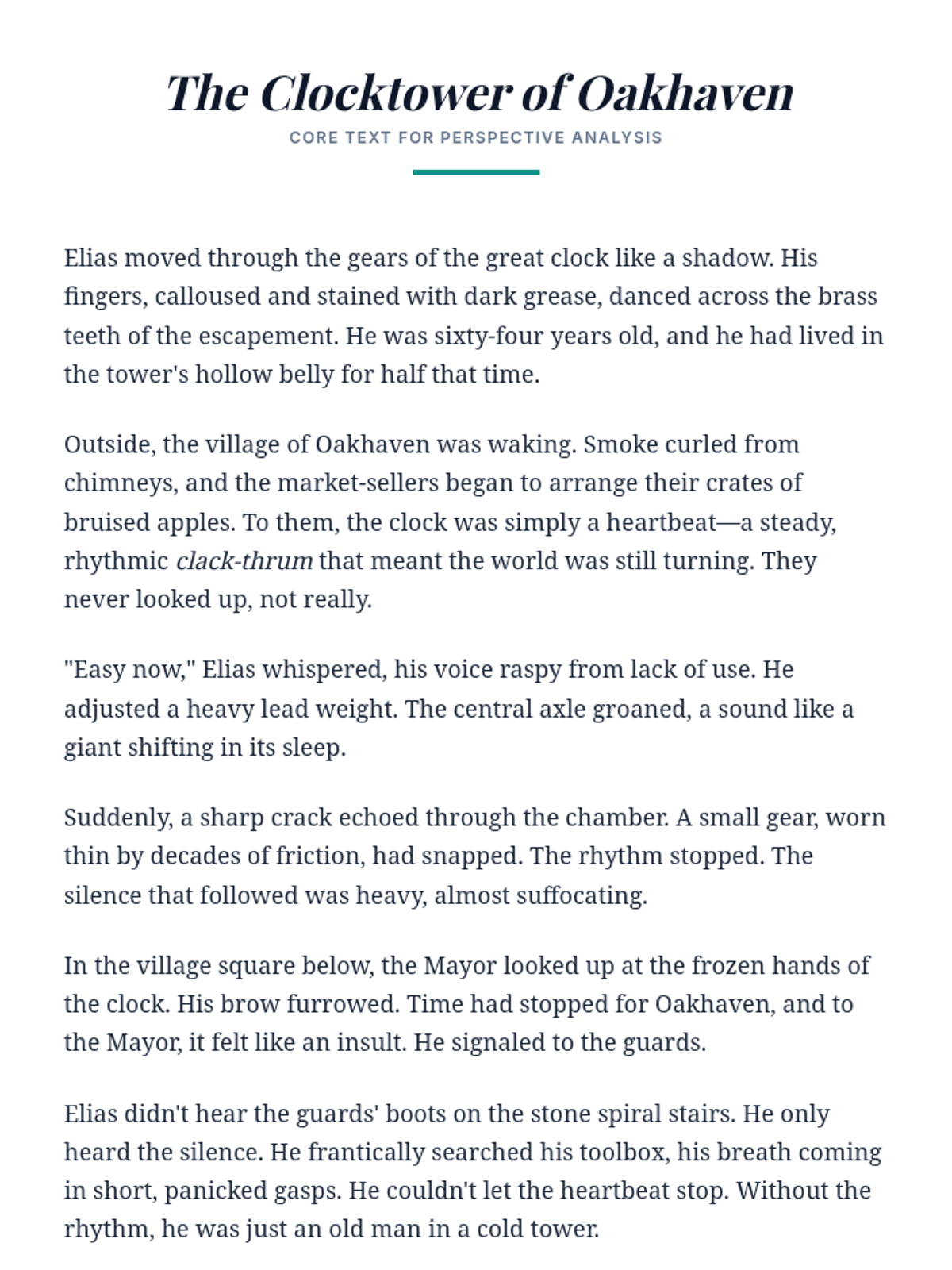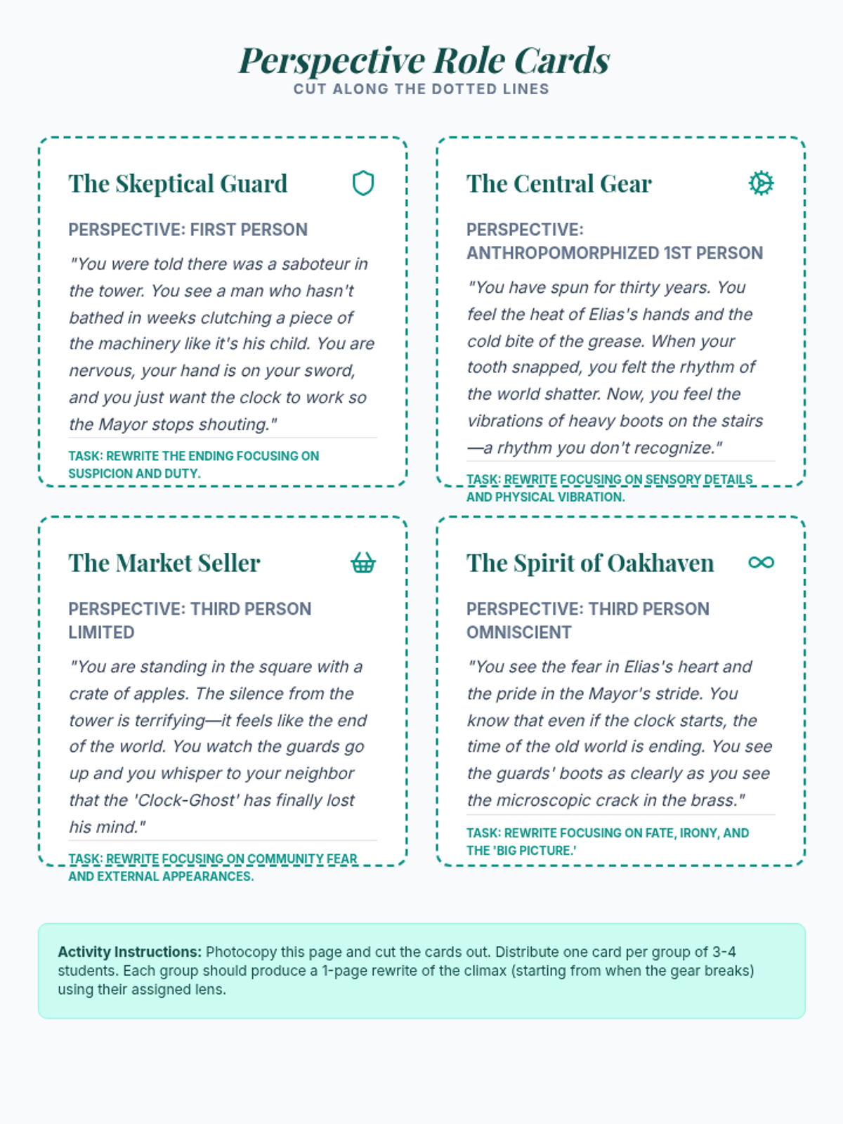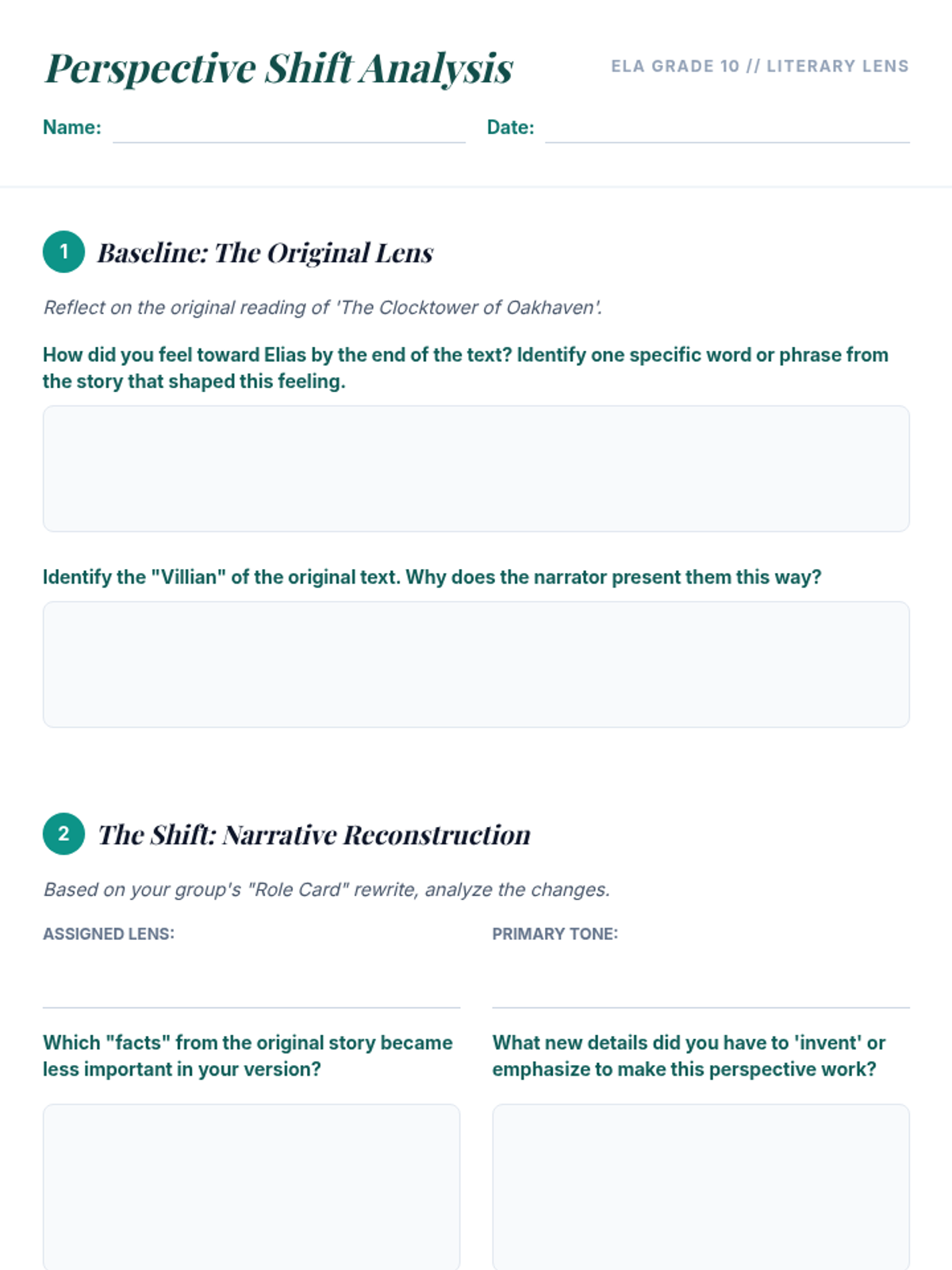 A 10th-grade ELA lesson exploring how narrative perspective shapes reader understanding. Students analyze a core text and experiment with rewriting scenes from diverse viewpoints to uncover hidden emotional layers and thematic shifts.