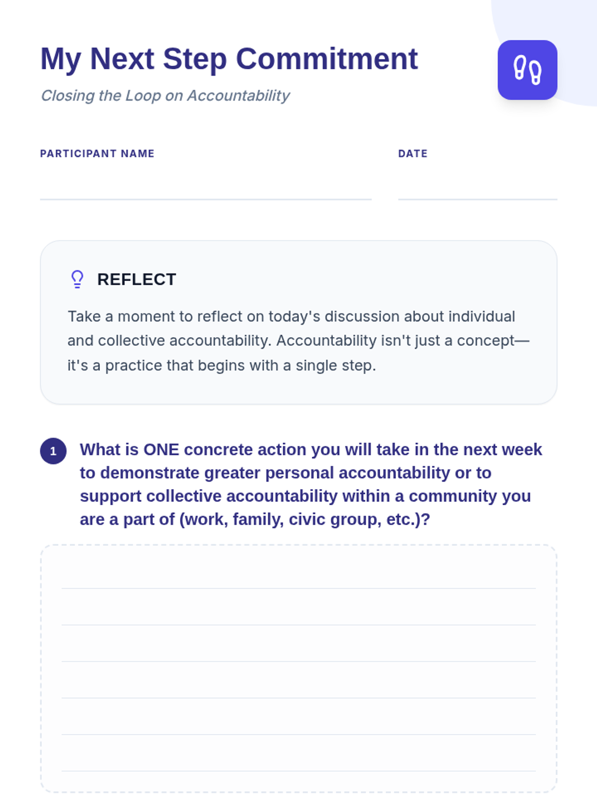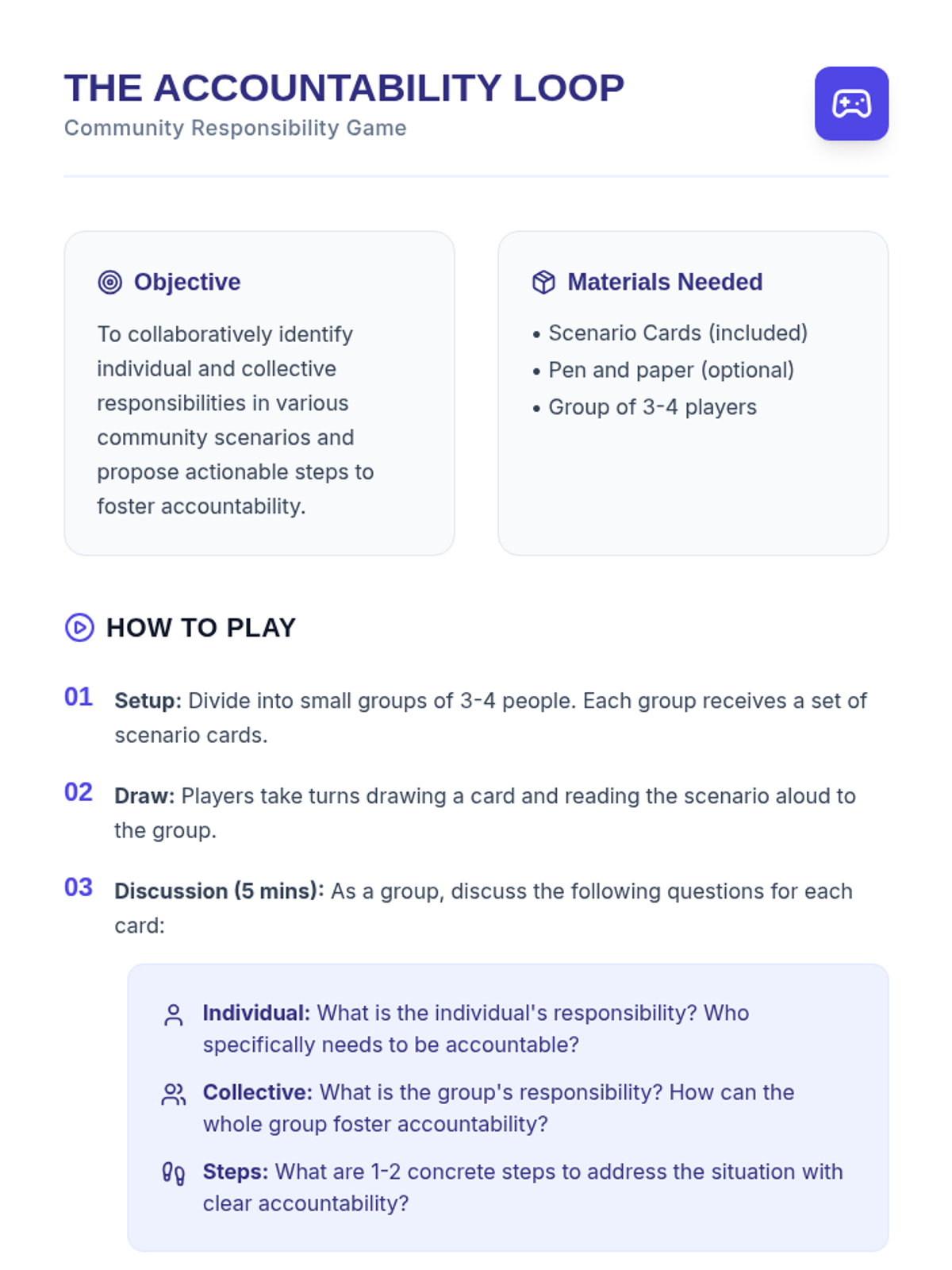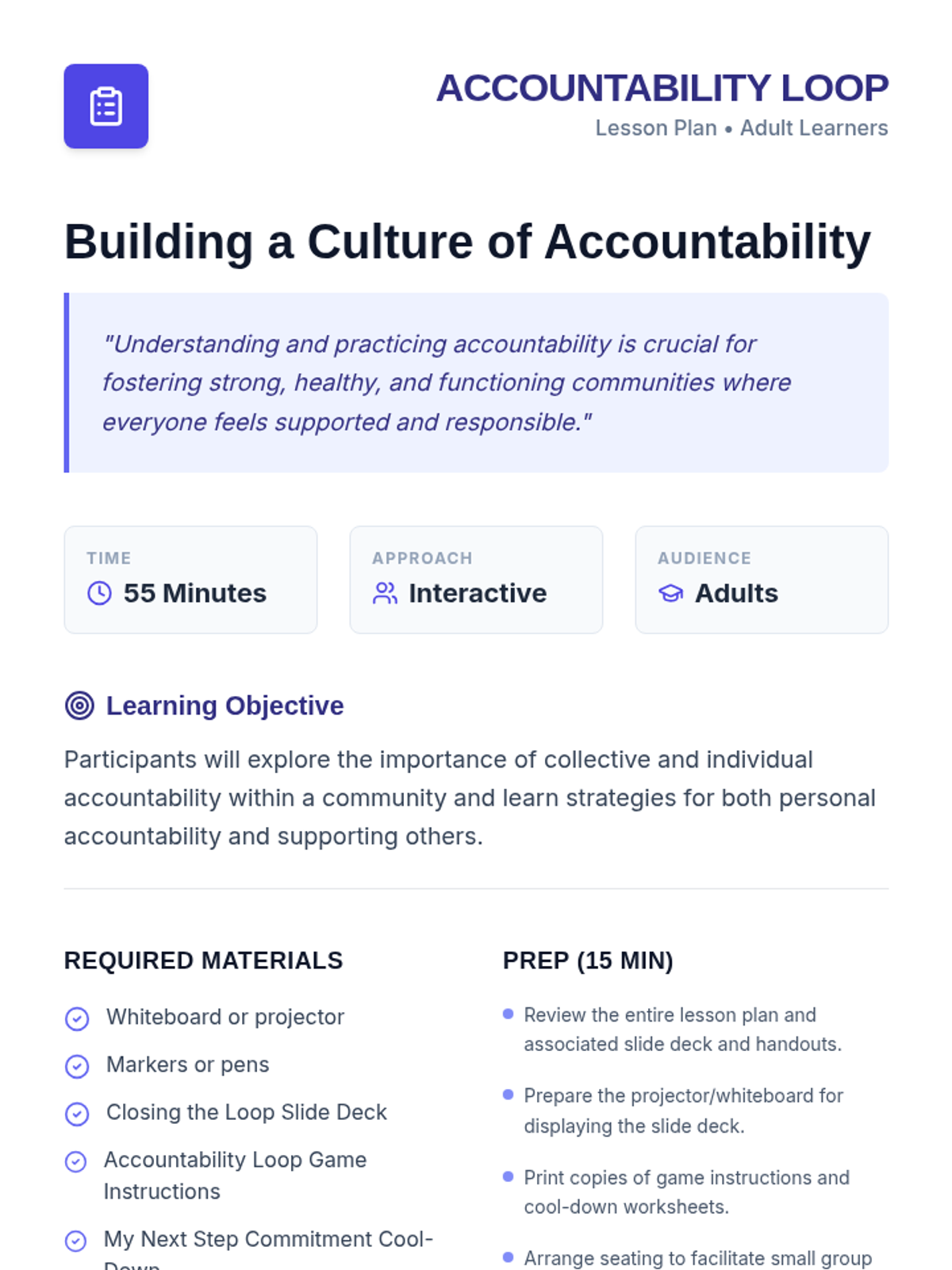 A 55-minute interactive session for adult learners focused on individual and collective accountability within communities. Participants explore definitions, engage in a scenario-based game, and commit to personal actions for community health.