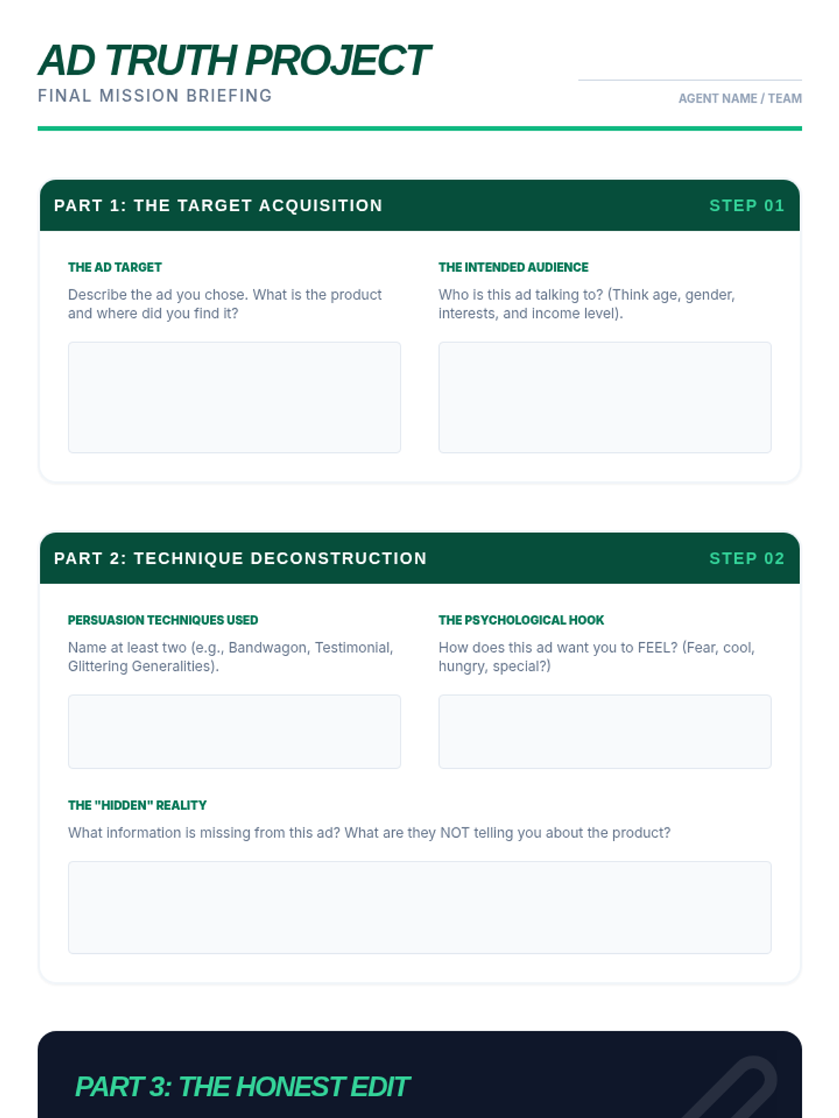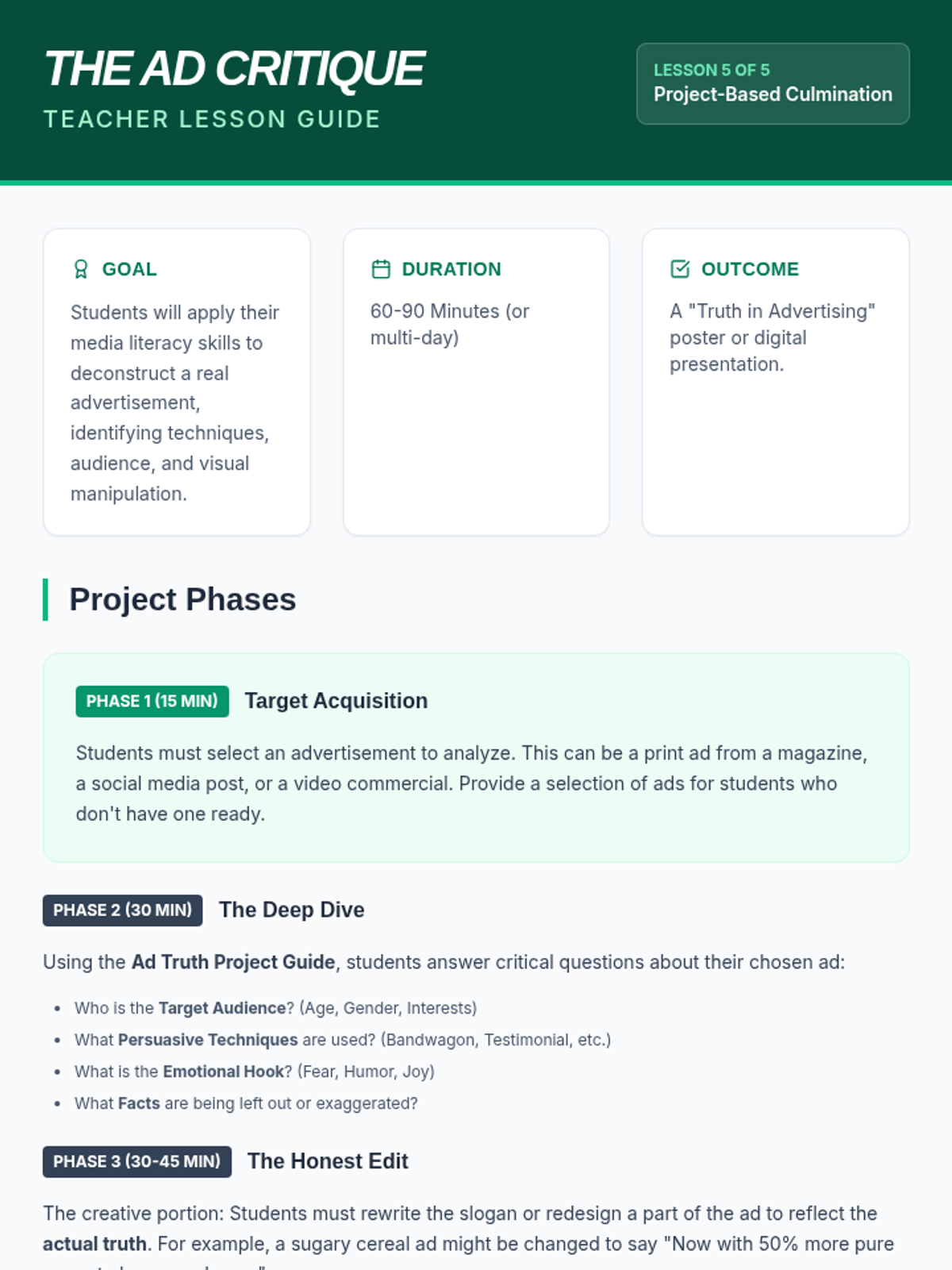 A culminating project where students select, analyze, and critique a real-world advertisement using the skills and terminology learned throughout the unit.
