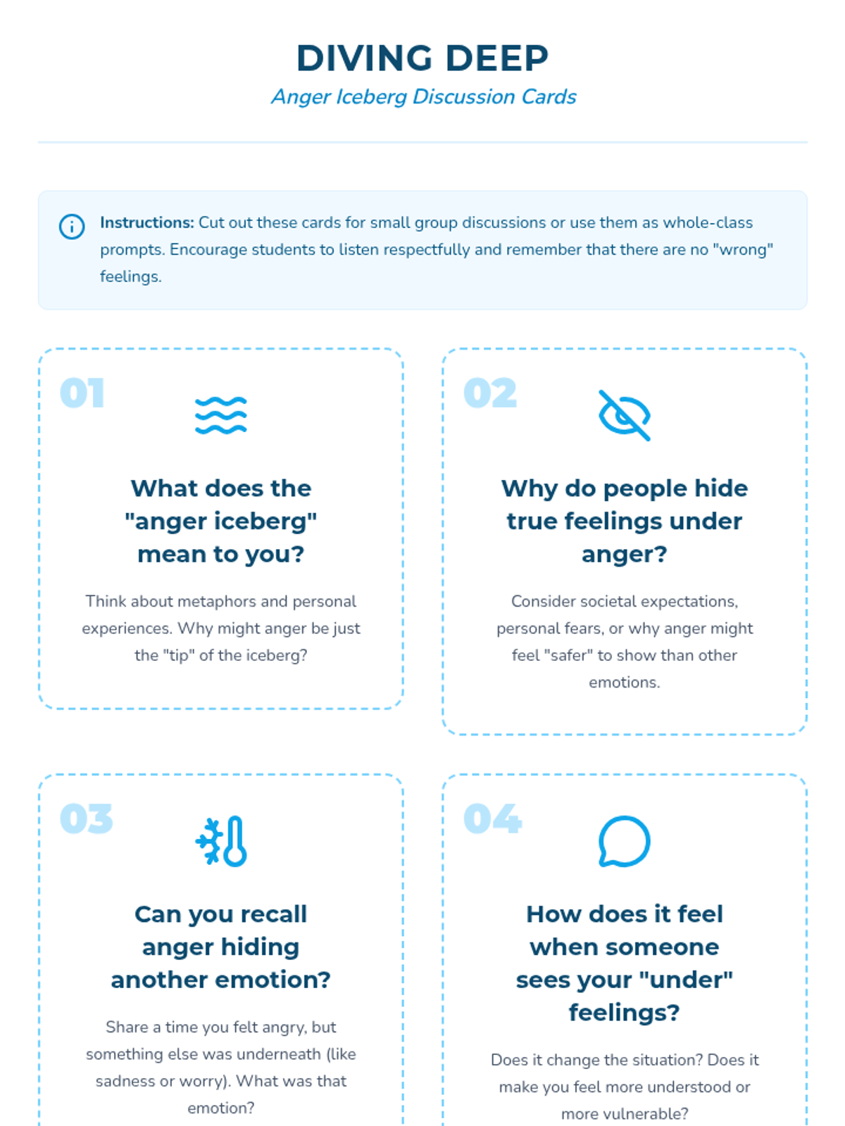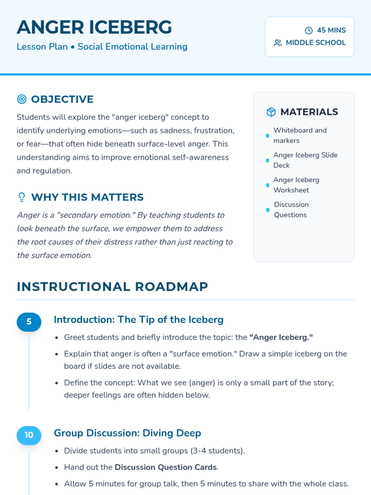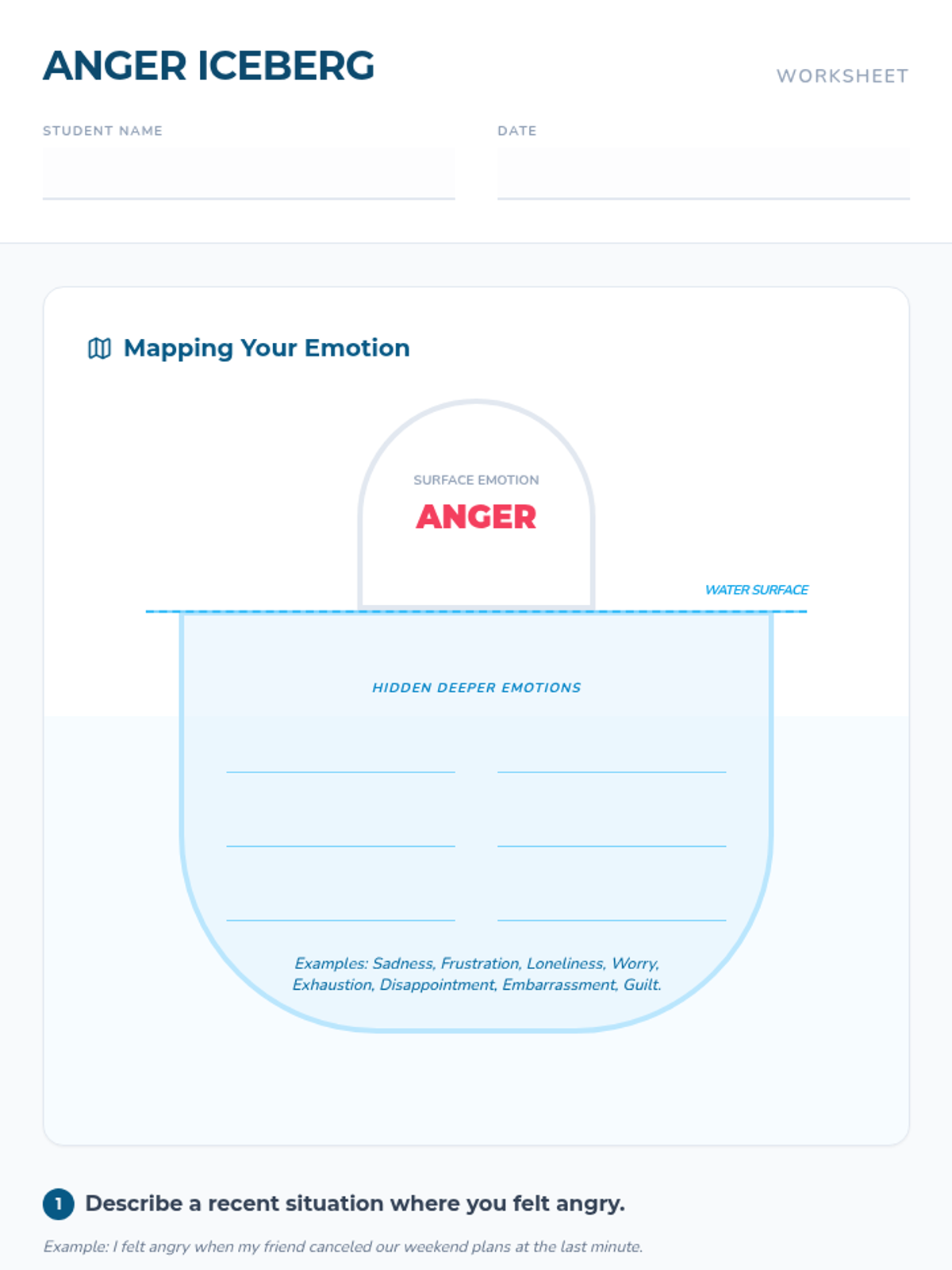 Students explore the 'anger iceberg' concept, identifying hidden emotions like sadness or frustration beneath surface-level anger to improve emotional regulation.