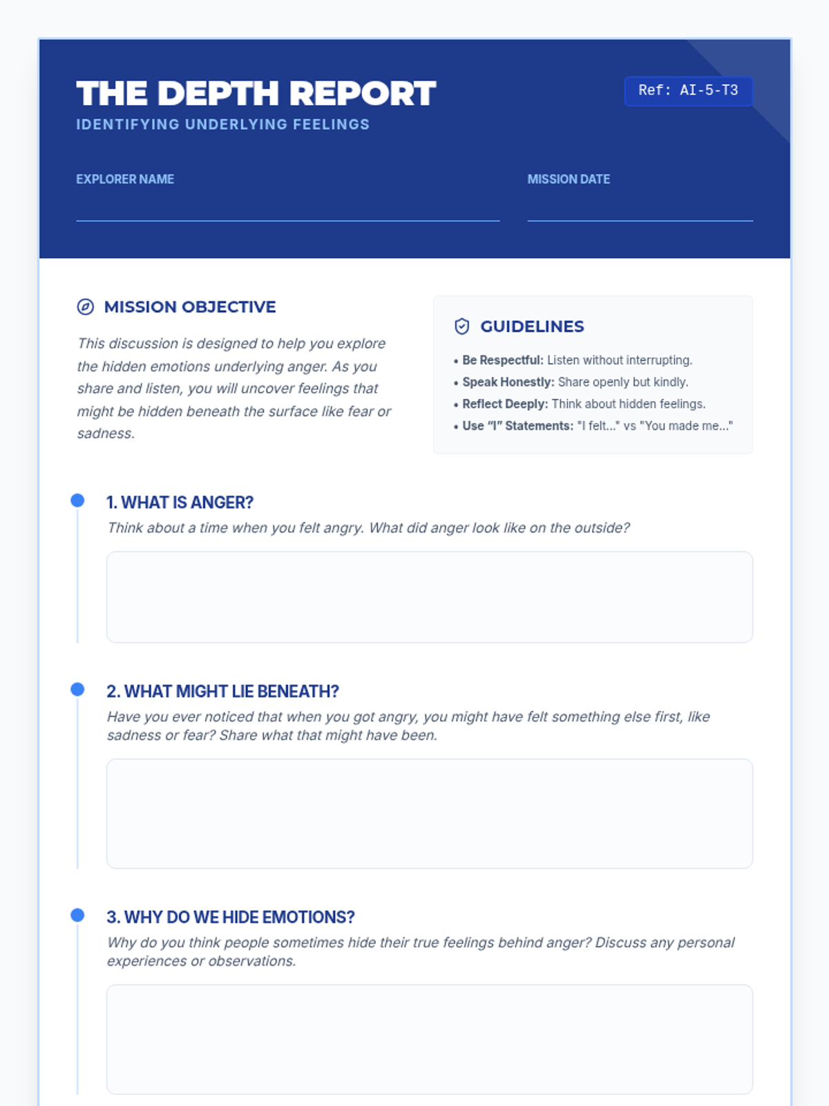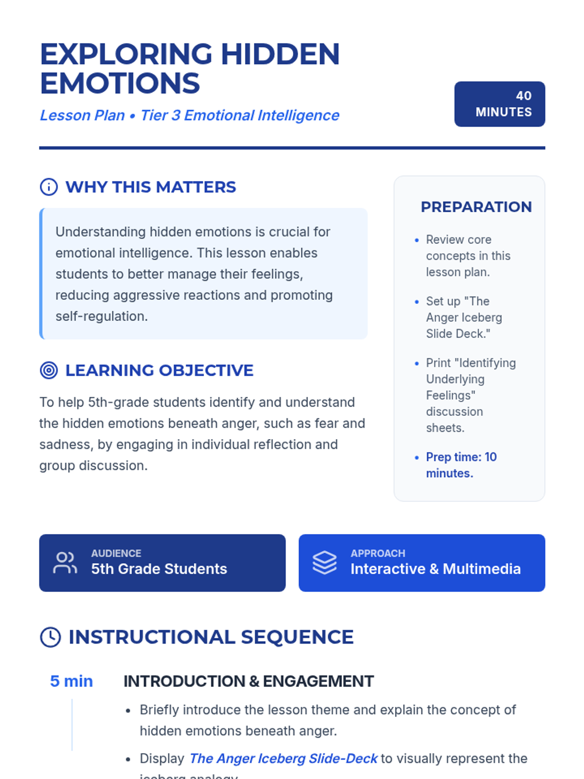 A Tier 3 intervention lesson for 5th graders to identify underlying emotions like fear and sadness beneath anger using the iceberg analogy. This 40-minute session helps students develop emotional intelligence and self-regulation skills.