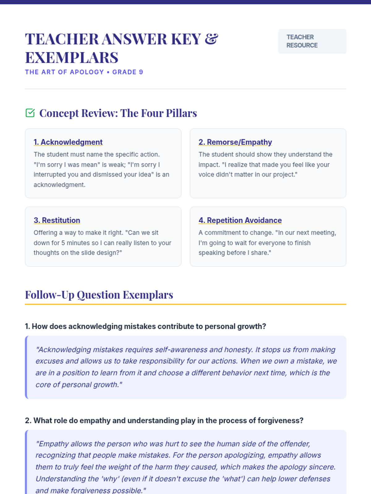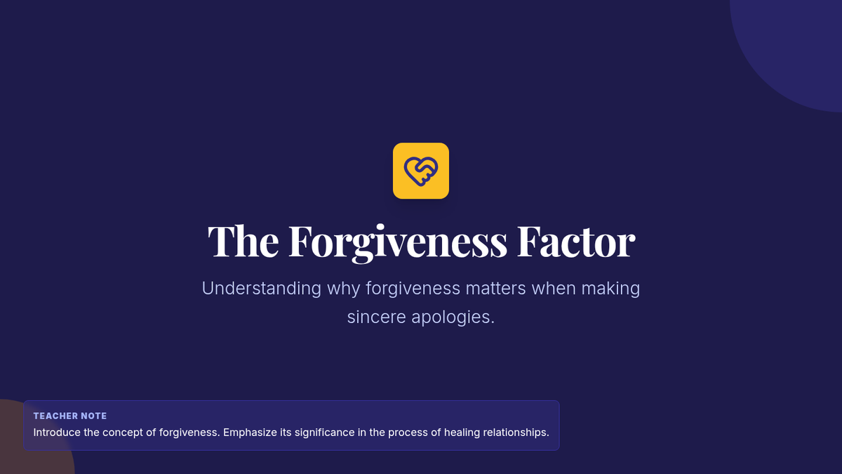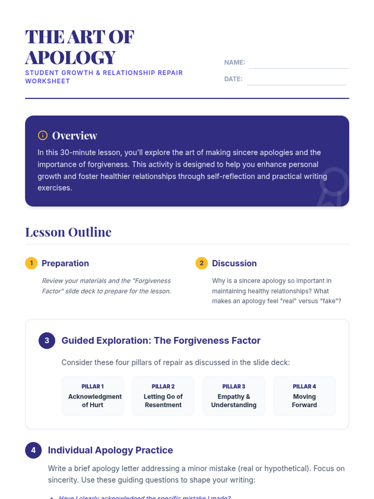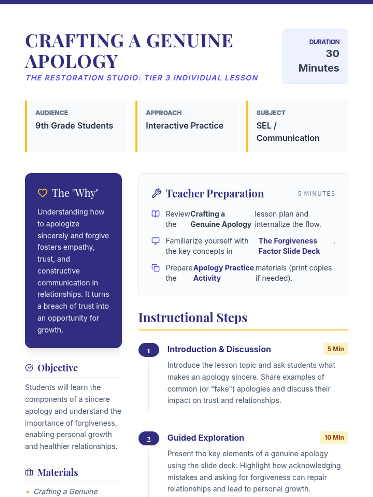 An individual Tier 3 lesson for 9th-grade students focusing on the mechanics of a sincere apology and the transformative power of forgiveness in relationship repair.