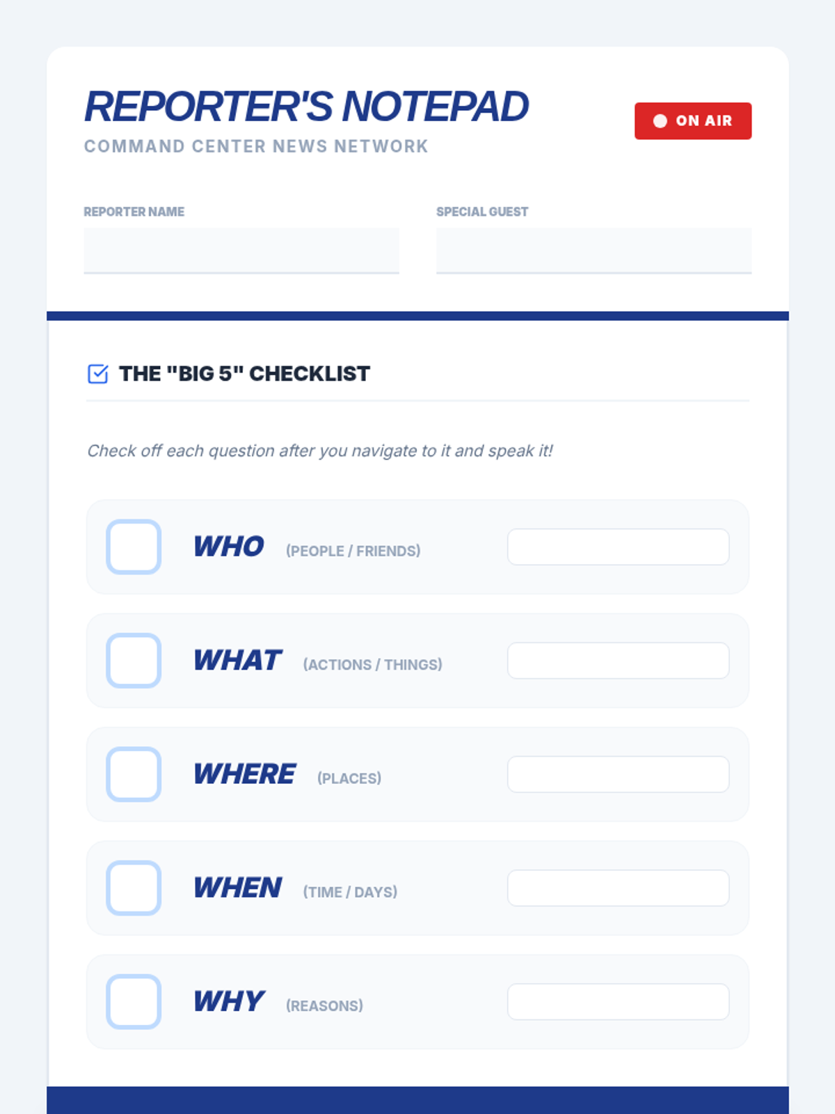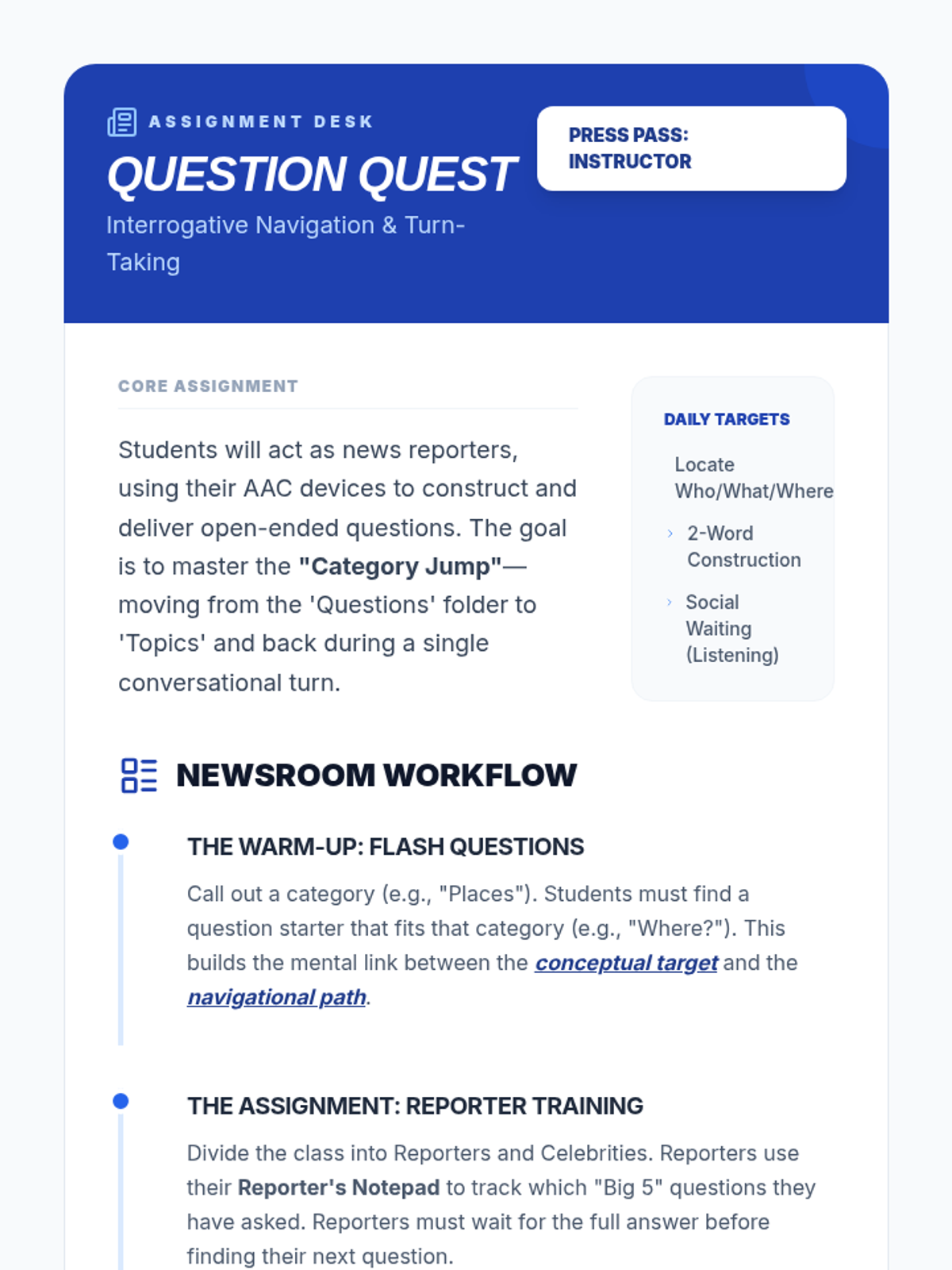 Focusing on the 'Question' words (Who, What, Where, When, Why), students participate in an interview activity. They must navigate back and forth between question starters and topic words to gather information from a peer.