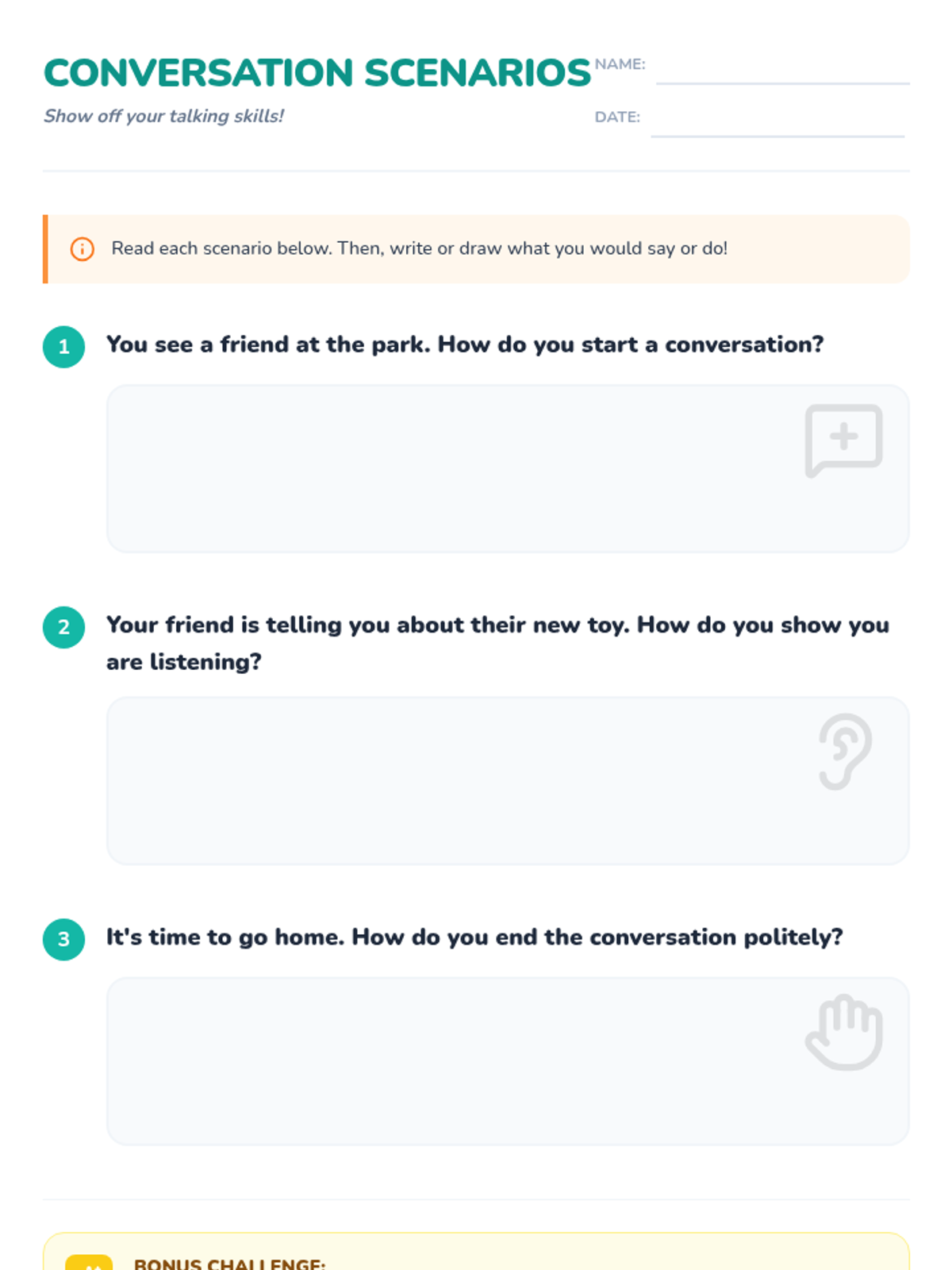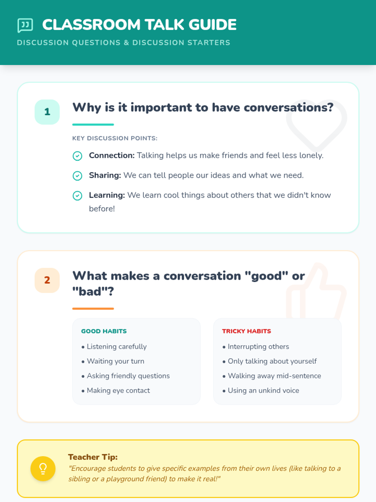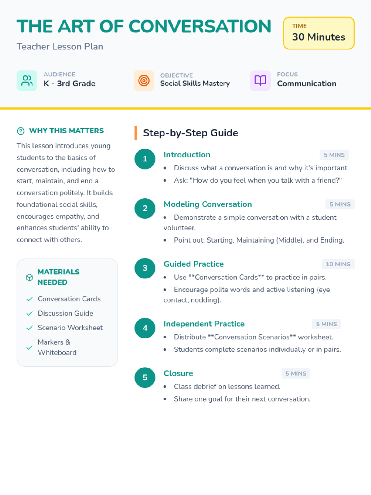A foundational lesson for K-3 students on starting, maintaining, and ending conversations politely using a speech-bubble theme.