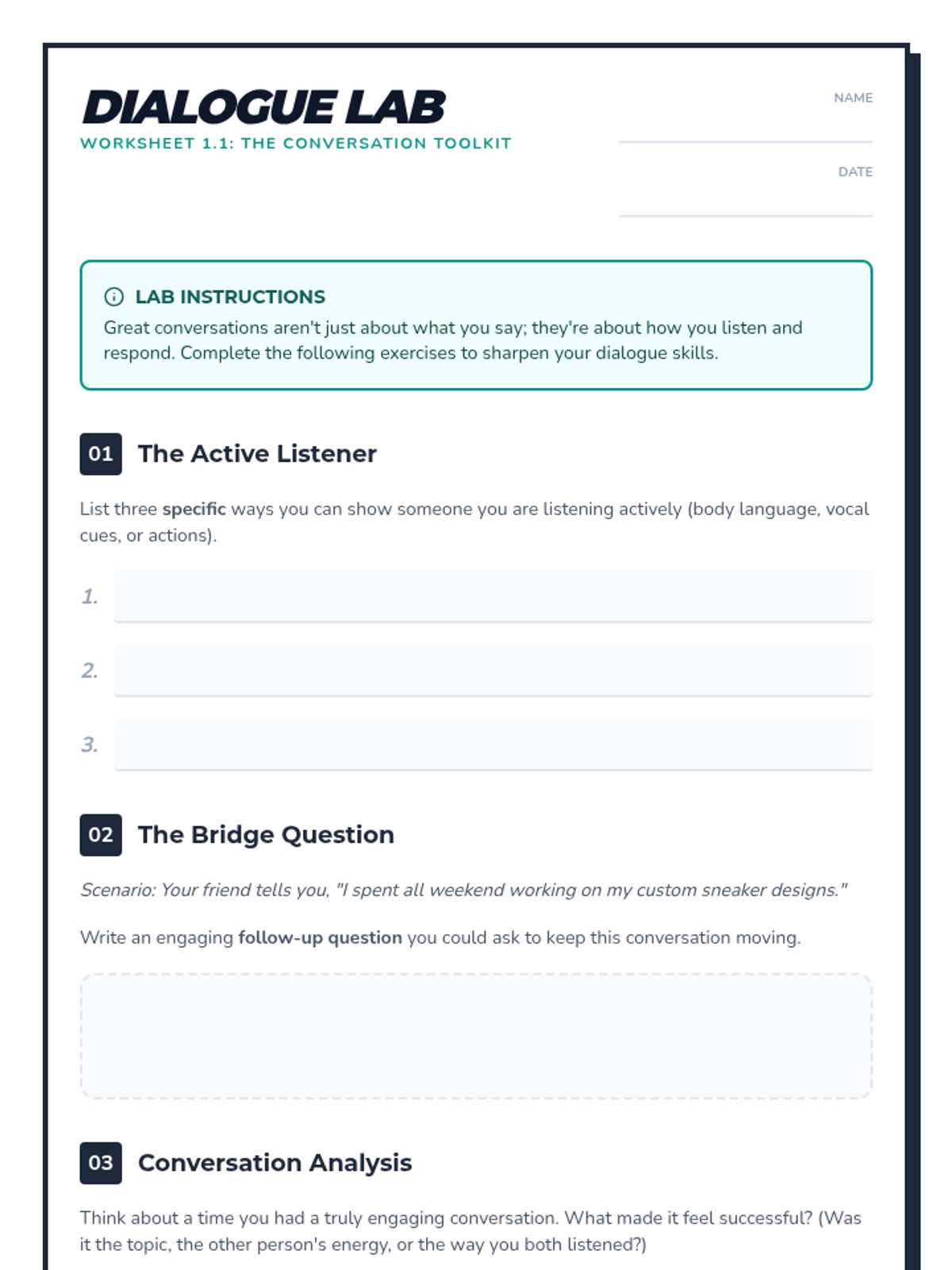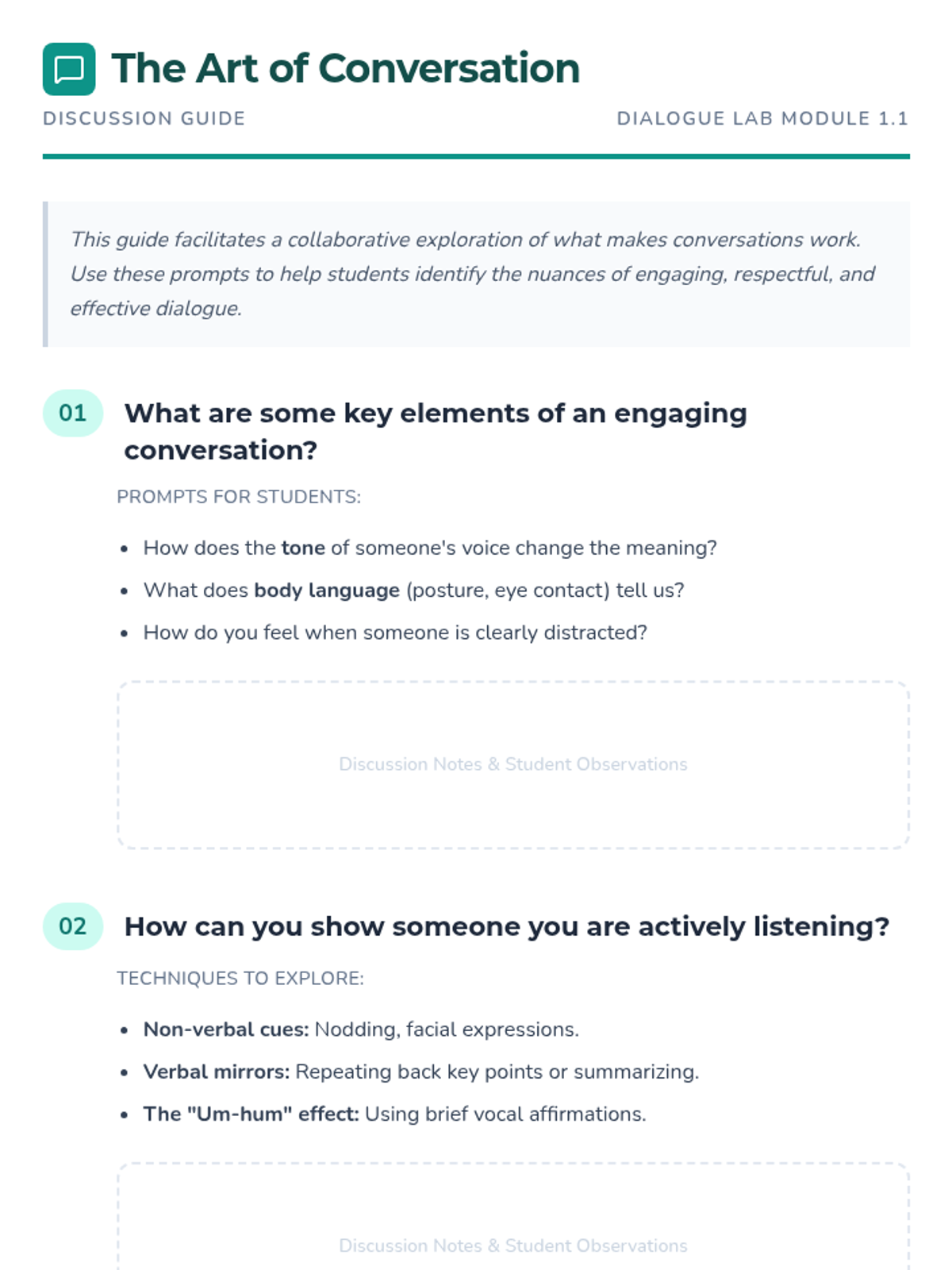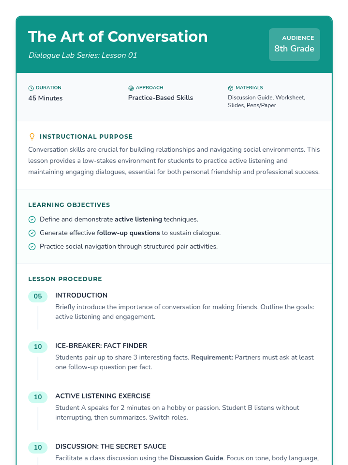 A lesson designed for 8th-grade students to practice and improve their conversation skills through active listening, ice-breakers, and engaging dialogue strategies.
