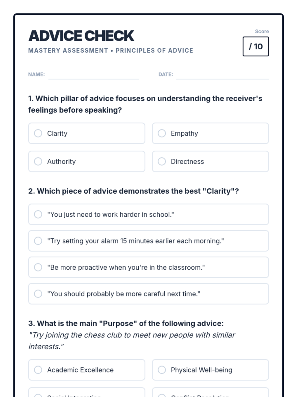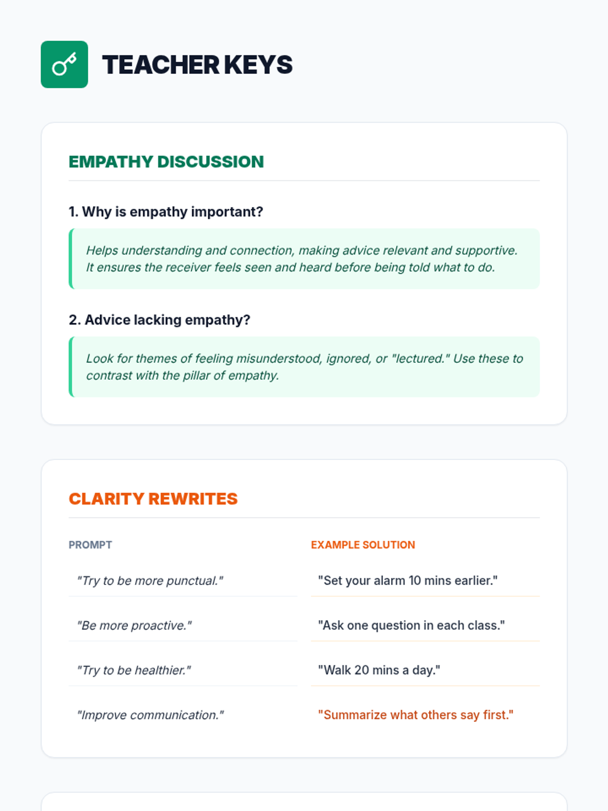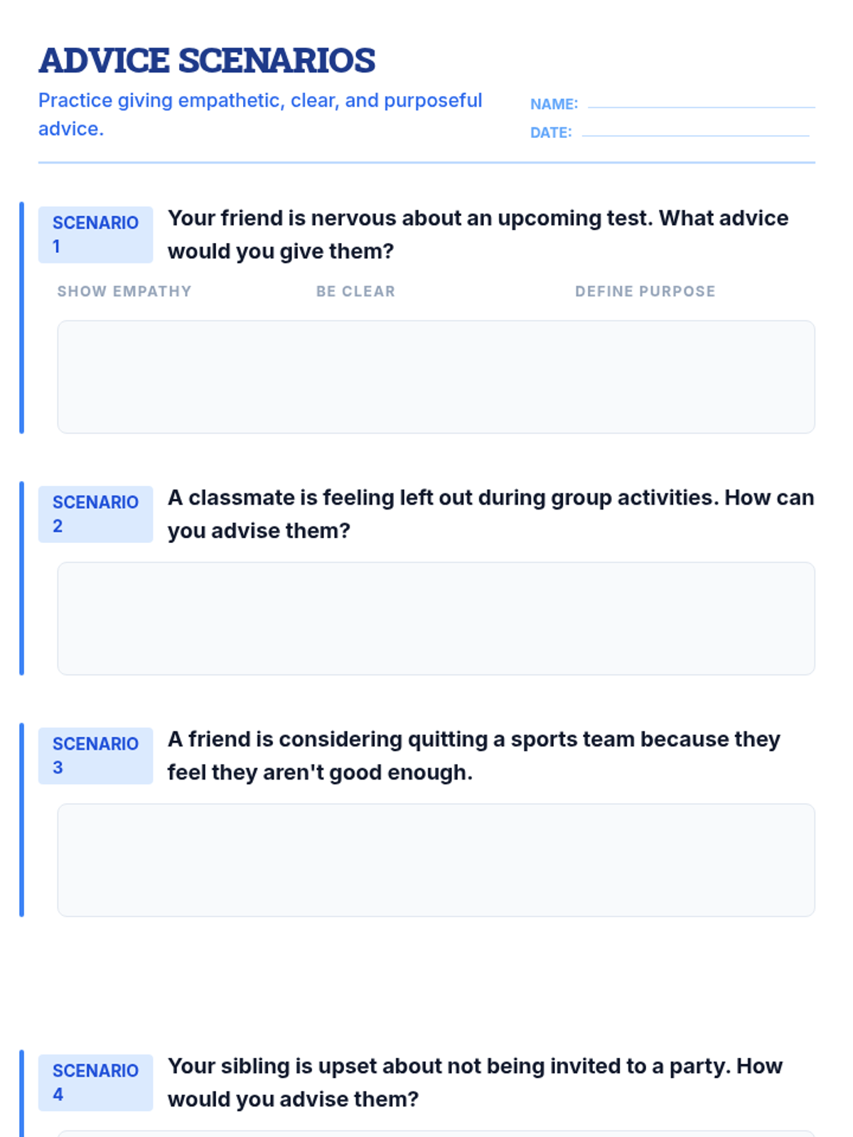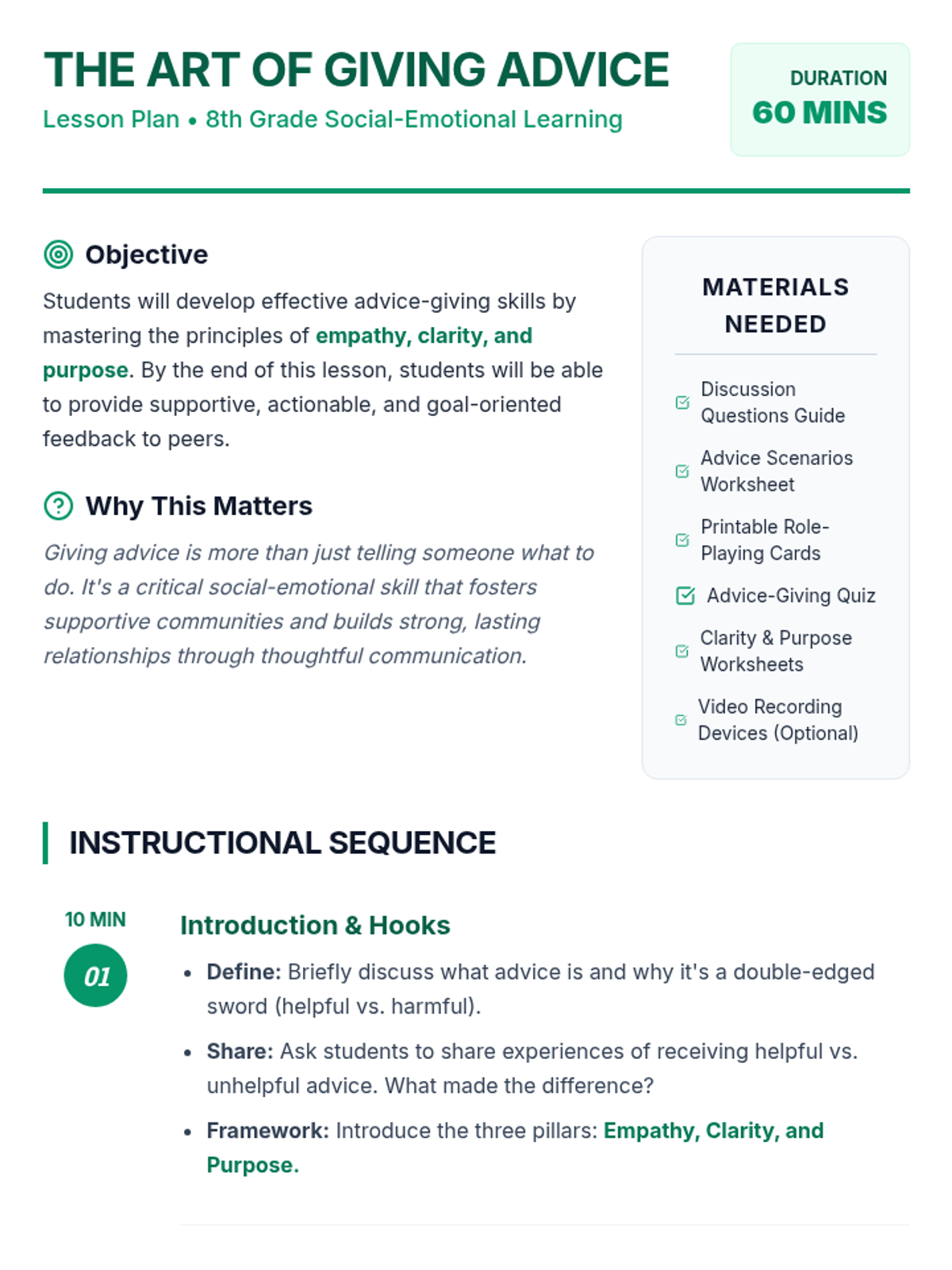 A comprehensive 8th-grade lesson focusing on the principles of effective advice: empathy, clarity, and purpose. Students practice these skills through scenario analysis, role-playing, and creative projects.