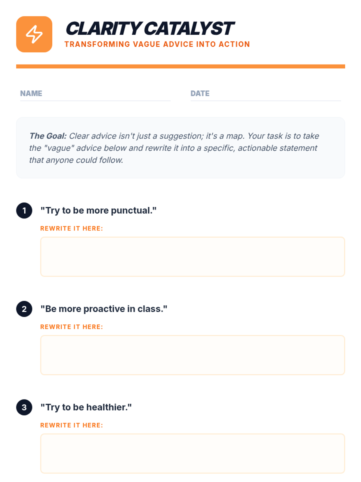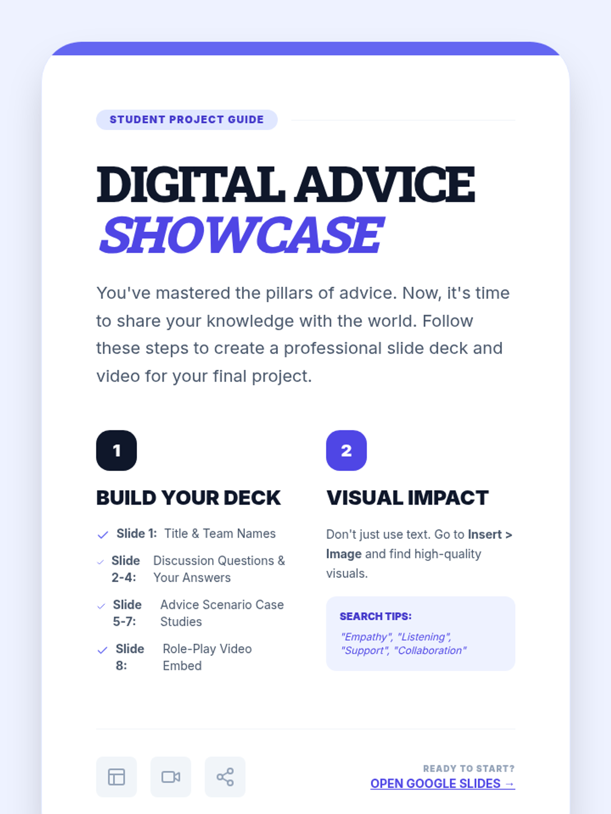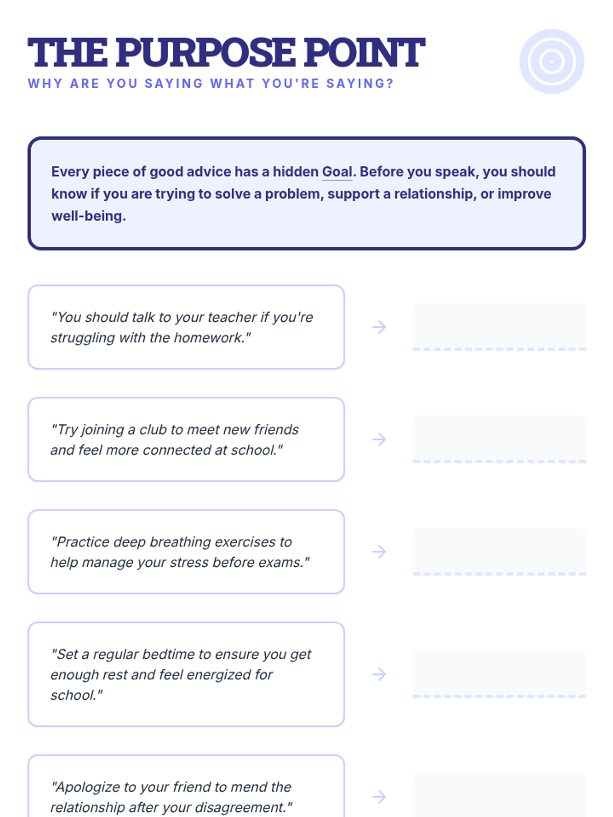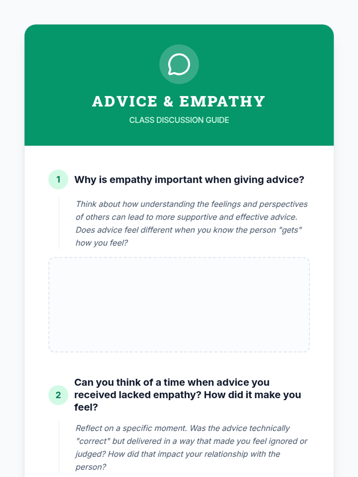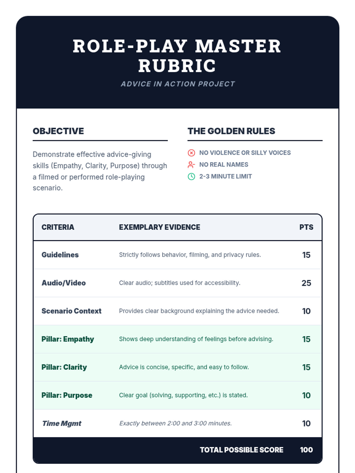 A comprehensive 8th-grade lesson focusing on the principles of effective advice: empathy, clarity, and purpose. Students practice these skills through scenario analysis, role-playing, and creative projects.