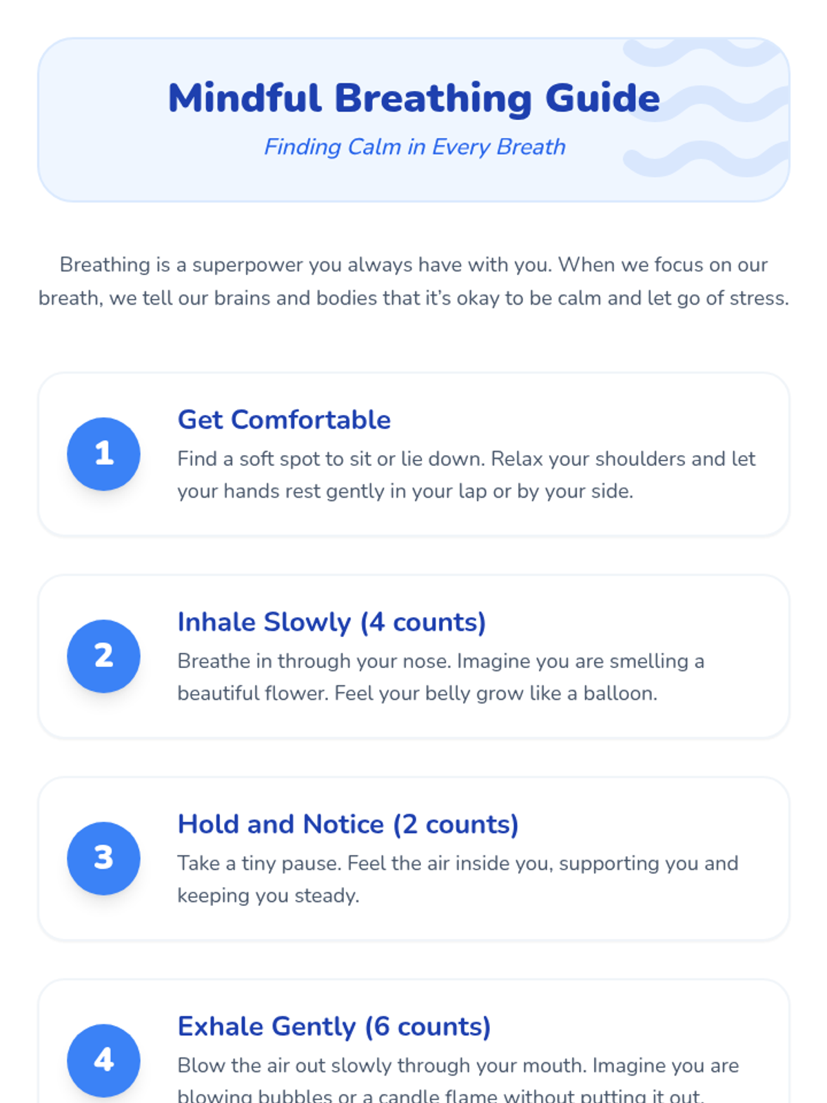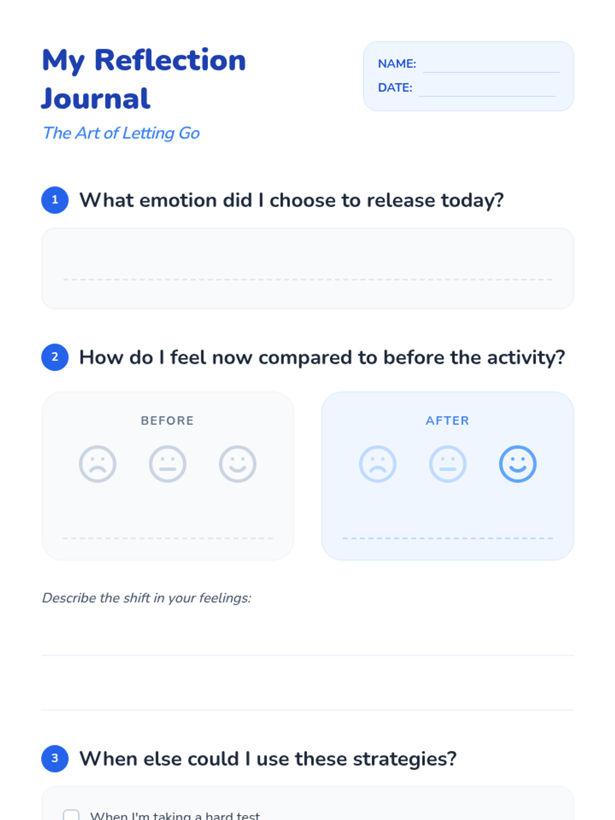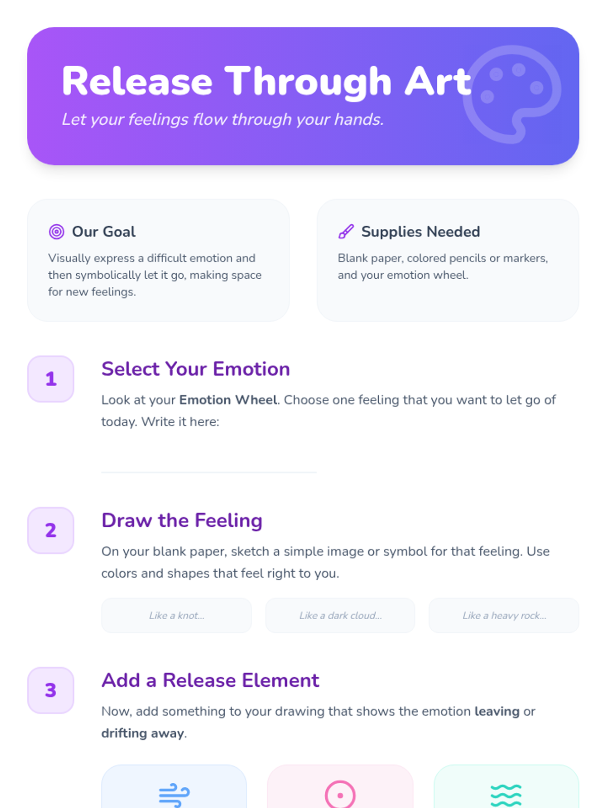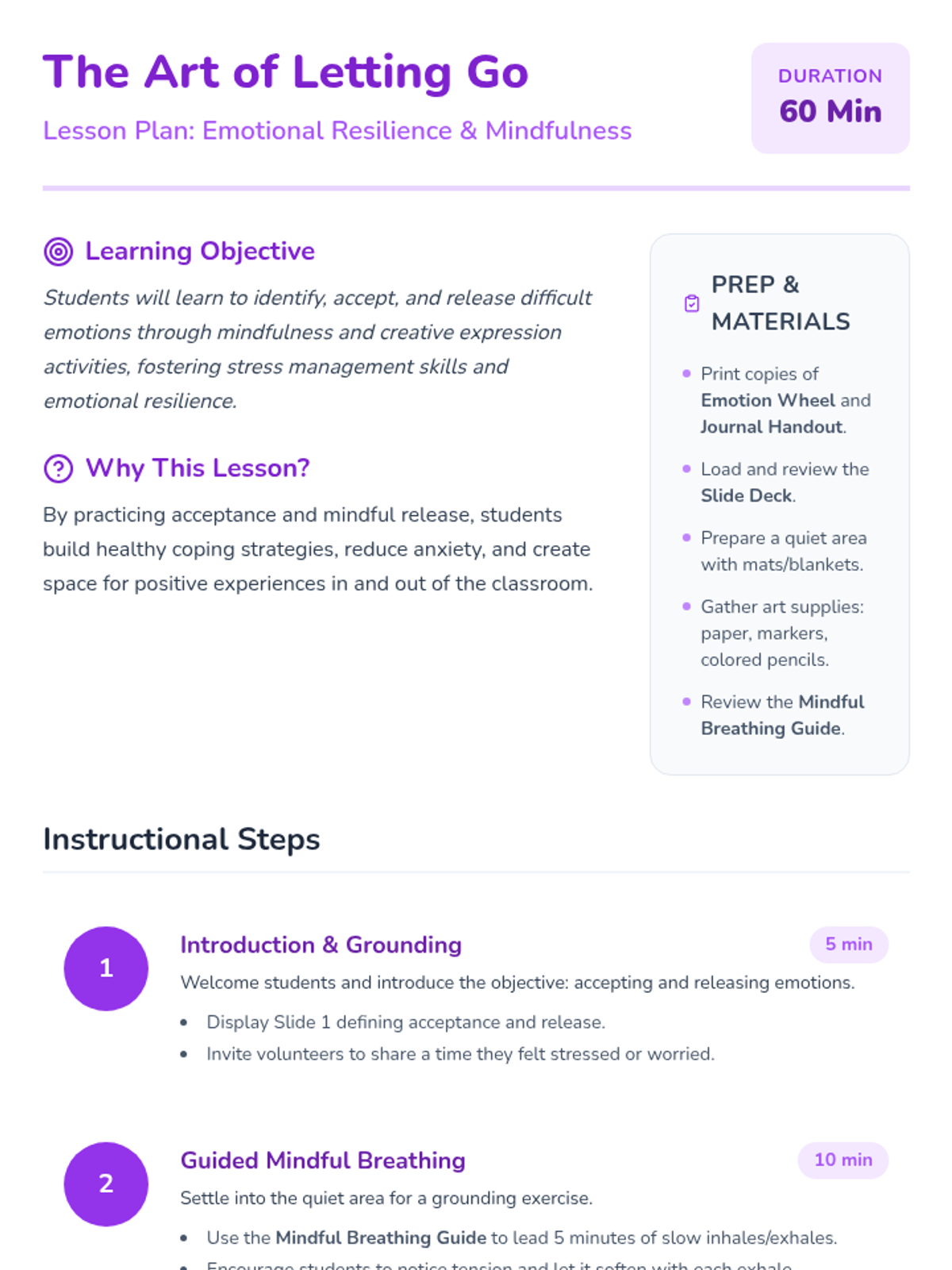 A mindfulness-based lesson where students learn to identify, accept, and release difficult emotions through guided breathing and creative art activities.