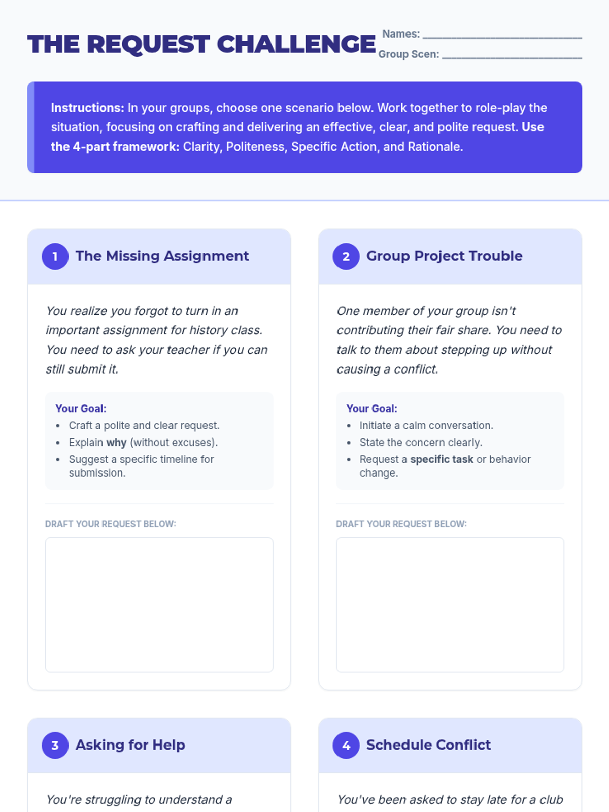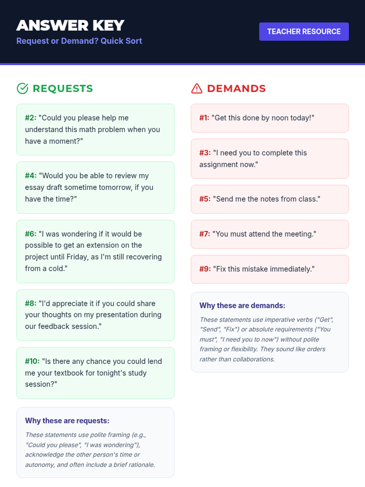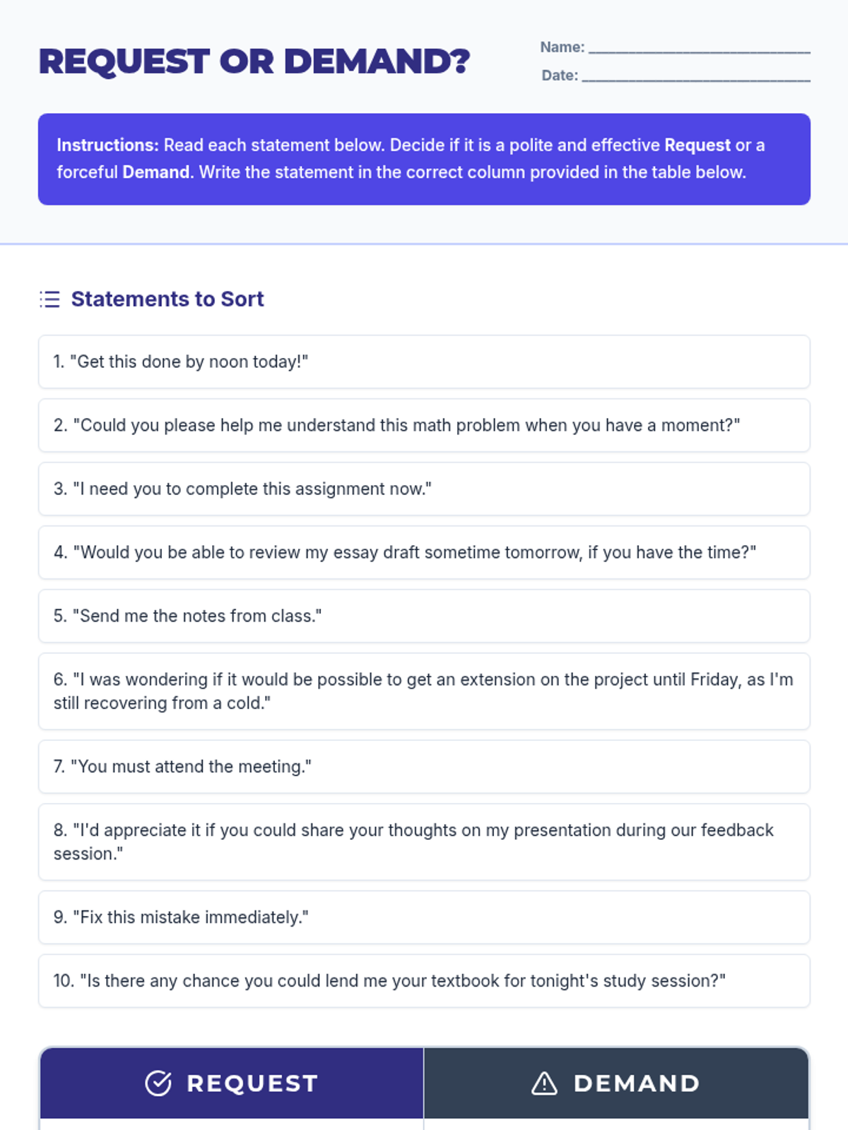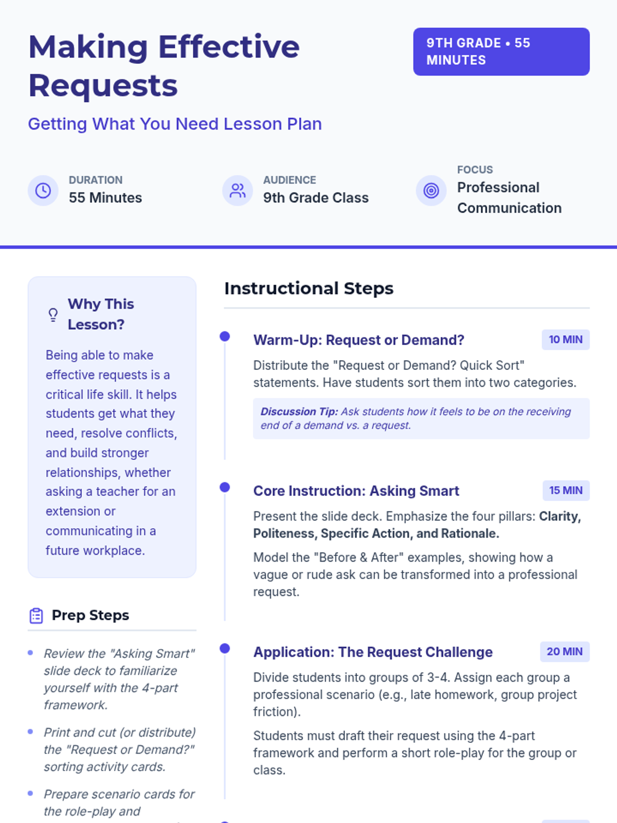 A 55-minute lesson for 9th graders on the art of making professional, clear, and polite requests. Includes a sorting activity, instructional slides, and role-playing scenarios to practice communication skills.