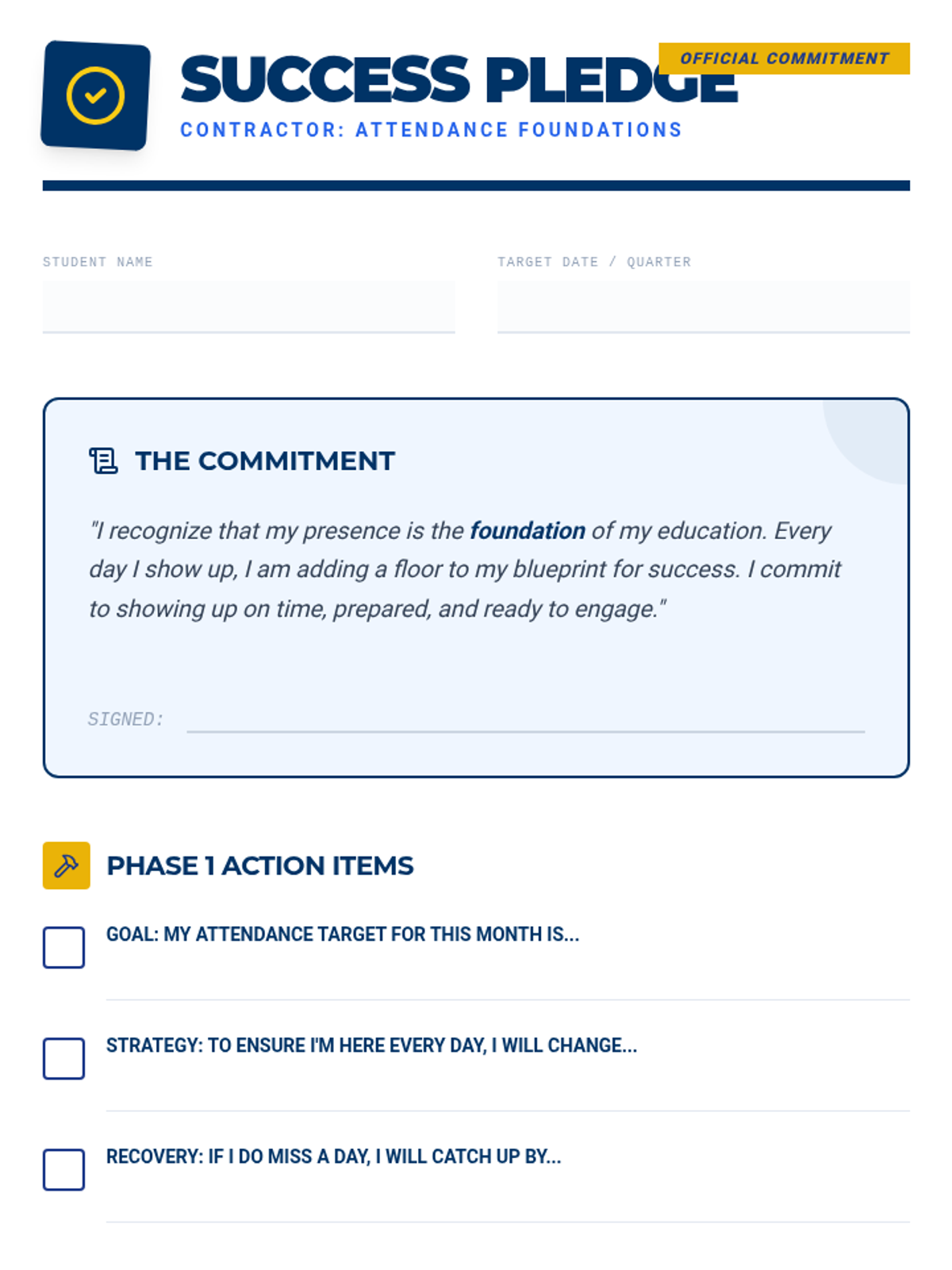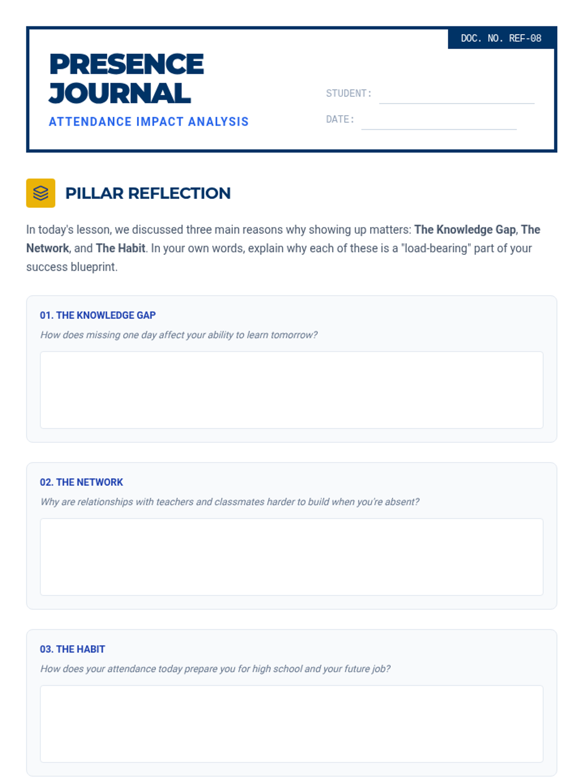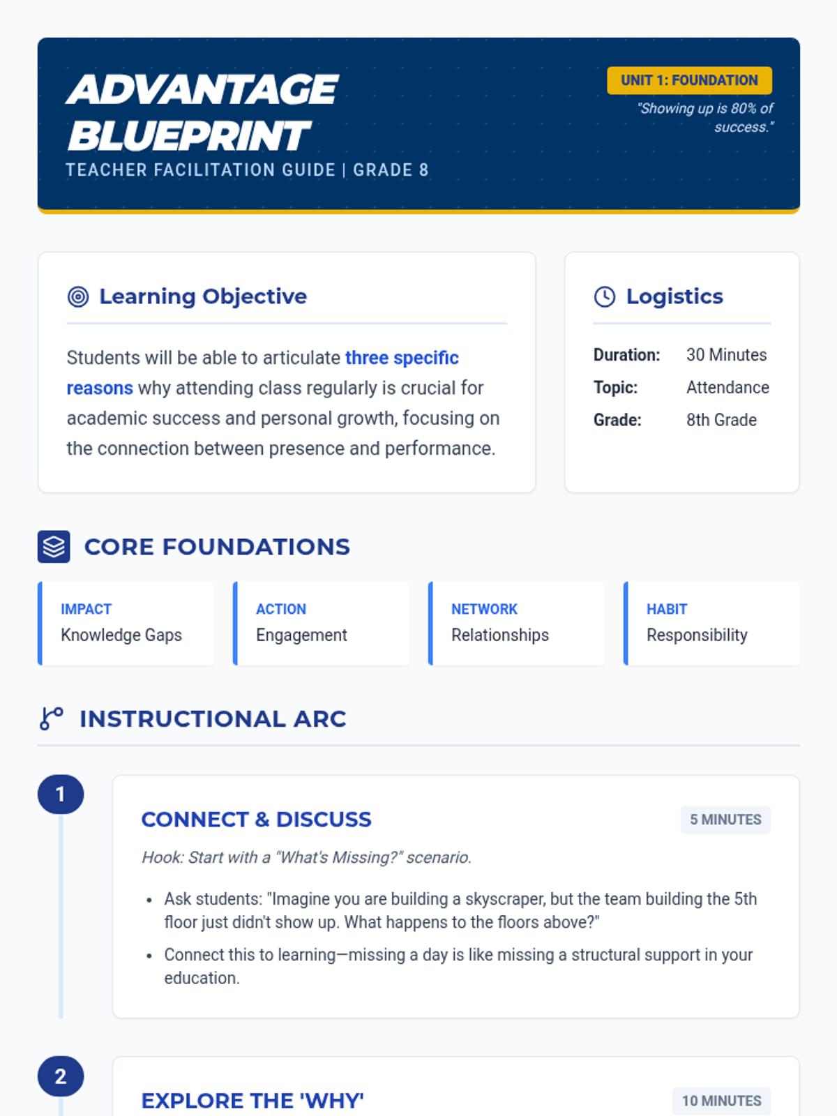 A comprehensive lesson designed for 8th graders to understand the critical link between regular school attendance, academic achievement, and personal responsibility through a 'blueprint' for success theme.