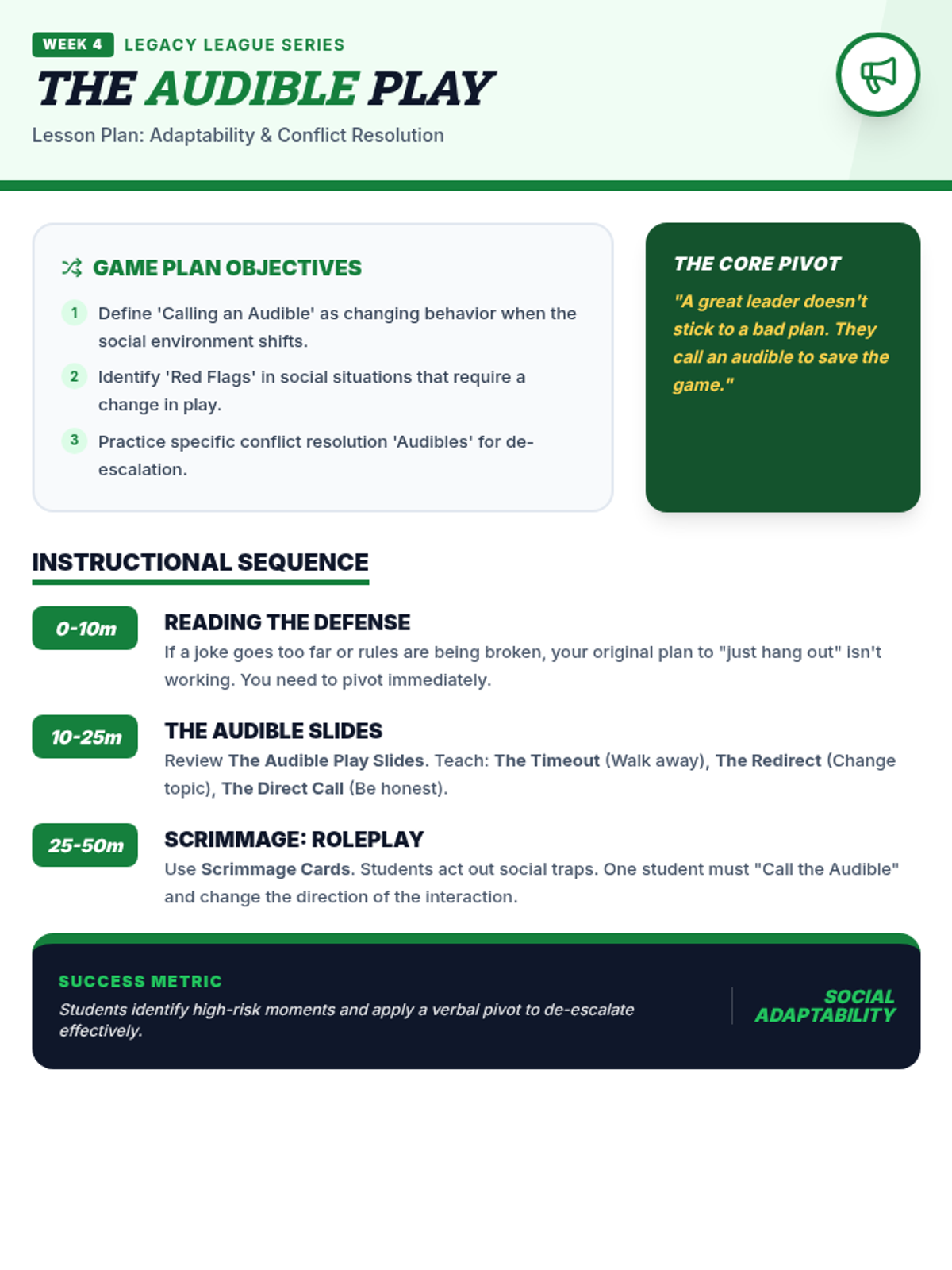 A lesson on social adaptability and conflict resolution. Students learn to 'call an audible' when a situation isn't going as planned, using problem-solving strategies to maintain their positive legacy.