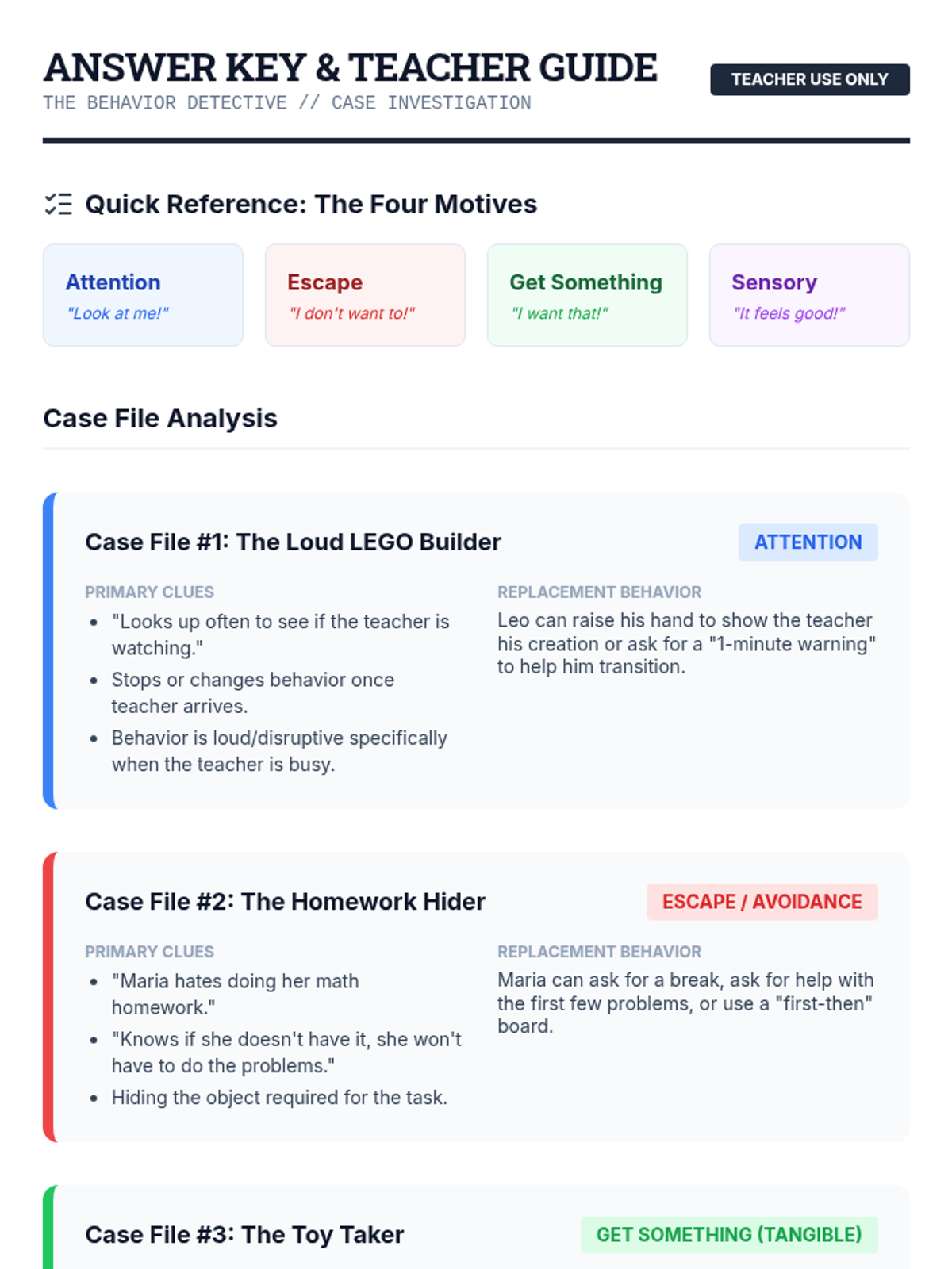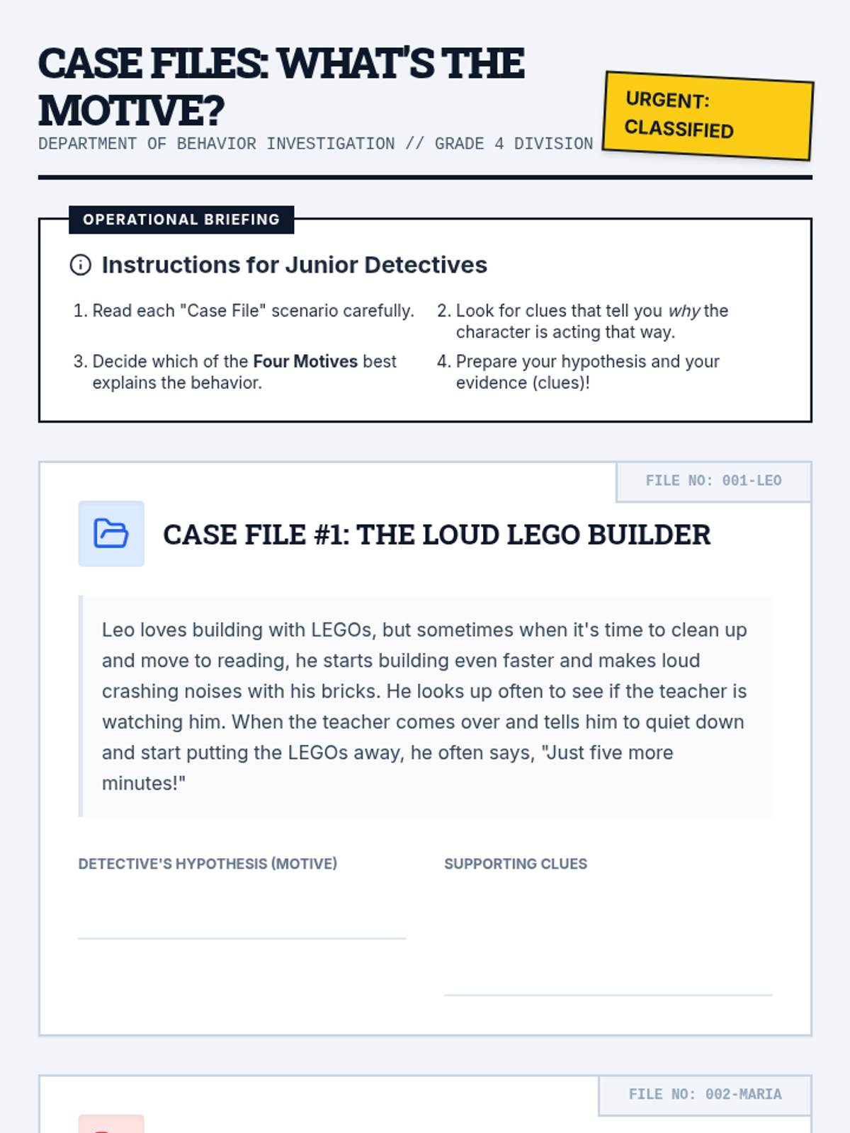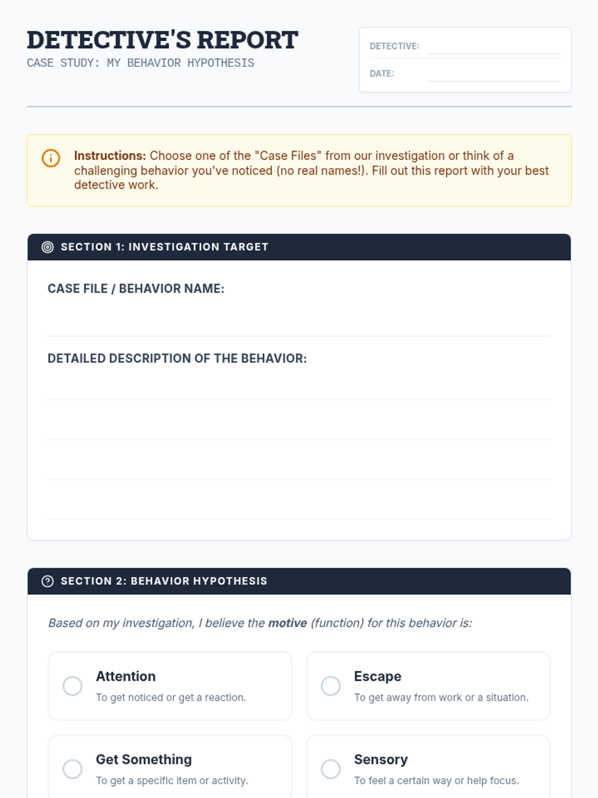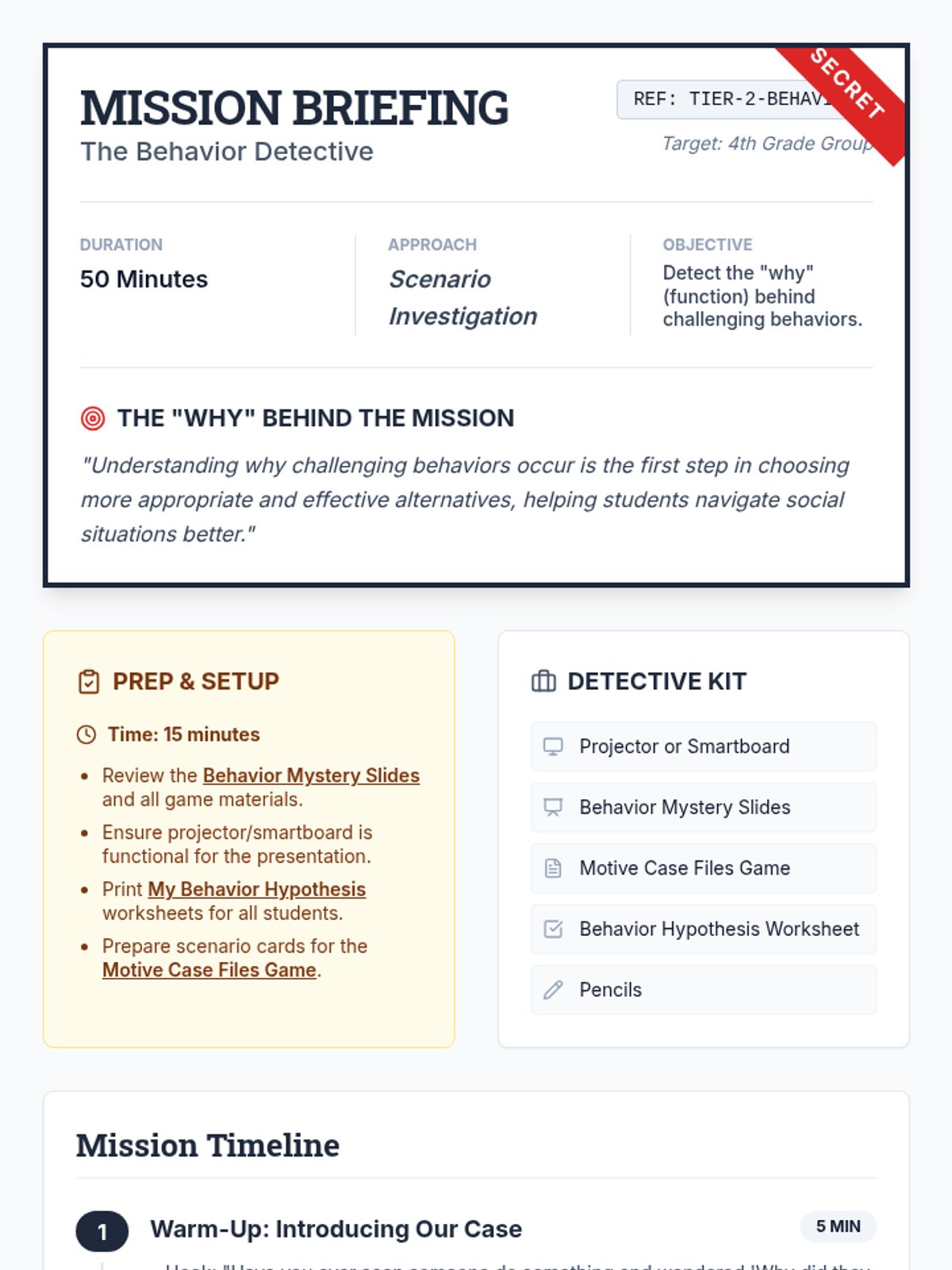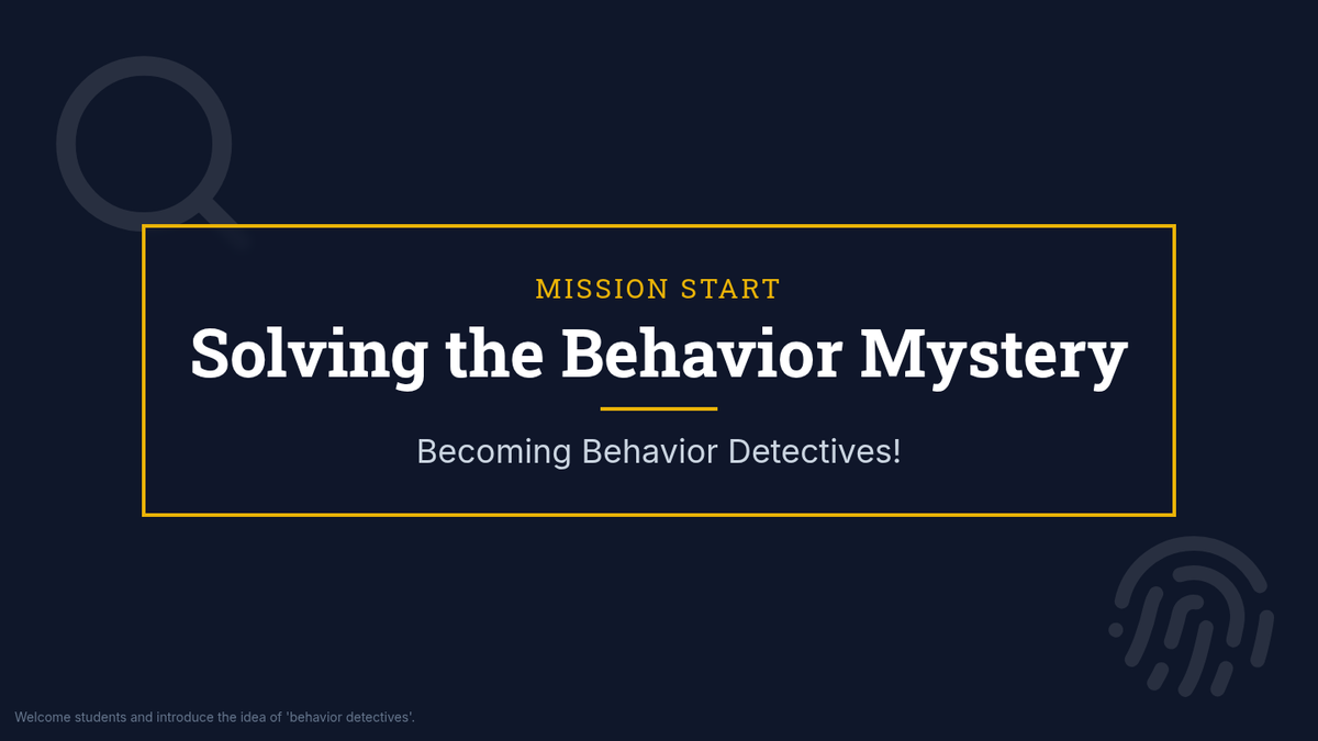 A detective-themed lesson for 4th graders to understand the four functions of behavior (Attention, Escape, Tangibles, Sensory) and learn how to identify the 'why' behind actions.