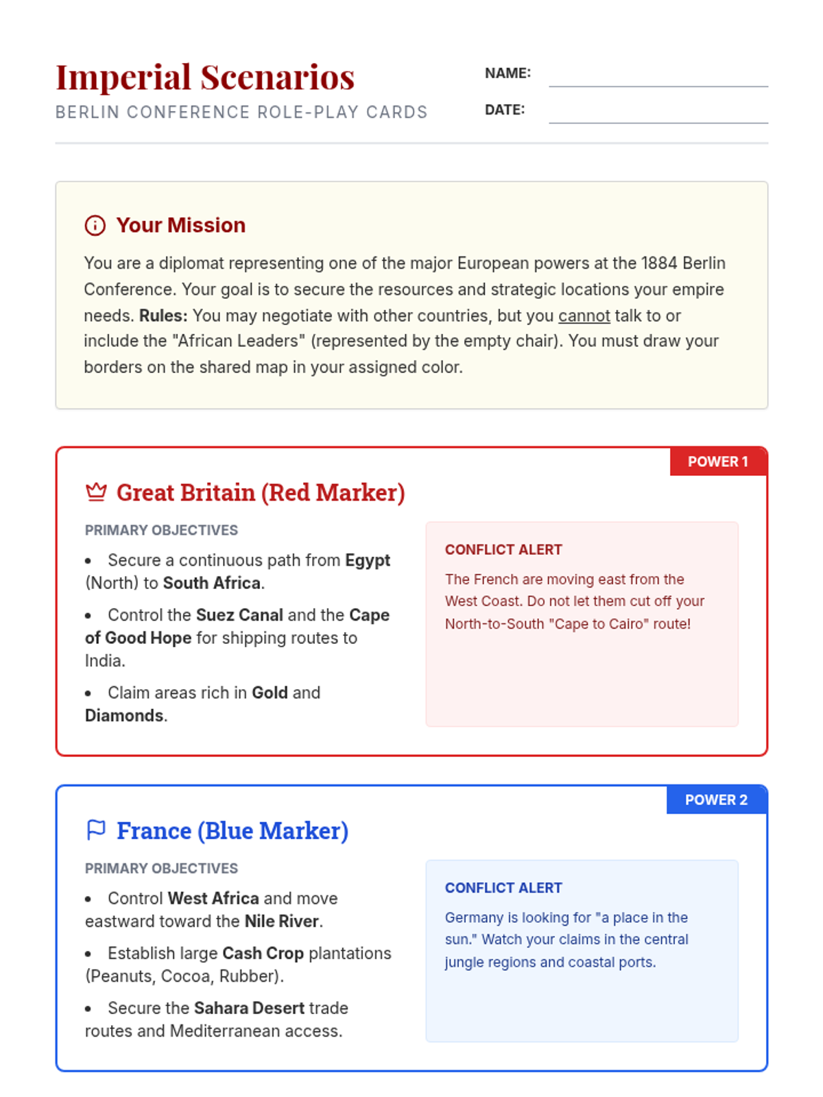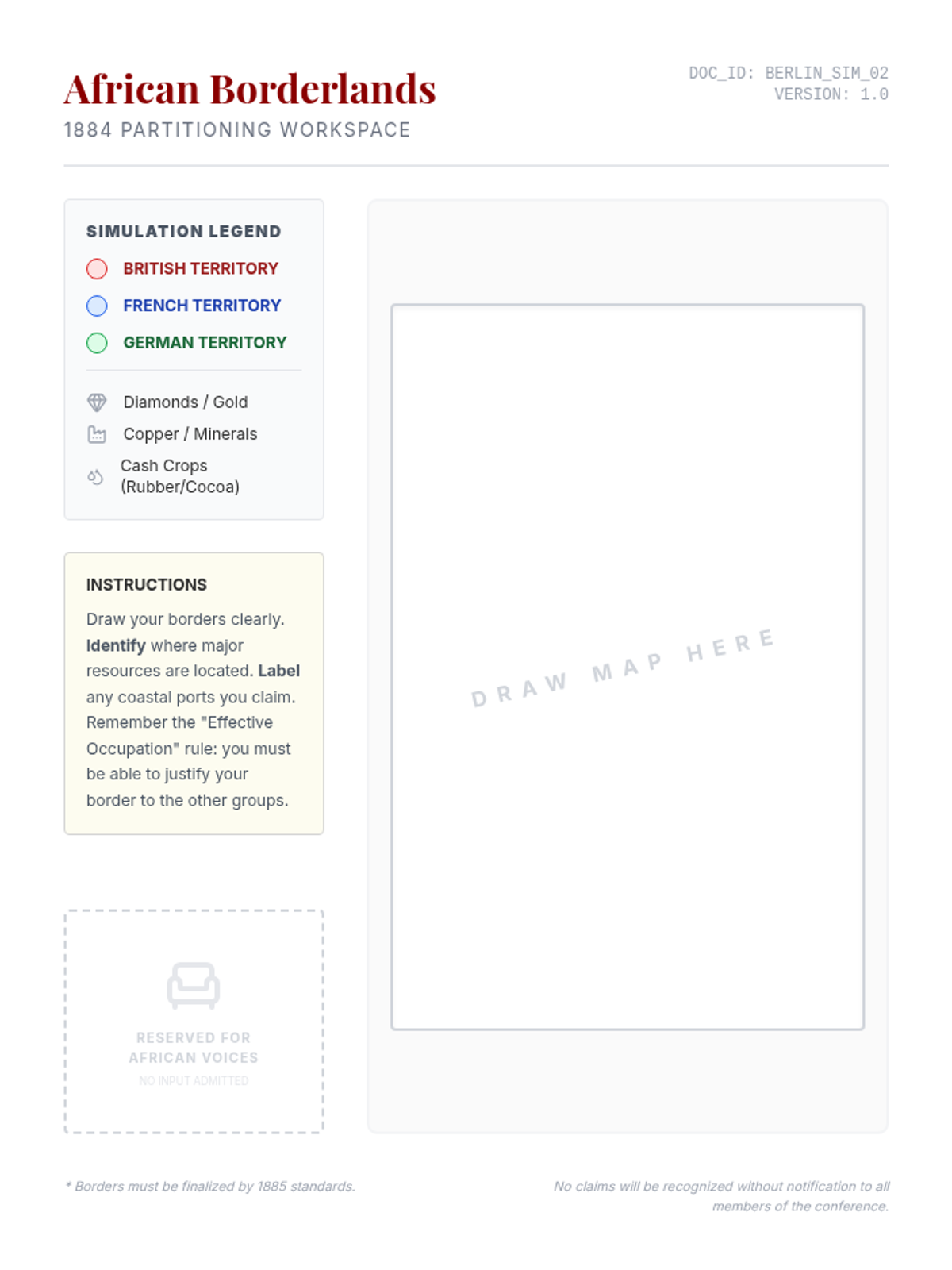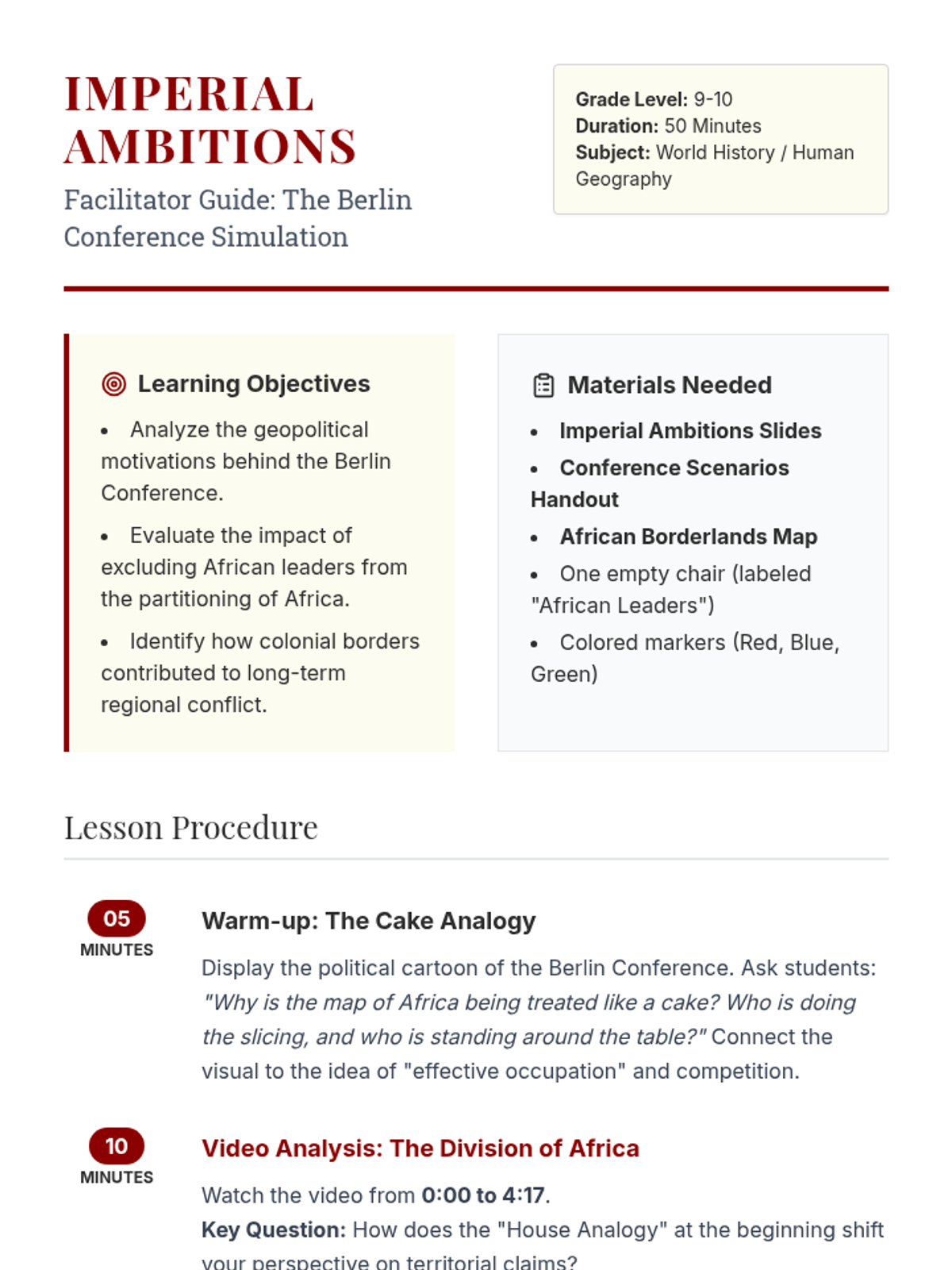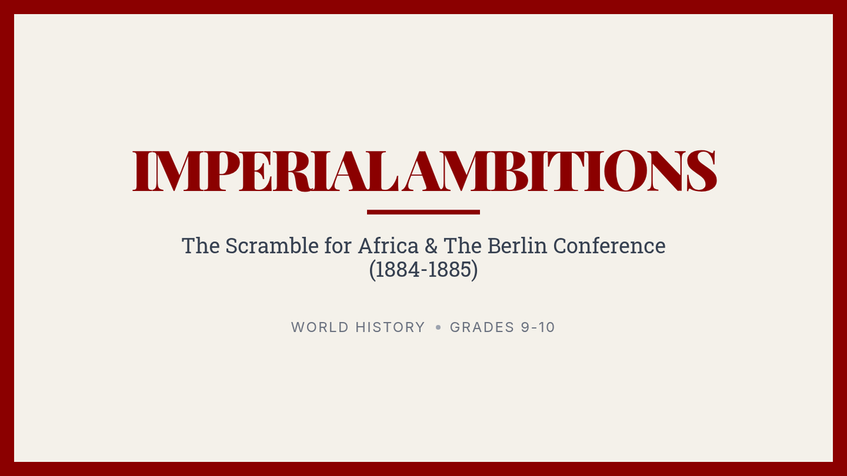 Students analyze the motivations and outcomes of the 1884-1885 Berlin Conference through a historical simulation, video analysis, and reflection on the consequences of excluding African voices from the division of the continent.