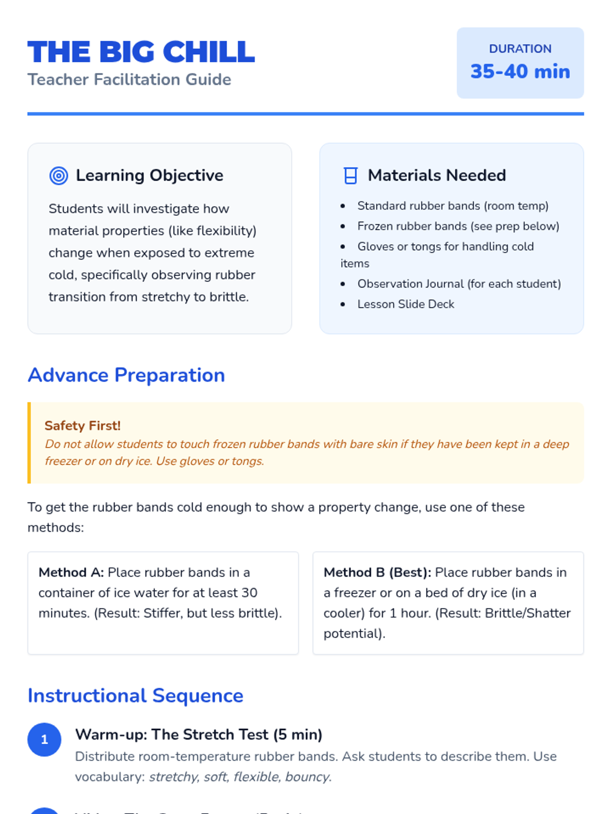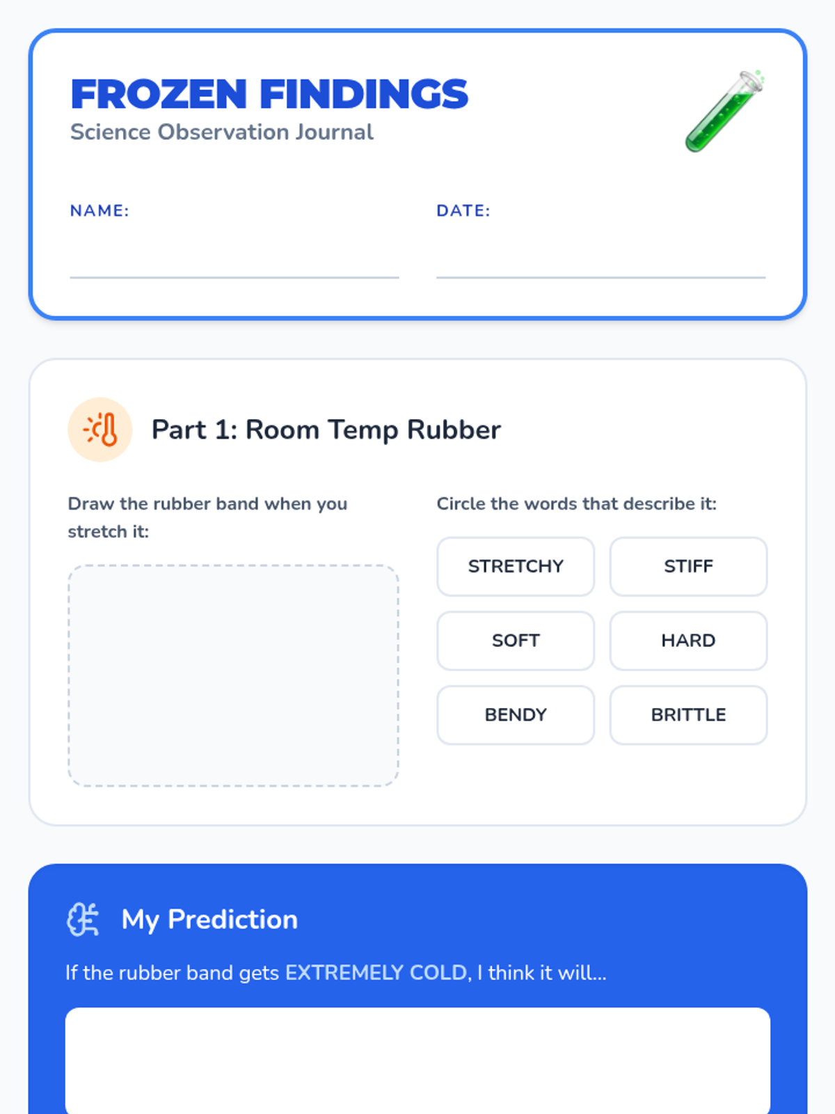 A 2nd-grade science lesson investigating how temperature changes the properties of rubber, featuring a hands-on experiment and an educational video about the journey of escaped balloons.
