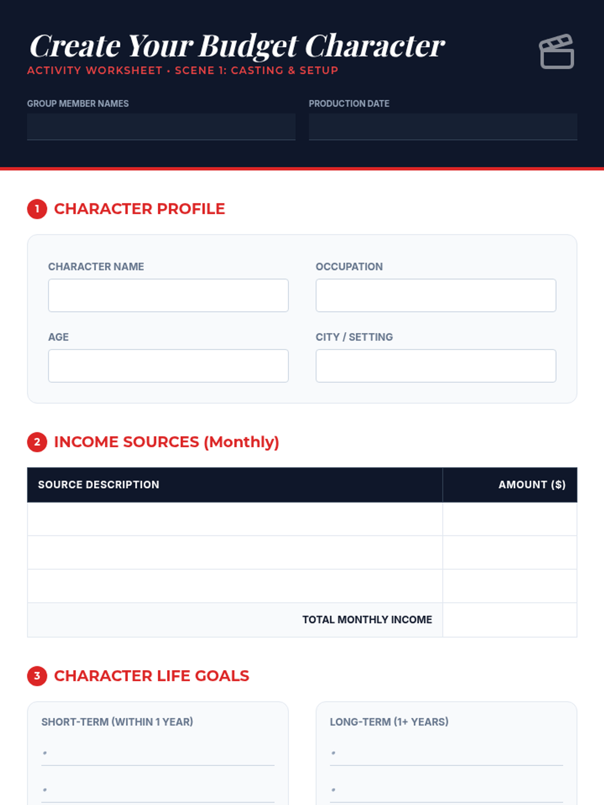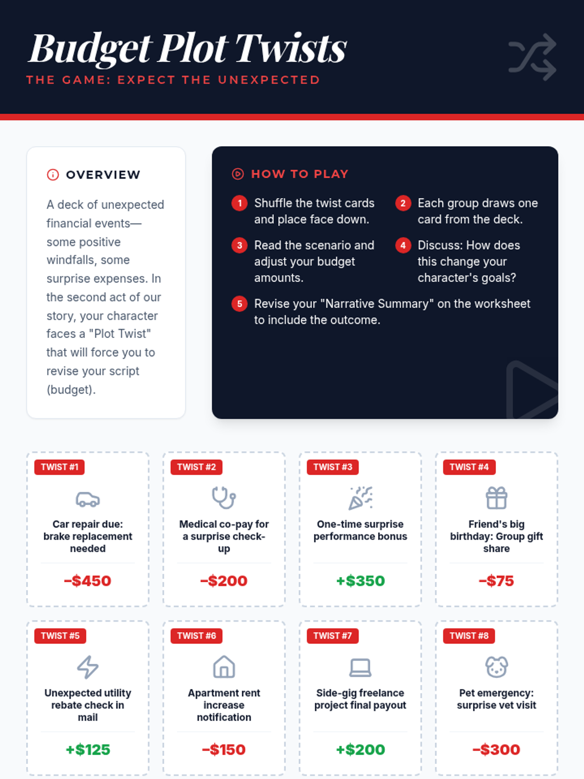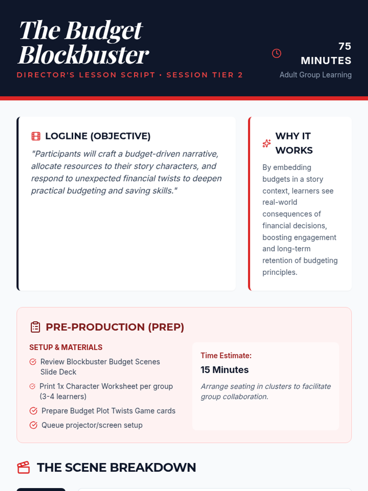 A 75-minute story-driven budgeting lesson for adults where learners design narrative budgets and navigate financial plot twists.
