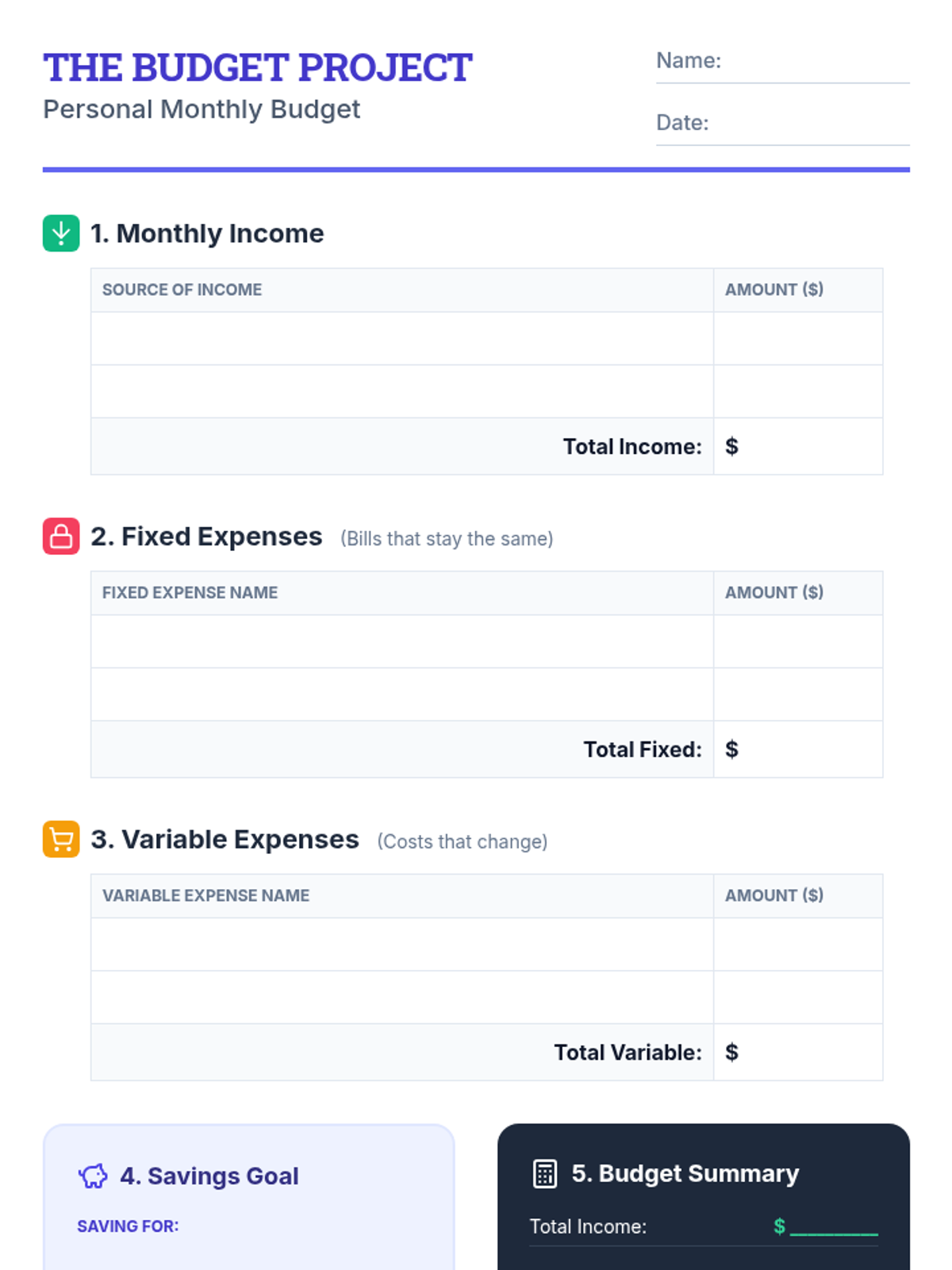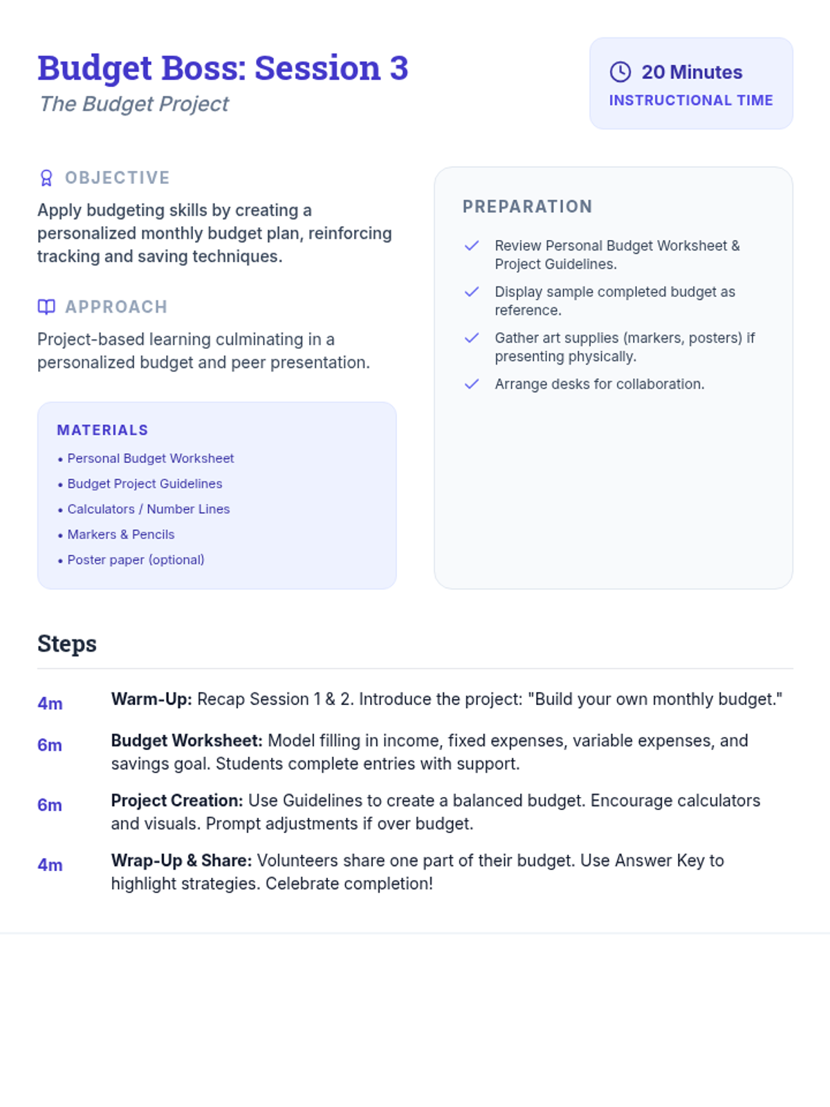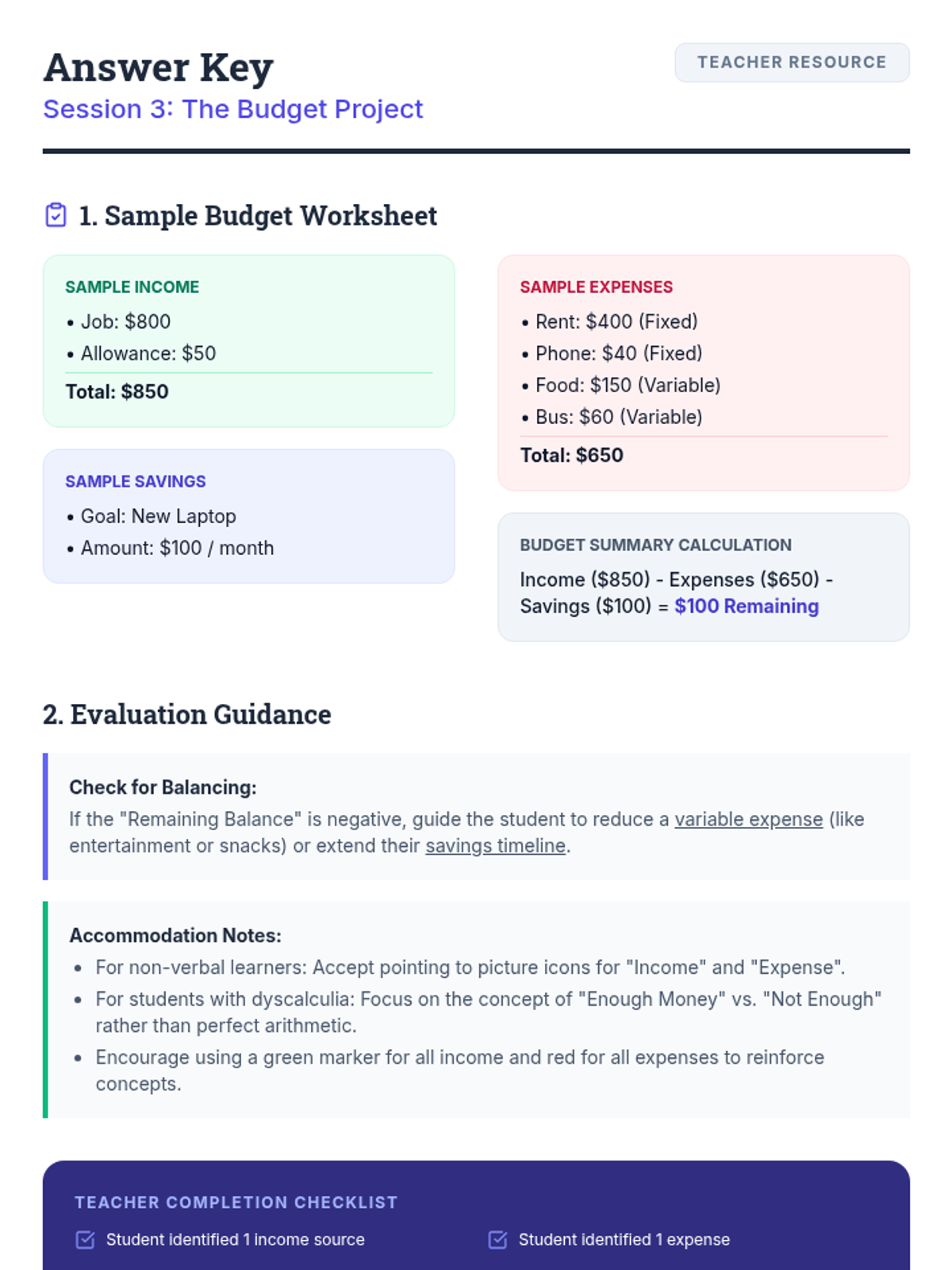 Students apply their knowledge to create a personalized monthly budget project.