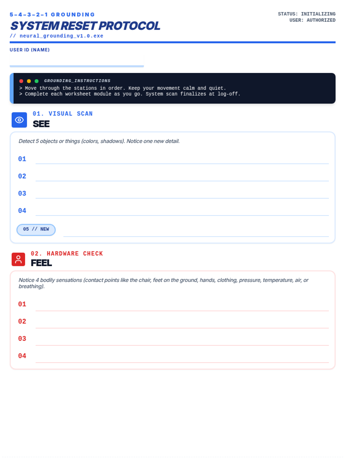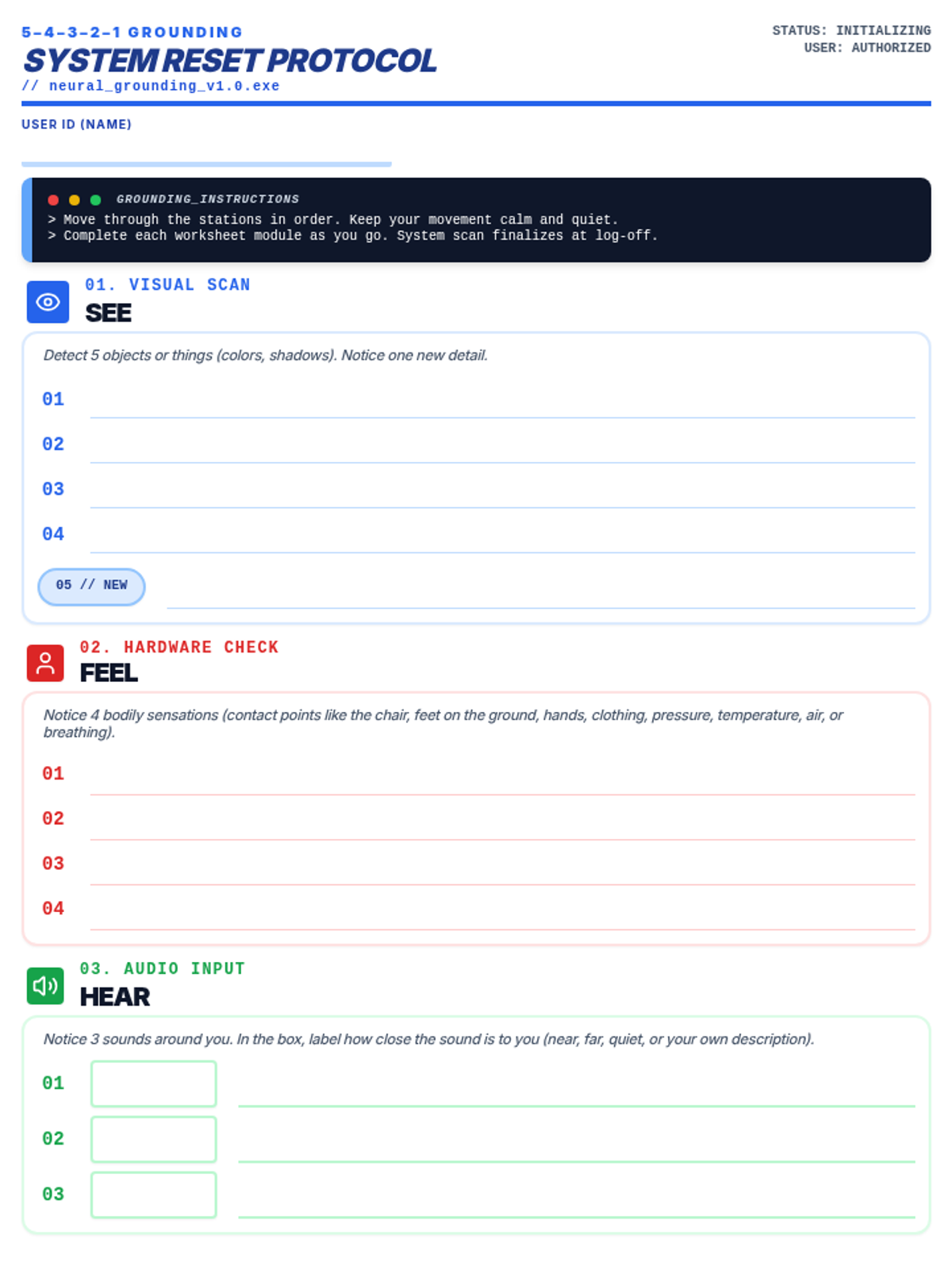 A lesson teaching students how to use the 5-4-3-2-1 grounding technique to manage stress and anxiety, framed through a technical 'system reset' metaphor. Students learn to recognize the 'spinning' state of anxiety and intercept it using sensory inputs.