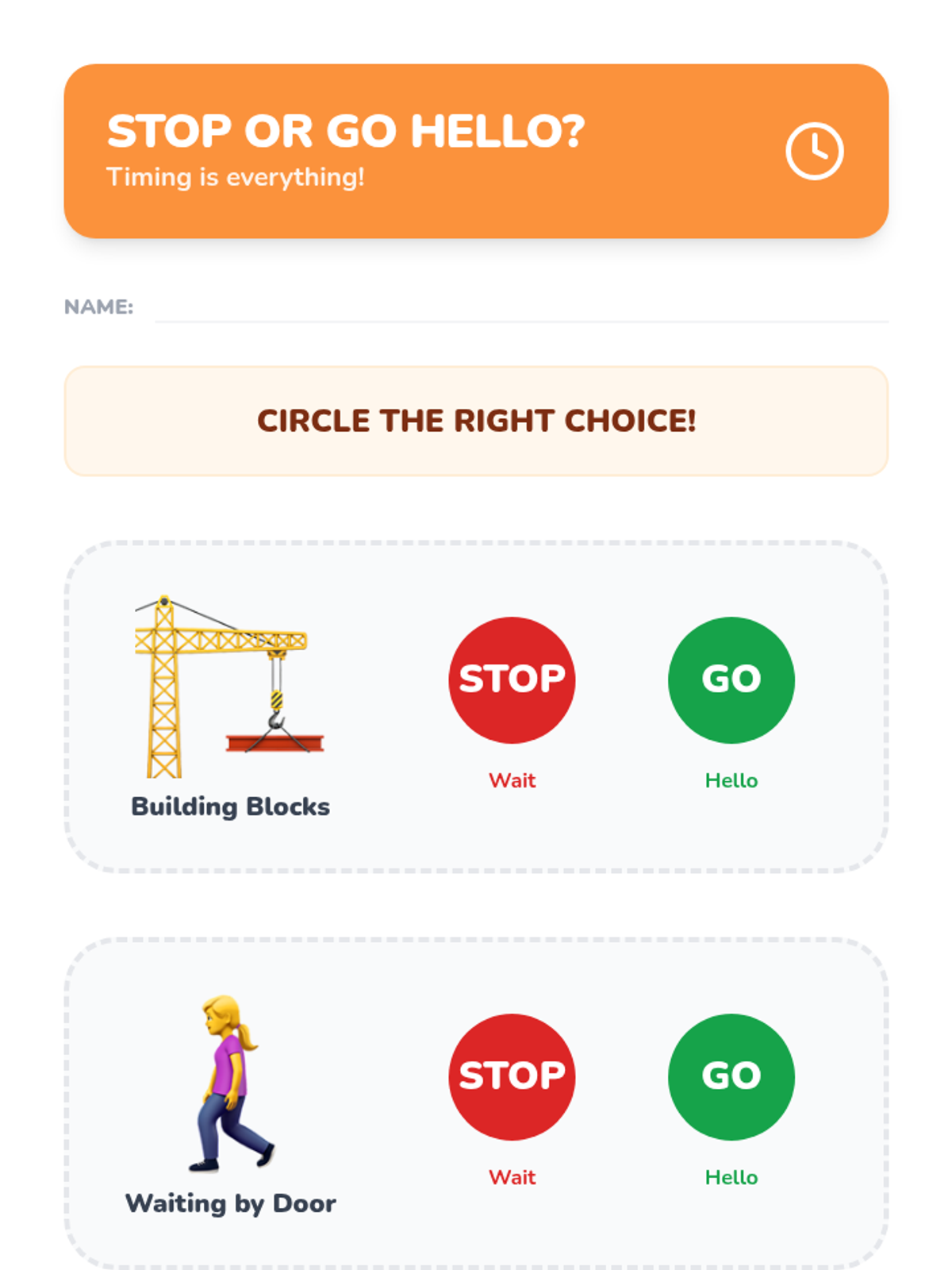 Students analyze scenarios where a peer is busy building a tower versus waiting by the door. They discuss appropriate interruptions and greeting timing.