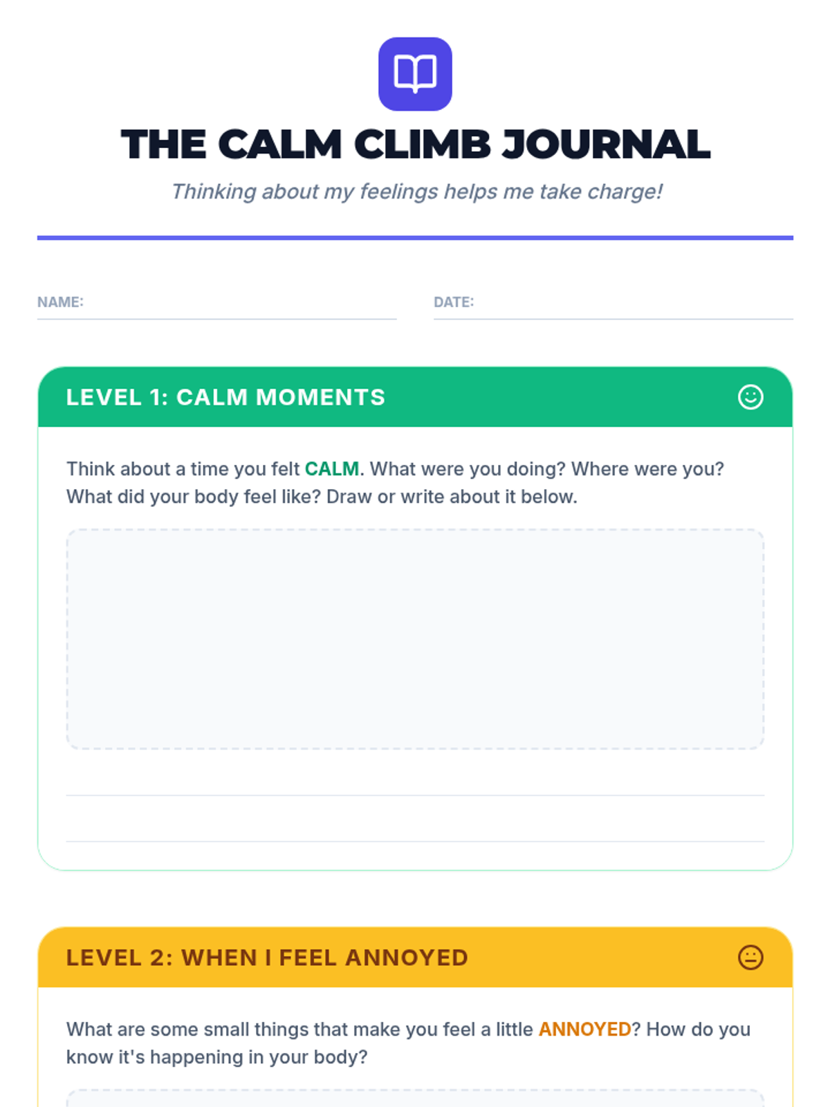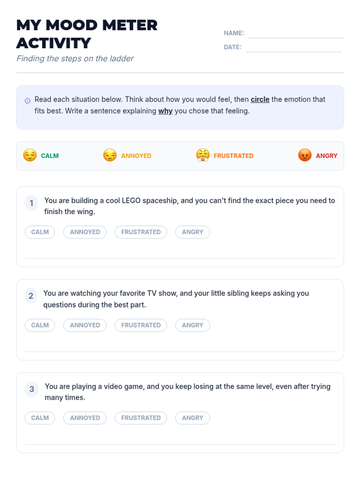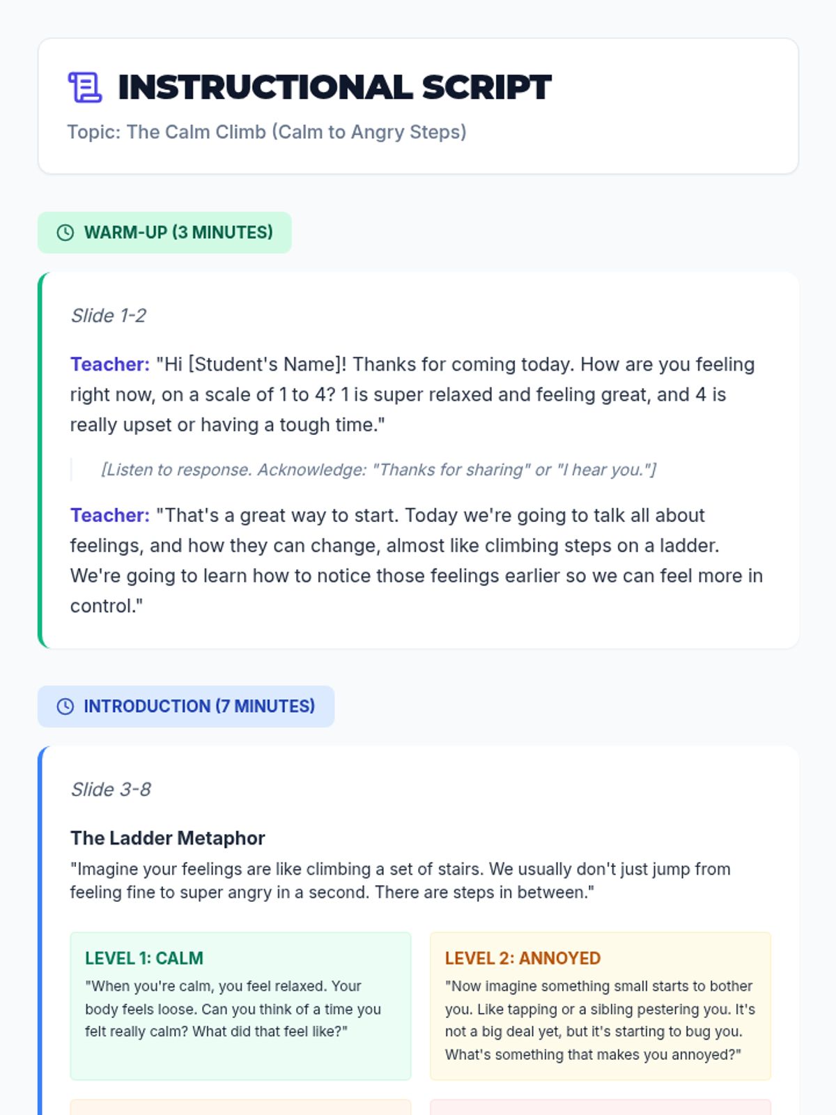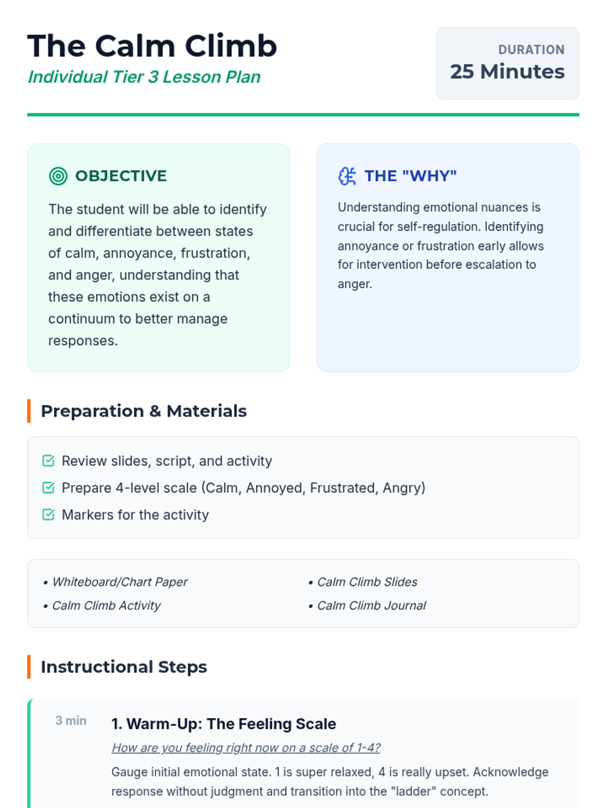 A Tier 3 individual lesson for a 4th-grade student to identify the steps between calm and angry, focusing on annoyance and frustration as early warning signs.