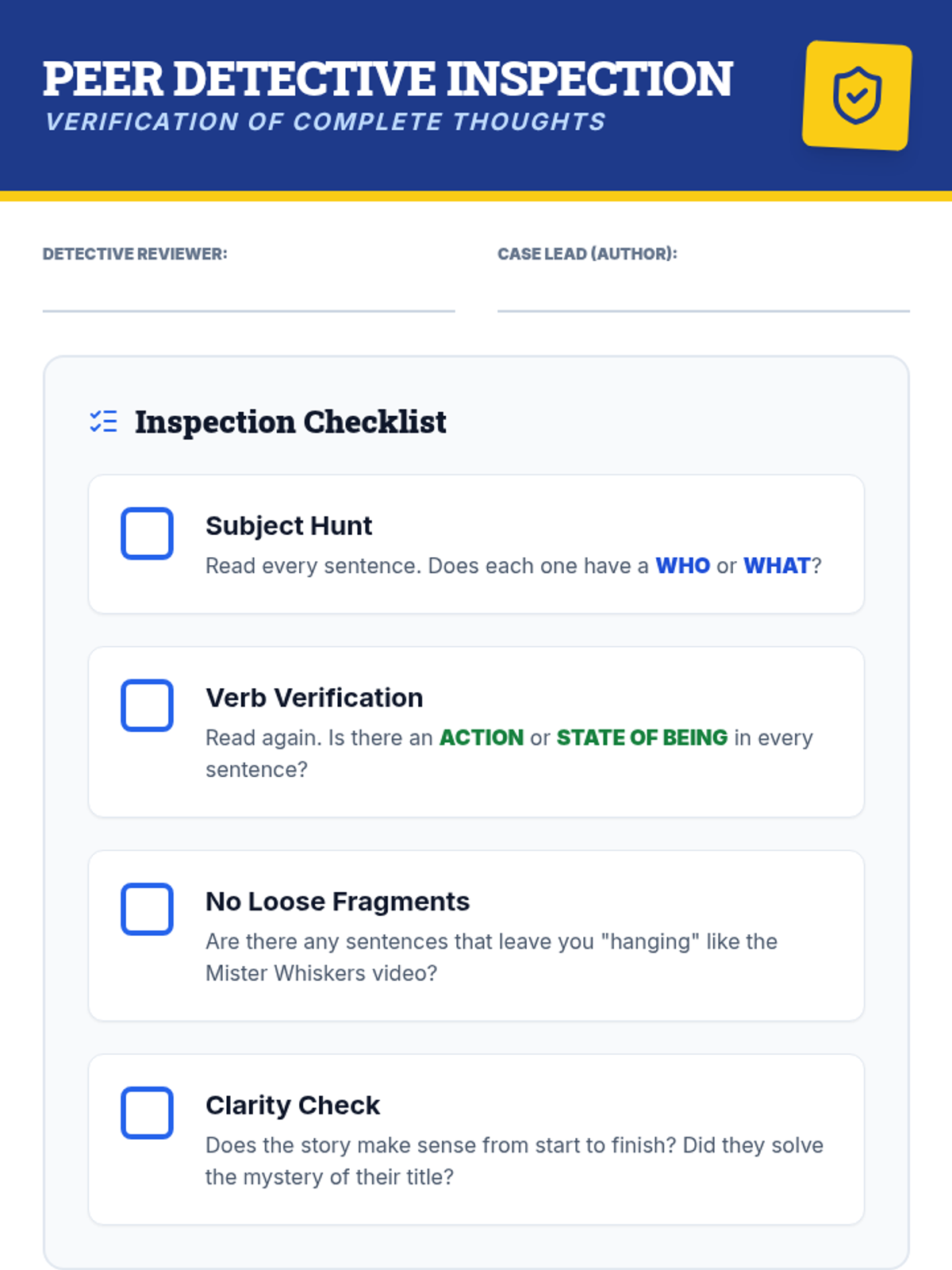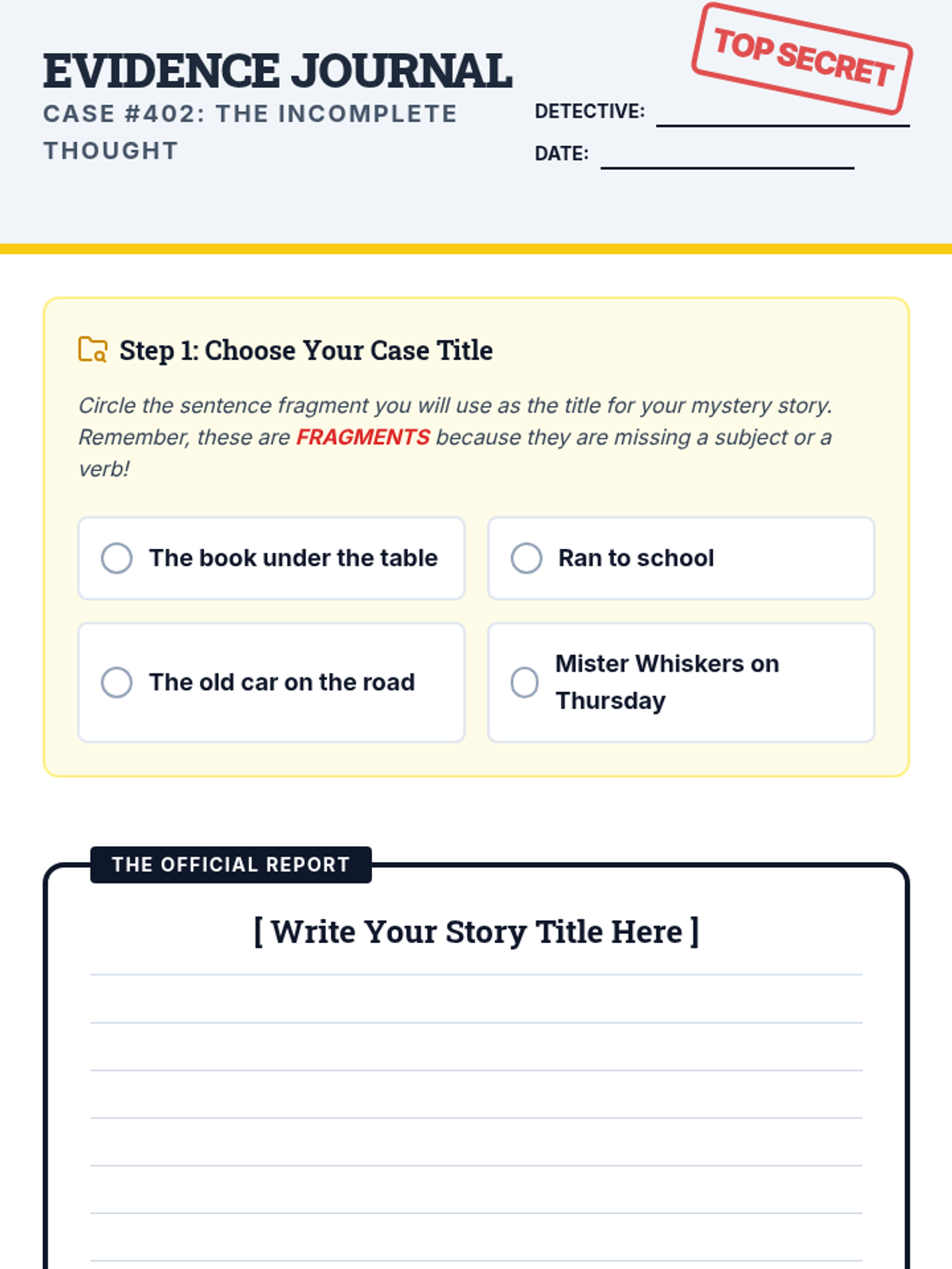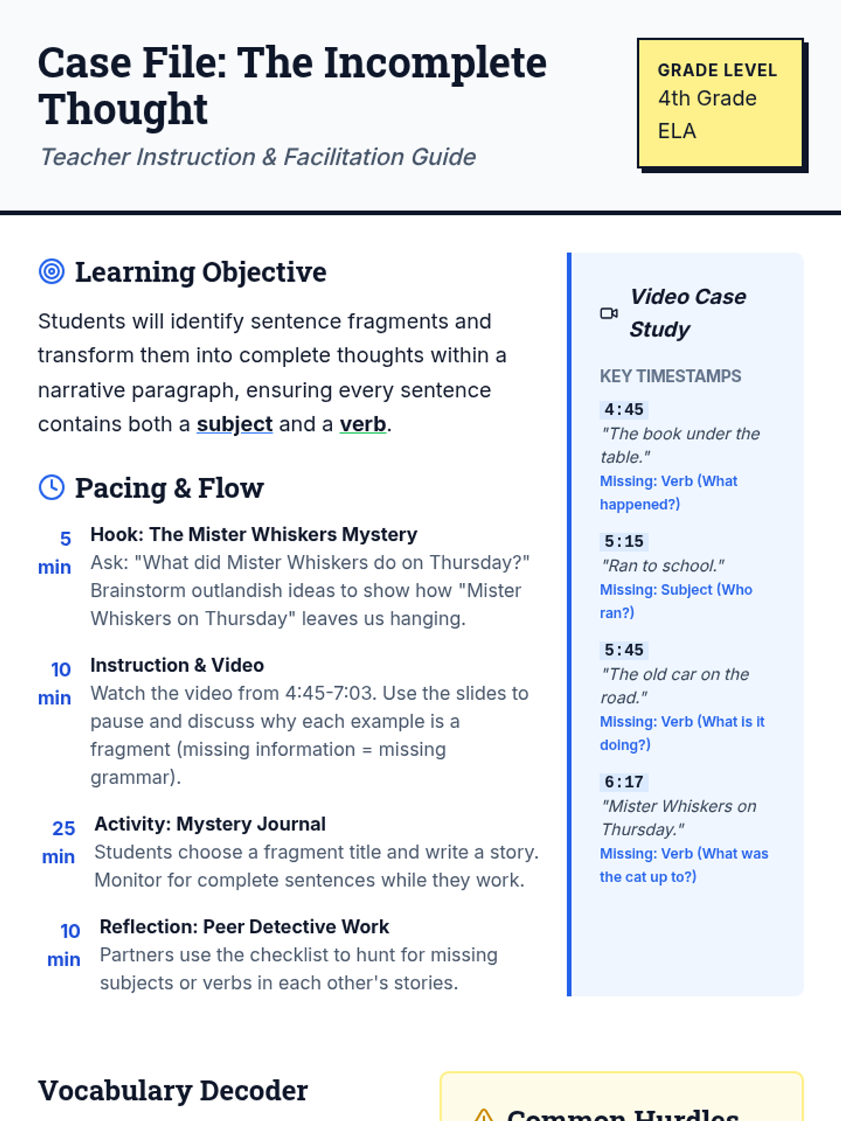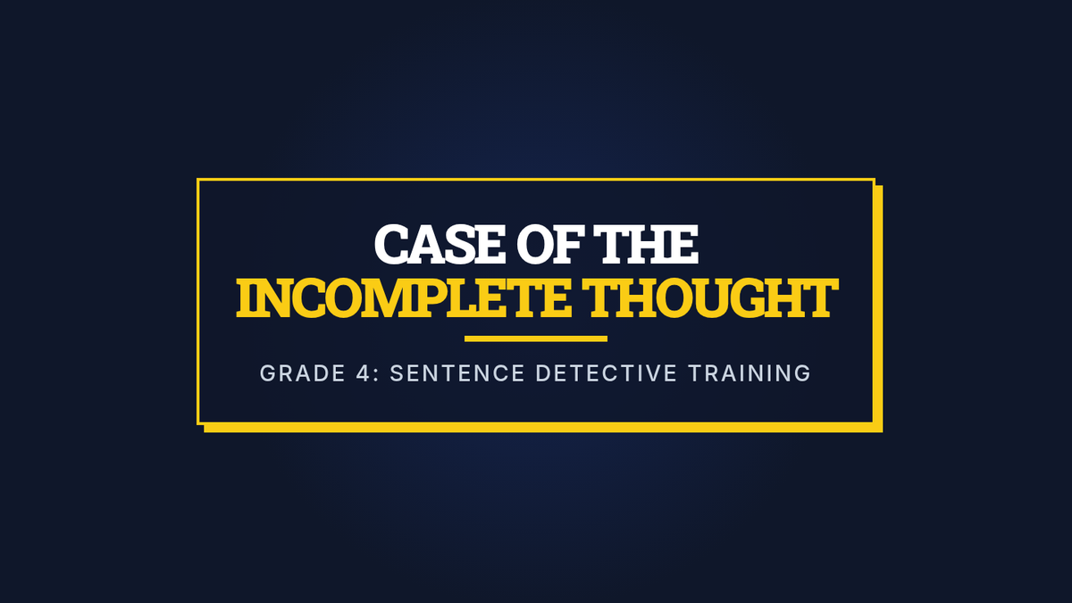A 4th-grade creative writing lesson focused on identifying and fixing sentence fragments using a mystery-themed narrative approach. Students will watch a targeted video segment, brainstorm 'missing' information, and write their own short stories starting from open-ended fragments.