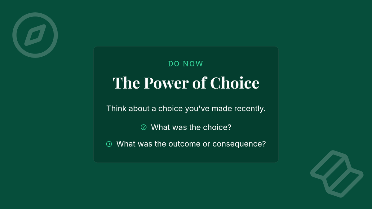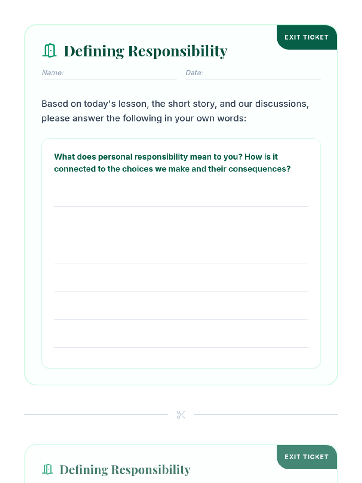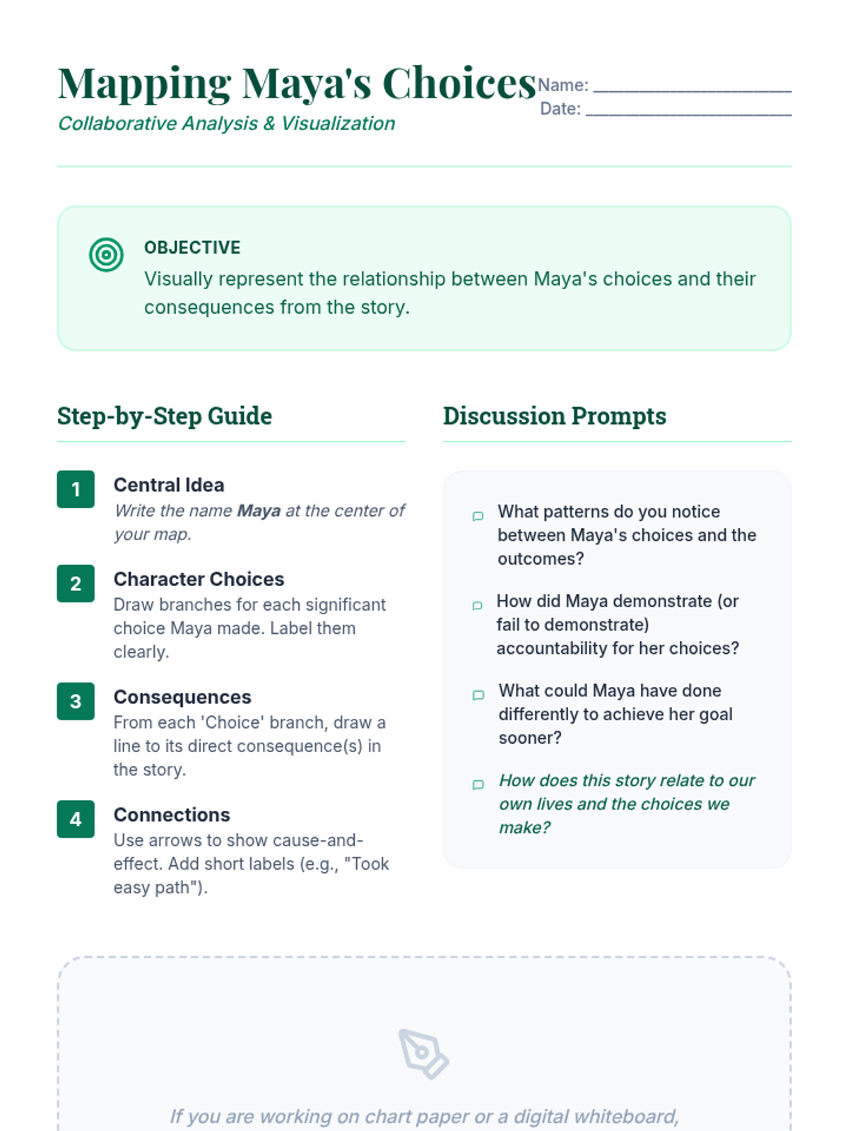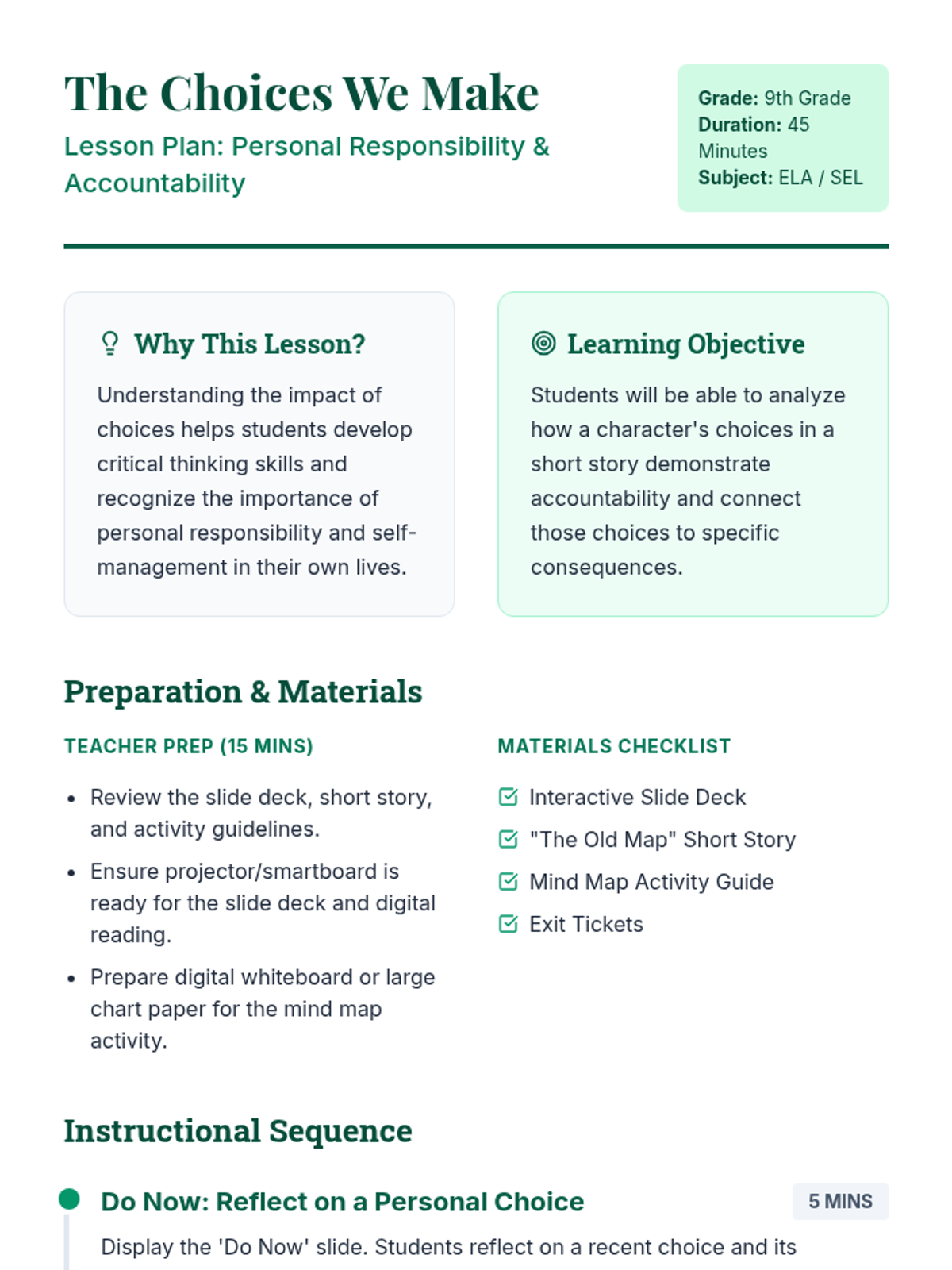 This 9th-grade lesson explores the critical connection between character choices and their consequences through literature analysis and self-reflection. Students will analyze a short story to understand accountability, cause and effect, and personal responsibility.