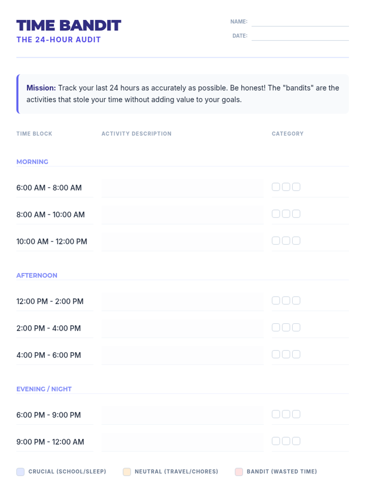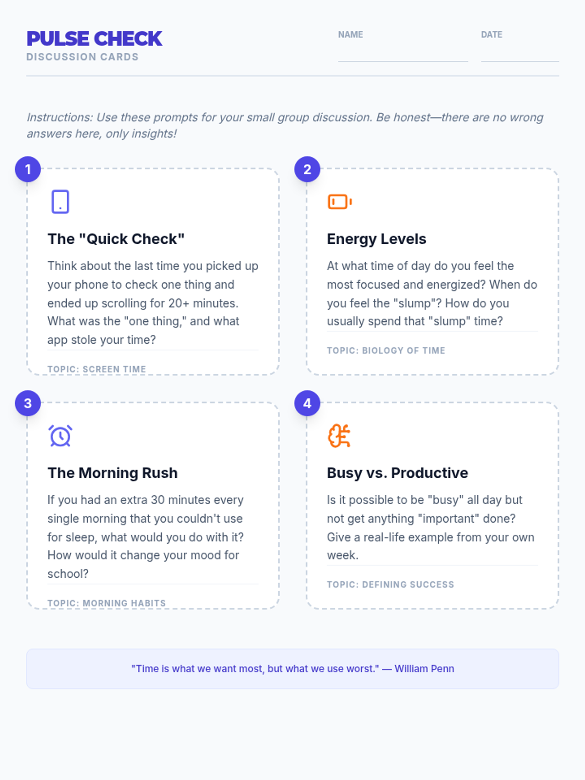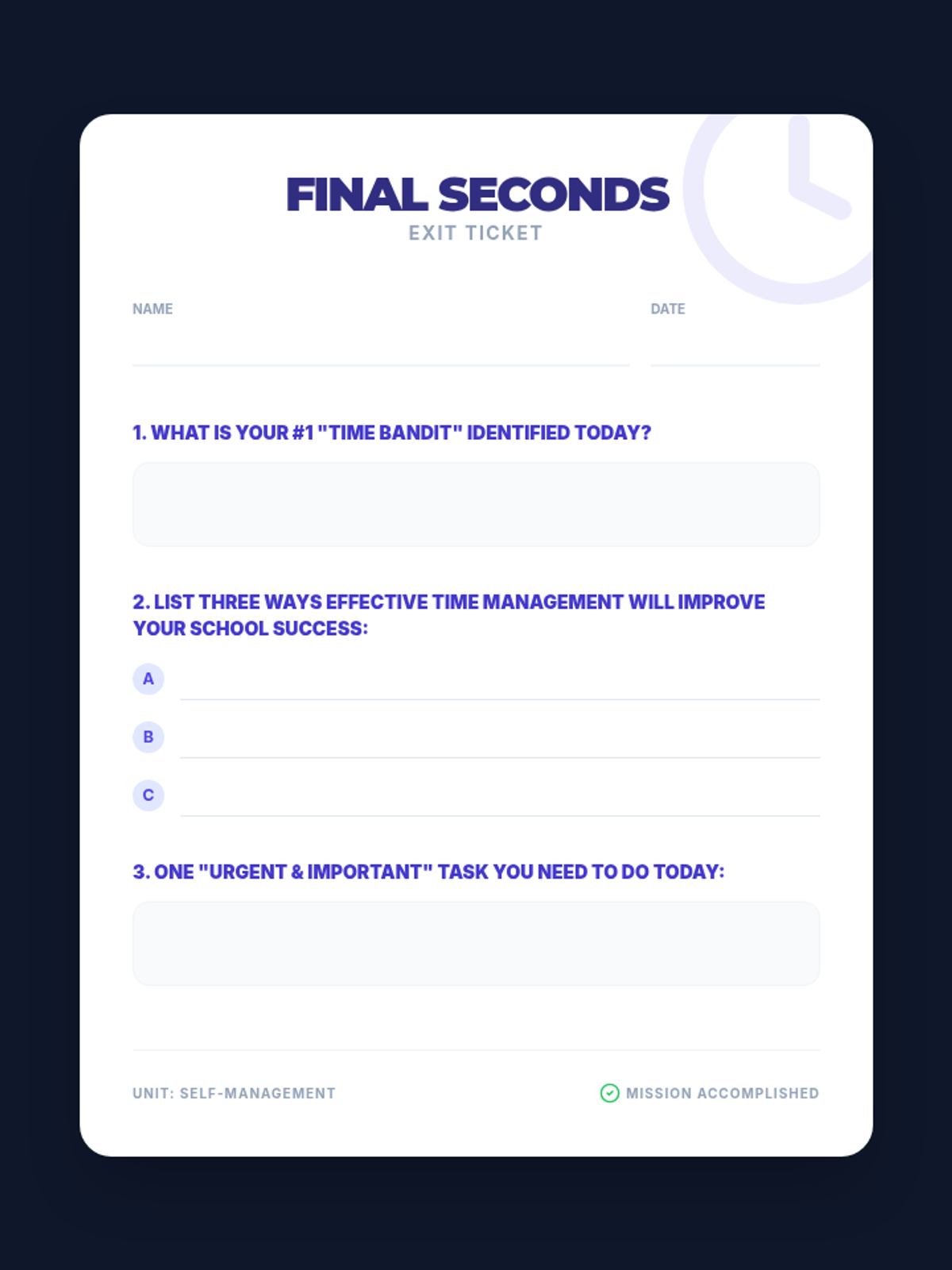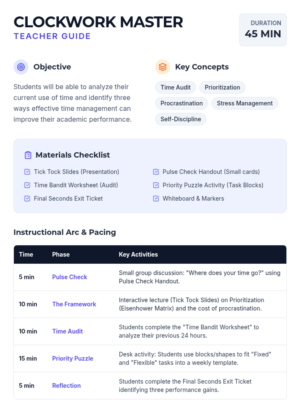 A comprehensive 45-minute lesson for 9th graders focusing on analyzing time usage, prioritization strategies, and the link between time management and academic success.