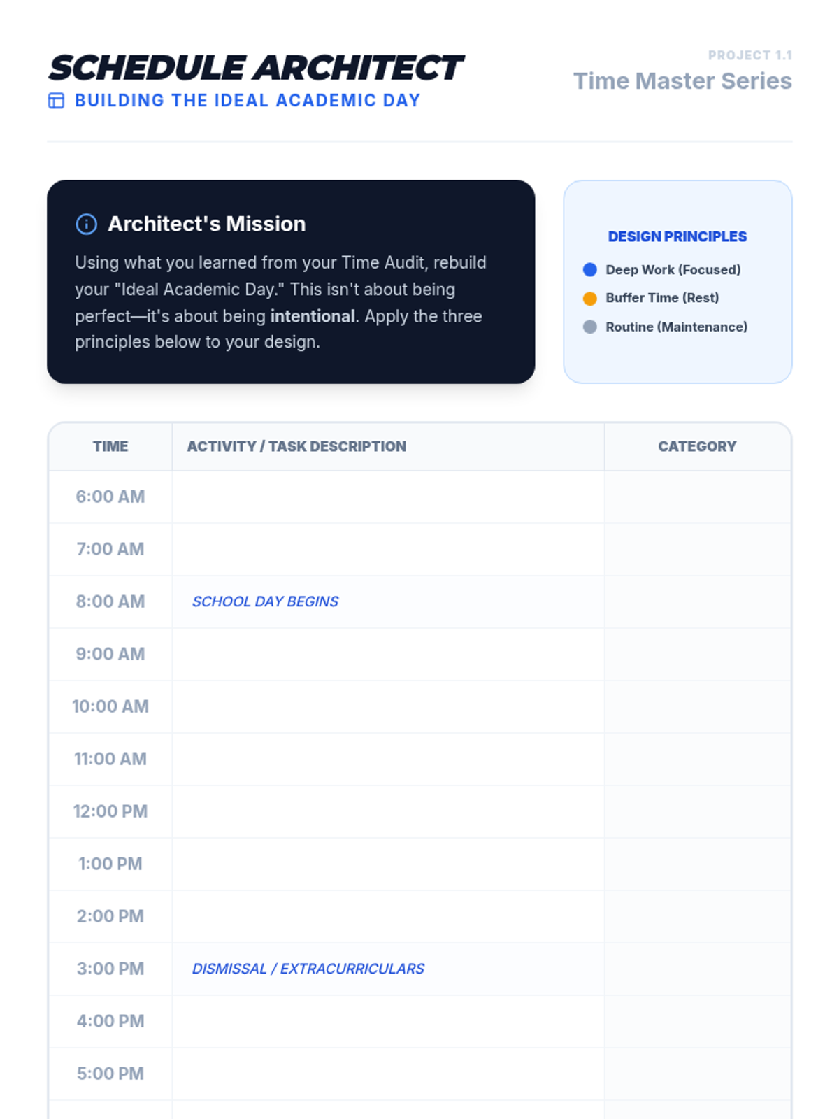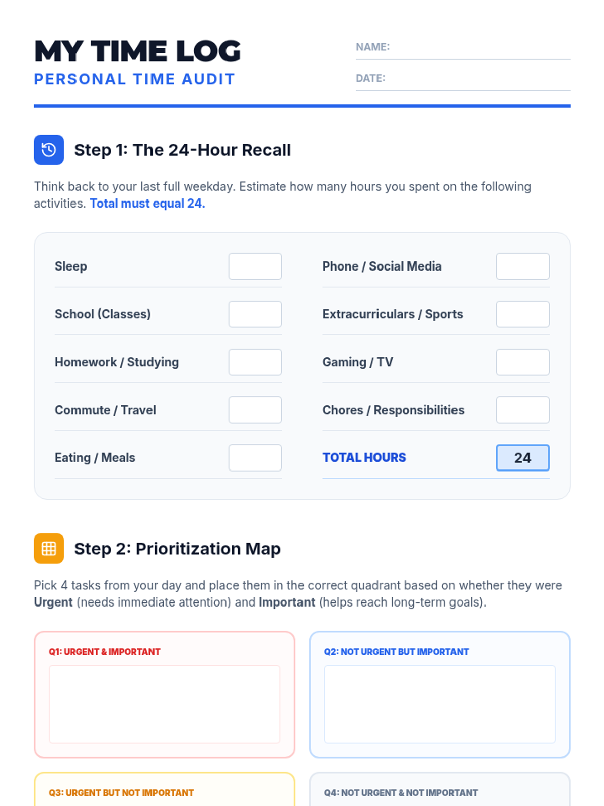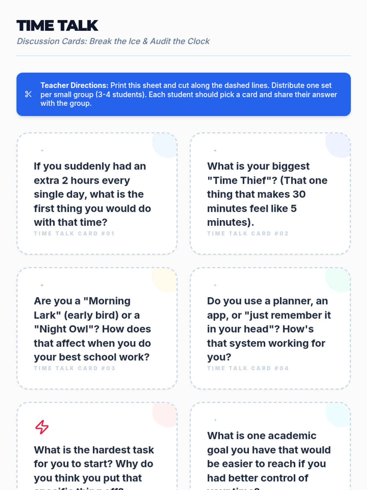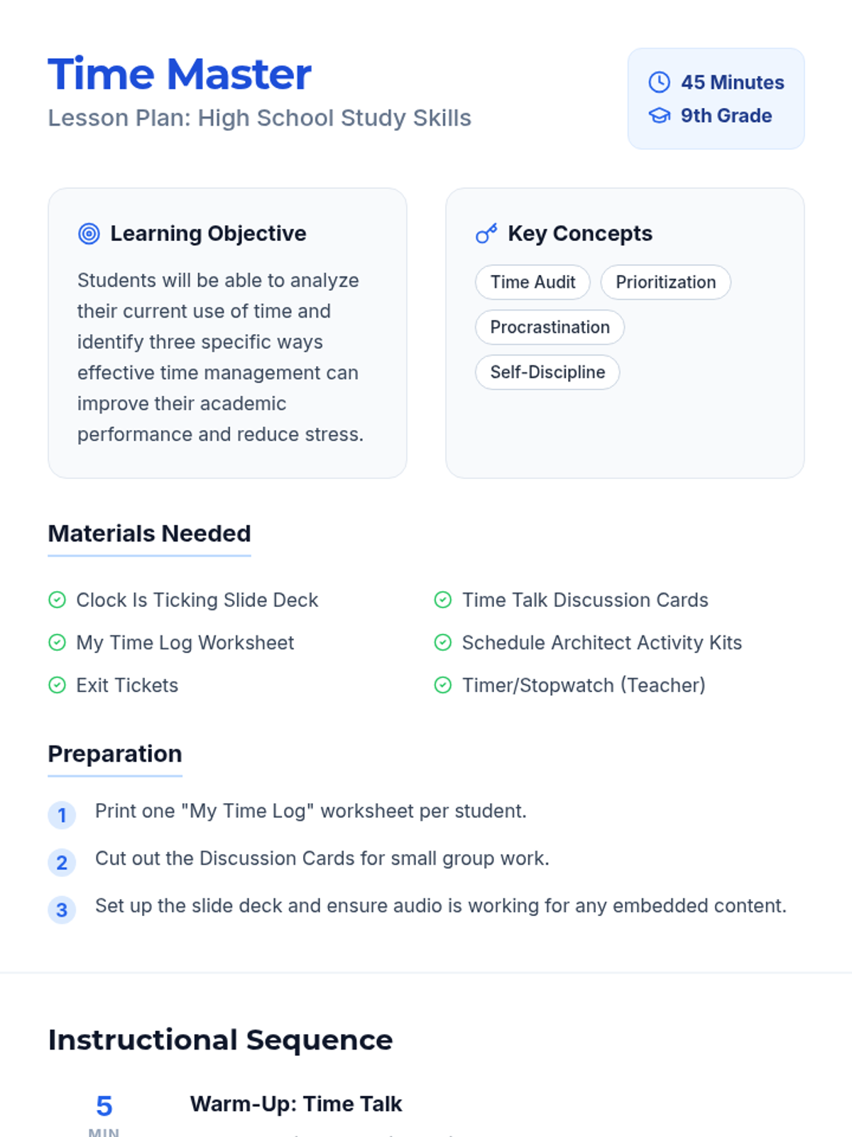 A comprehensive 45-minute lesson for 9th graders focusing on time auditing, prioritization, and the link between time management and academic success. students will analyze their current habits and build a more effective schedule.