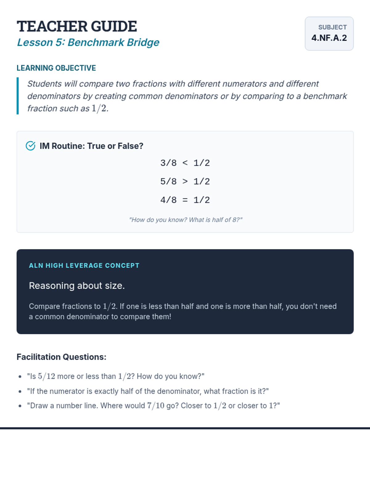 Comparing fractions with different numerators and denominators by finding common ground or using benchmark reasoning.