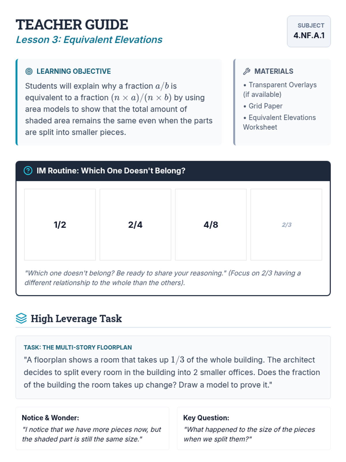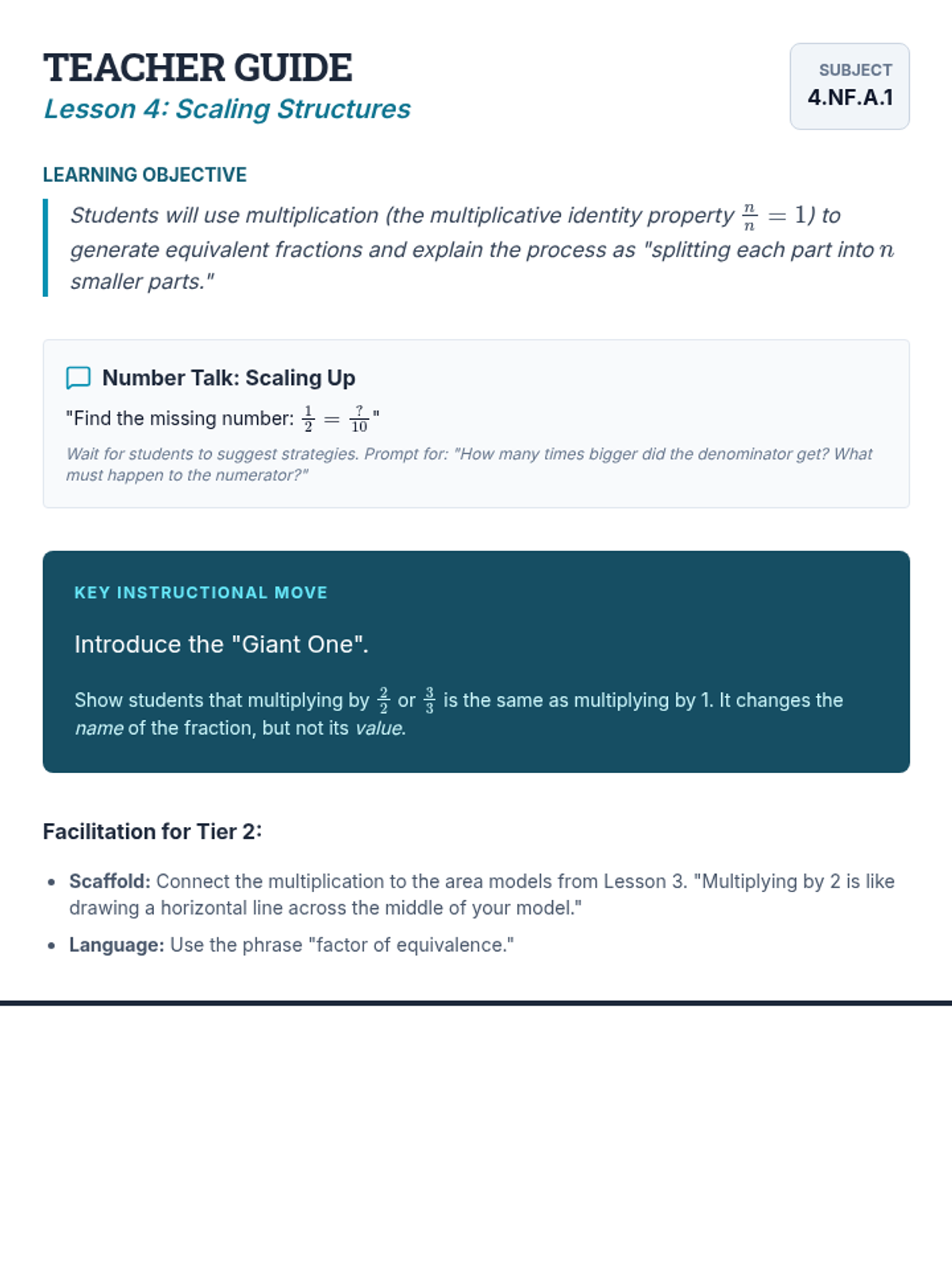 Moving from visual models to the multiplicative identity property (n/n) to generate equivalent fractions systematically.