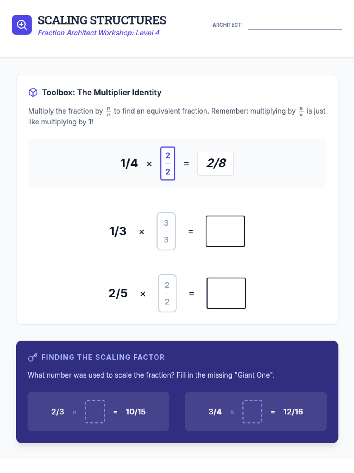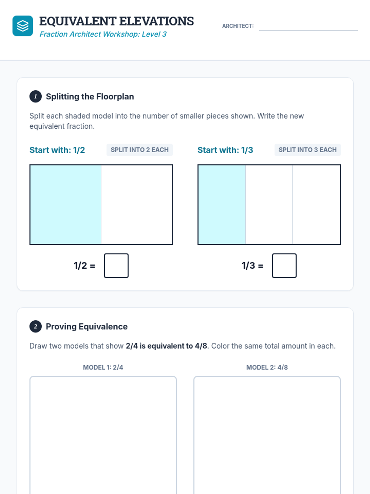 A cumulative review and performance task where students apply all fraction concepts to complete a master architectural blueprint.
