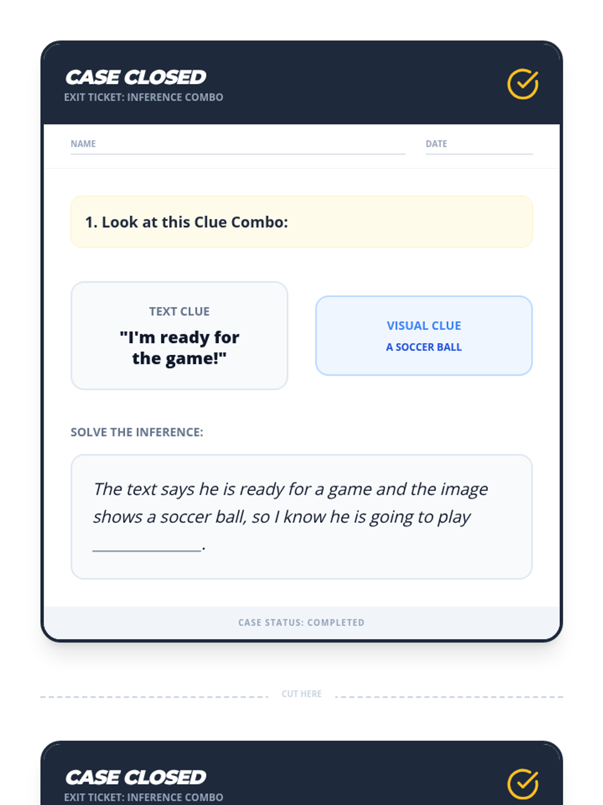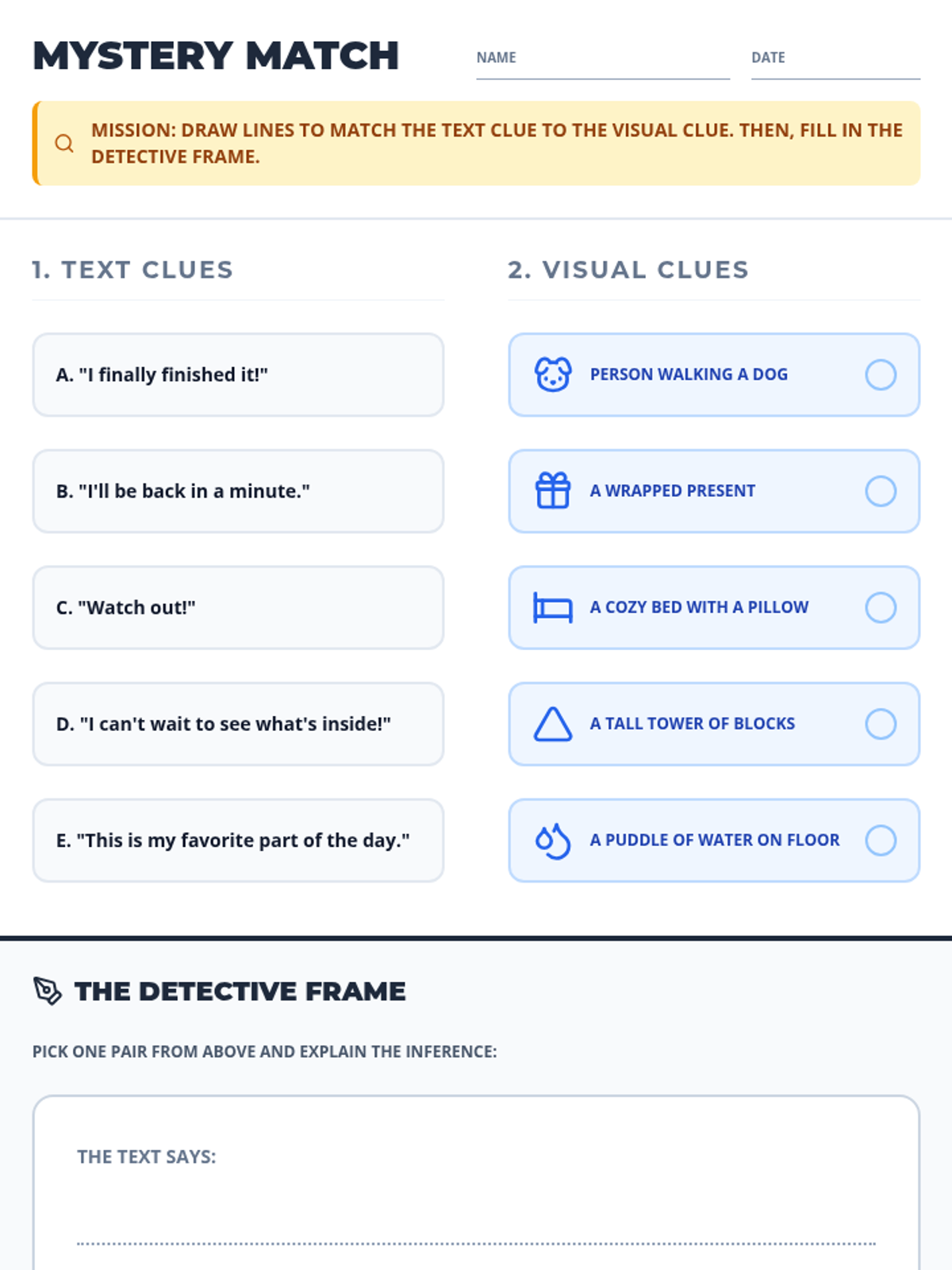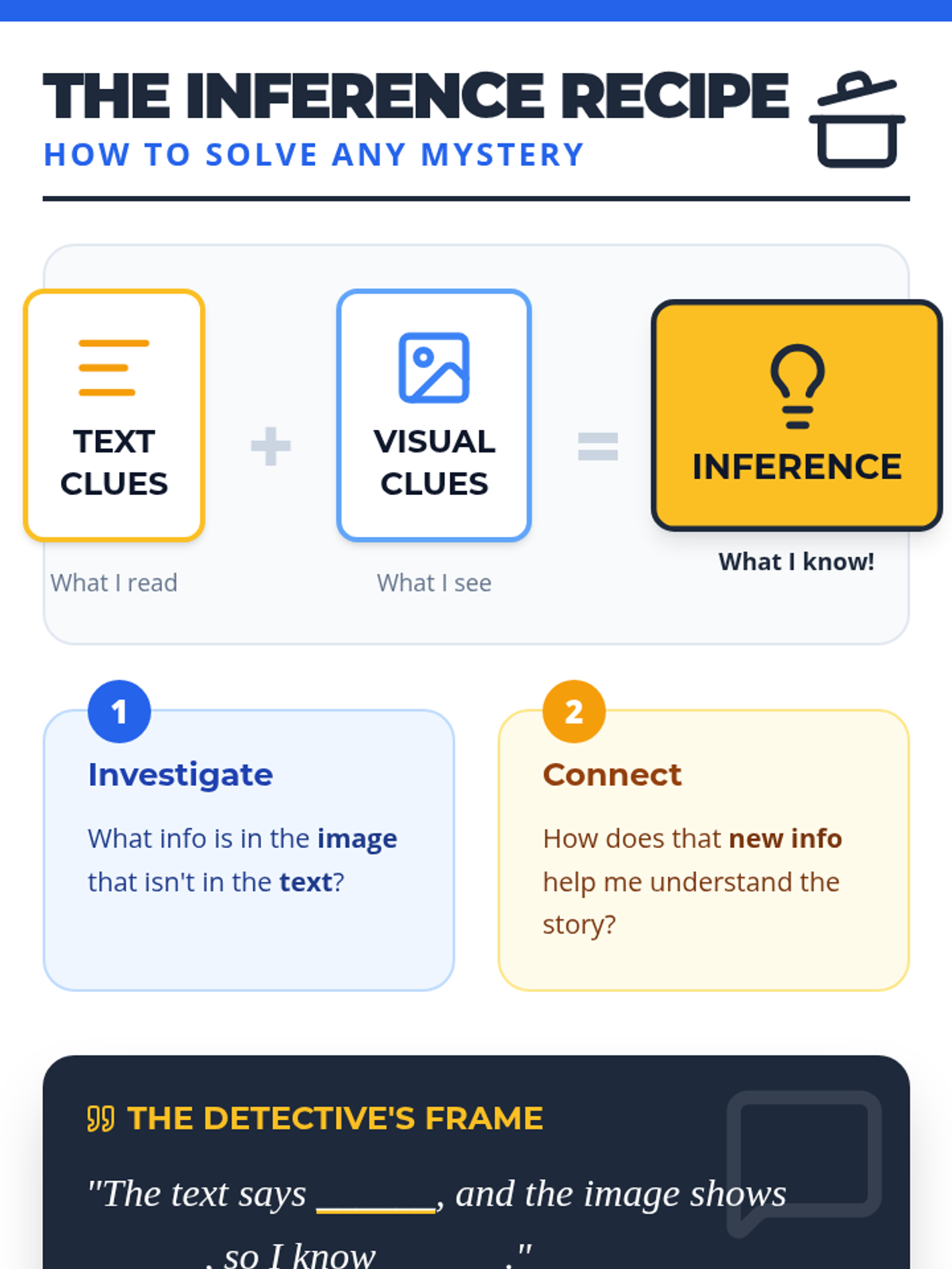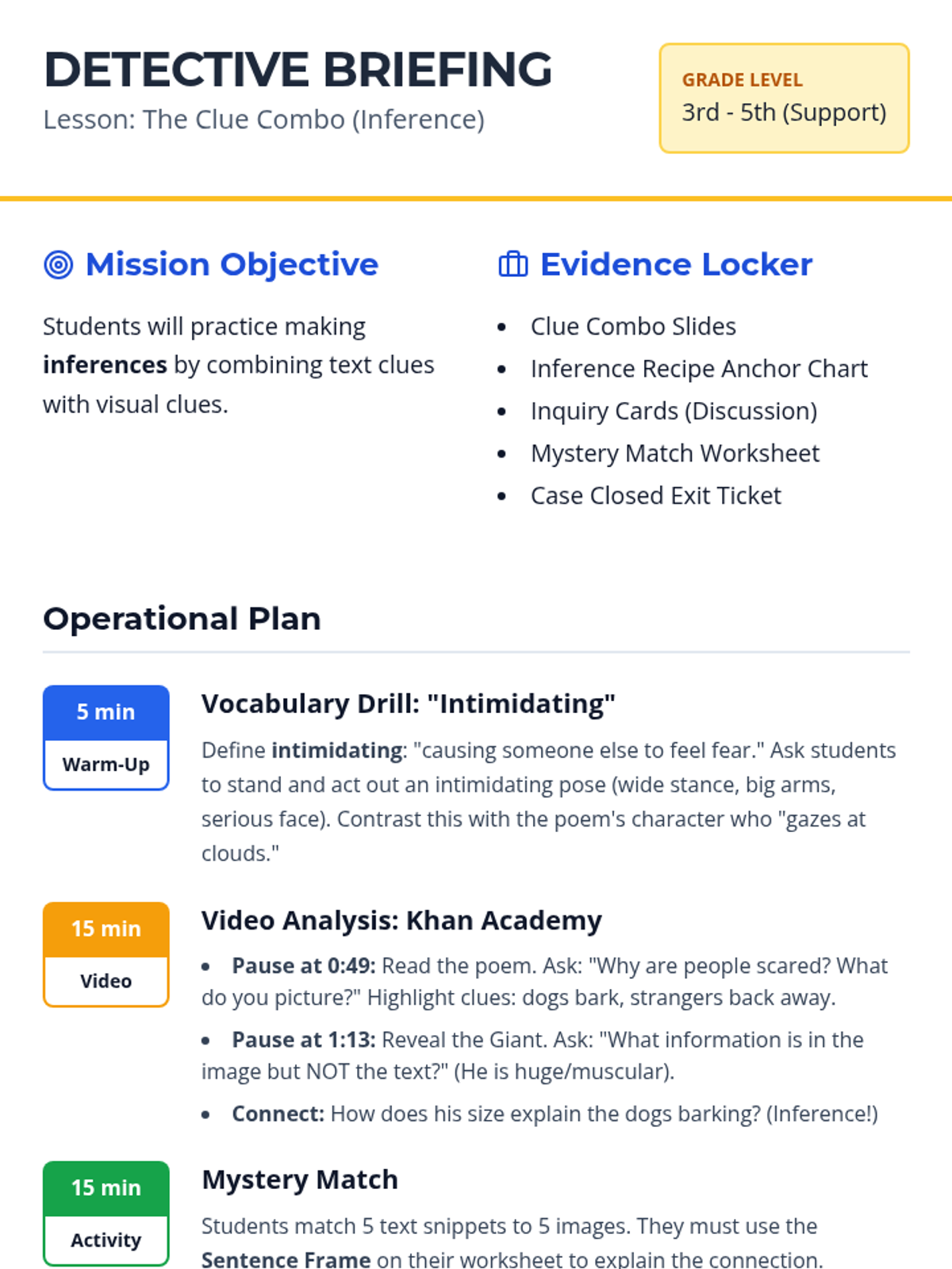 A lesson focusing on combining text and visual clues to make inferences, designed for 3rd-5th grade remedial support students. Students use a 'Mystery Match' activity to practice connecting evidence to conclusions using specific sentence frames.