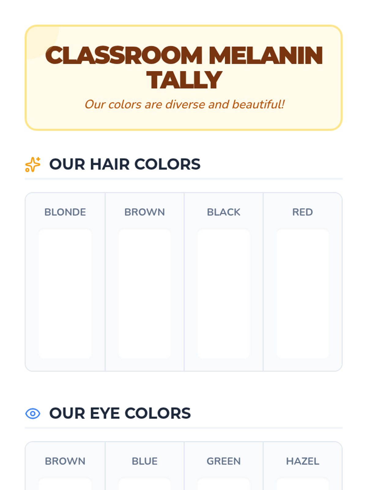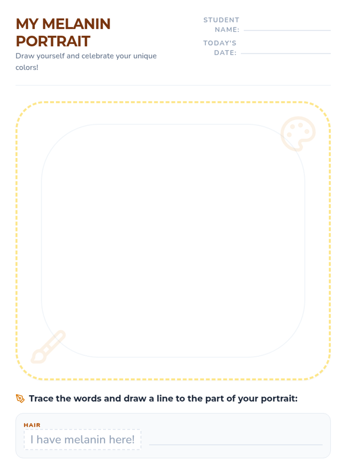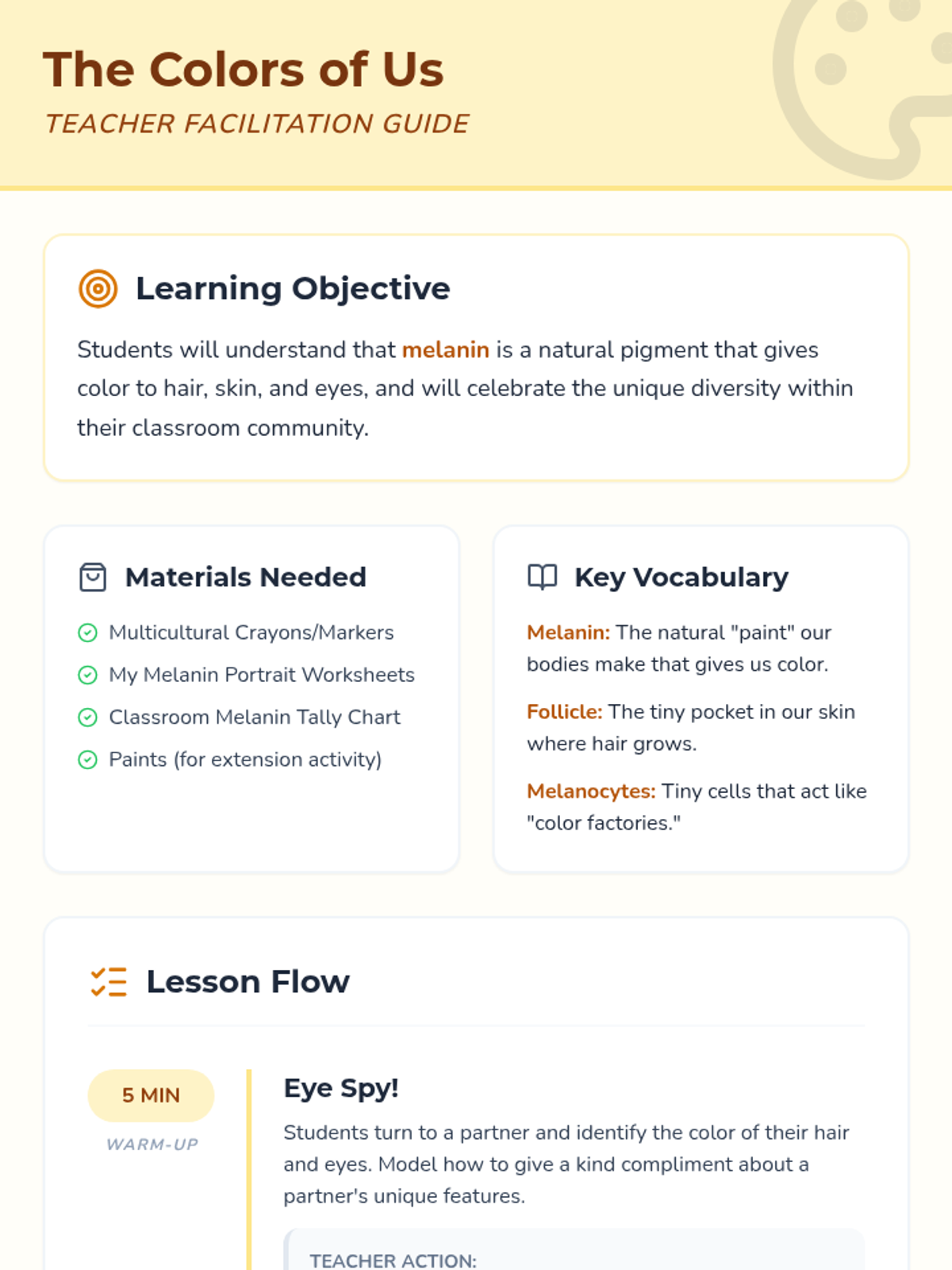 A lesson for 1st-2nd grade students to learn about melanin and celebrate the diverse colors of hair, skin, and eyes in their classroom.