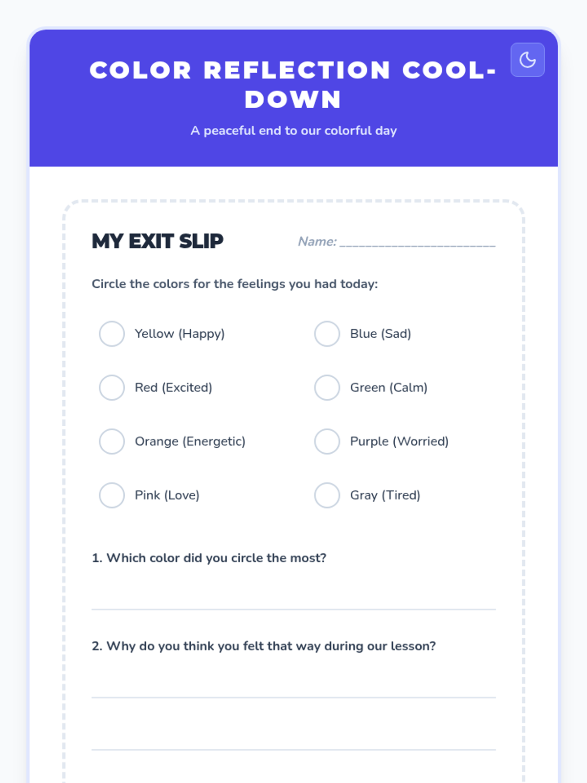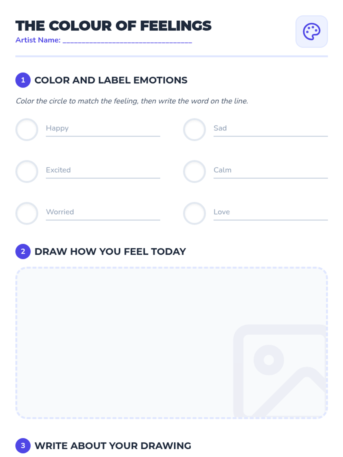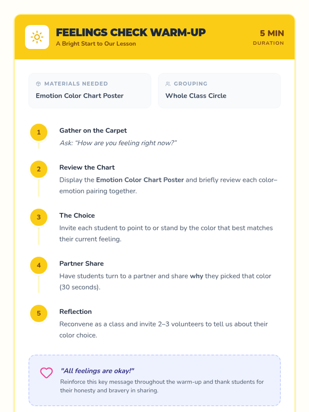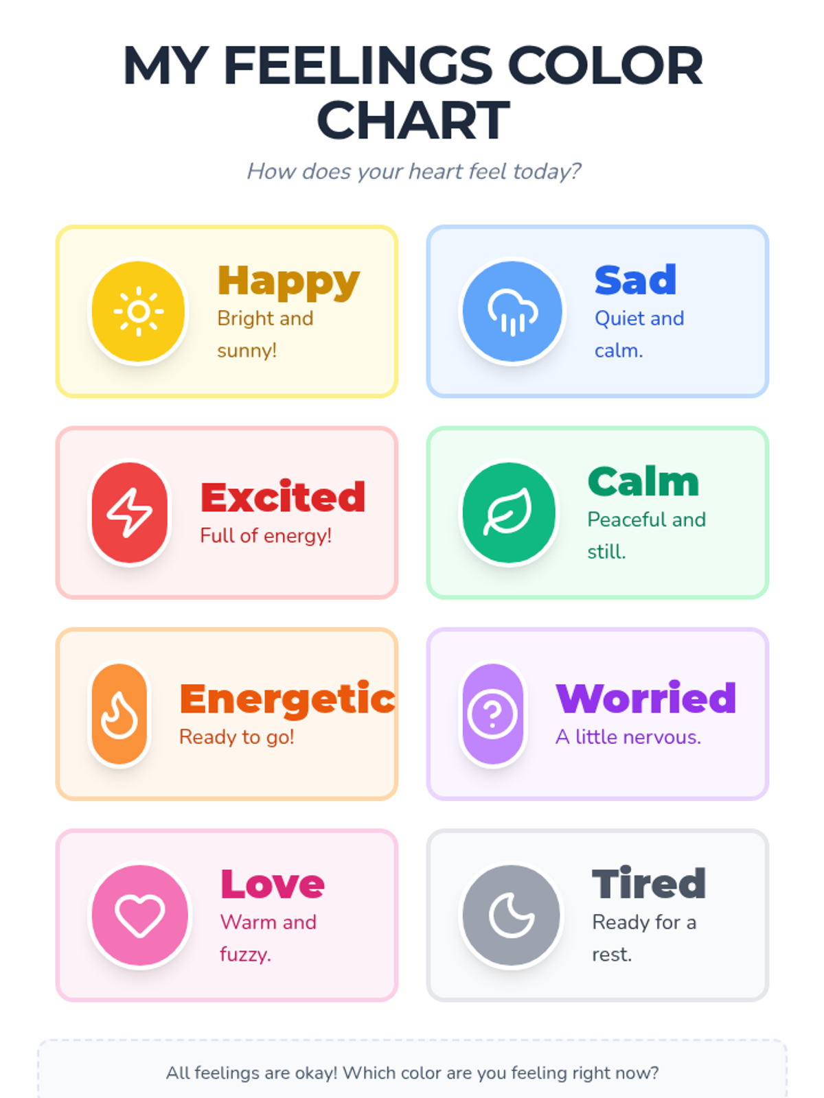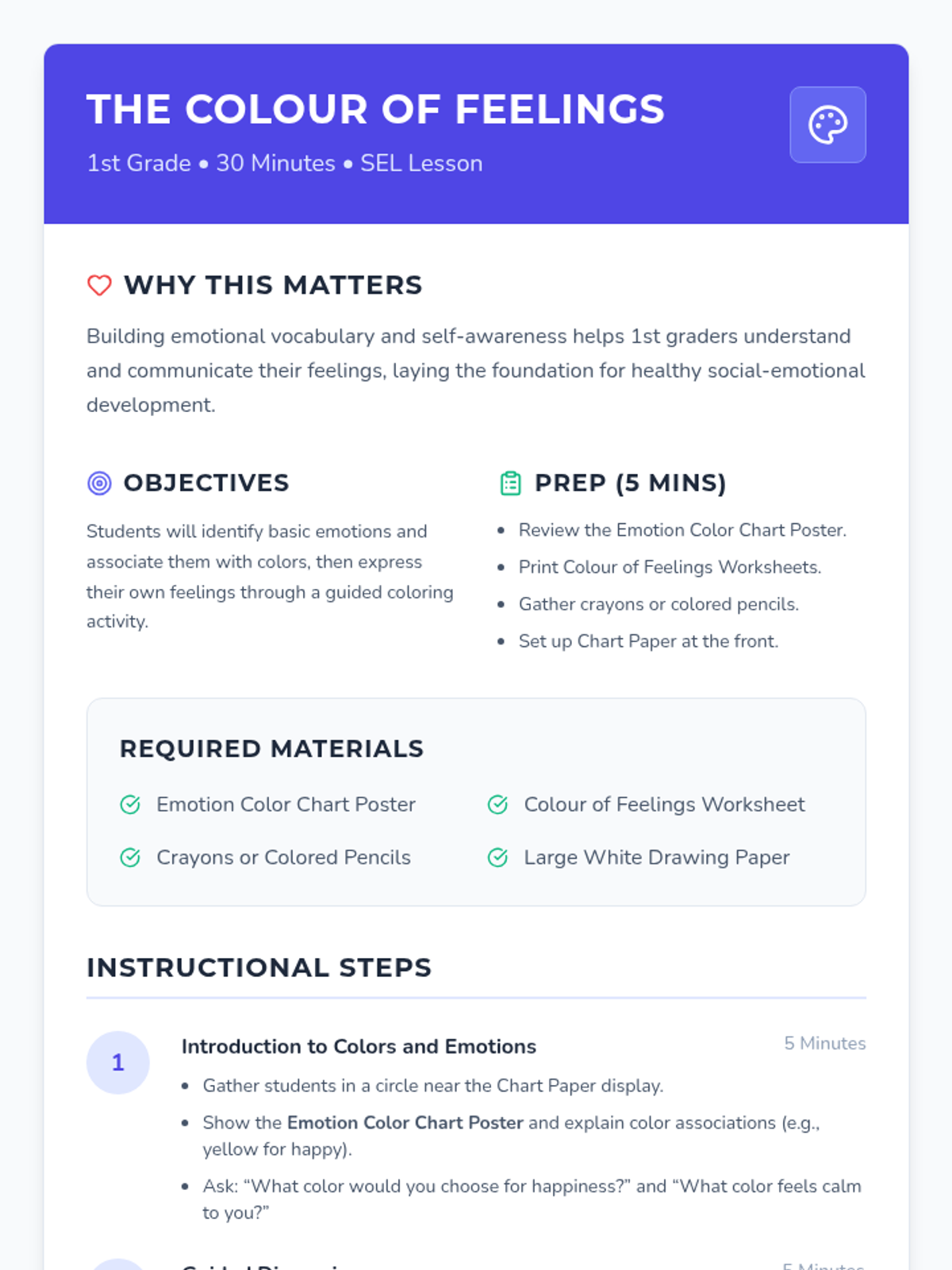 In this engaging 30-minute lesson, 1st graders will explore emotions through colors, learning to identify and express feelings in a fun, artistic way. This lesson helps students build emotional vocabulary, self-awareness, and social-emotional skills through drawing and discussion.