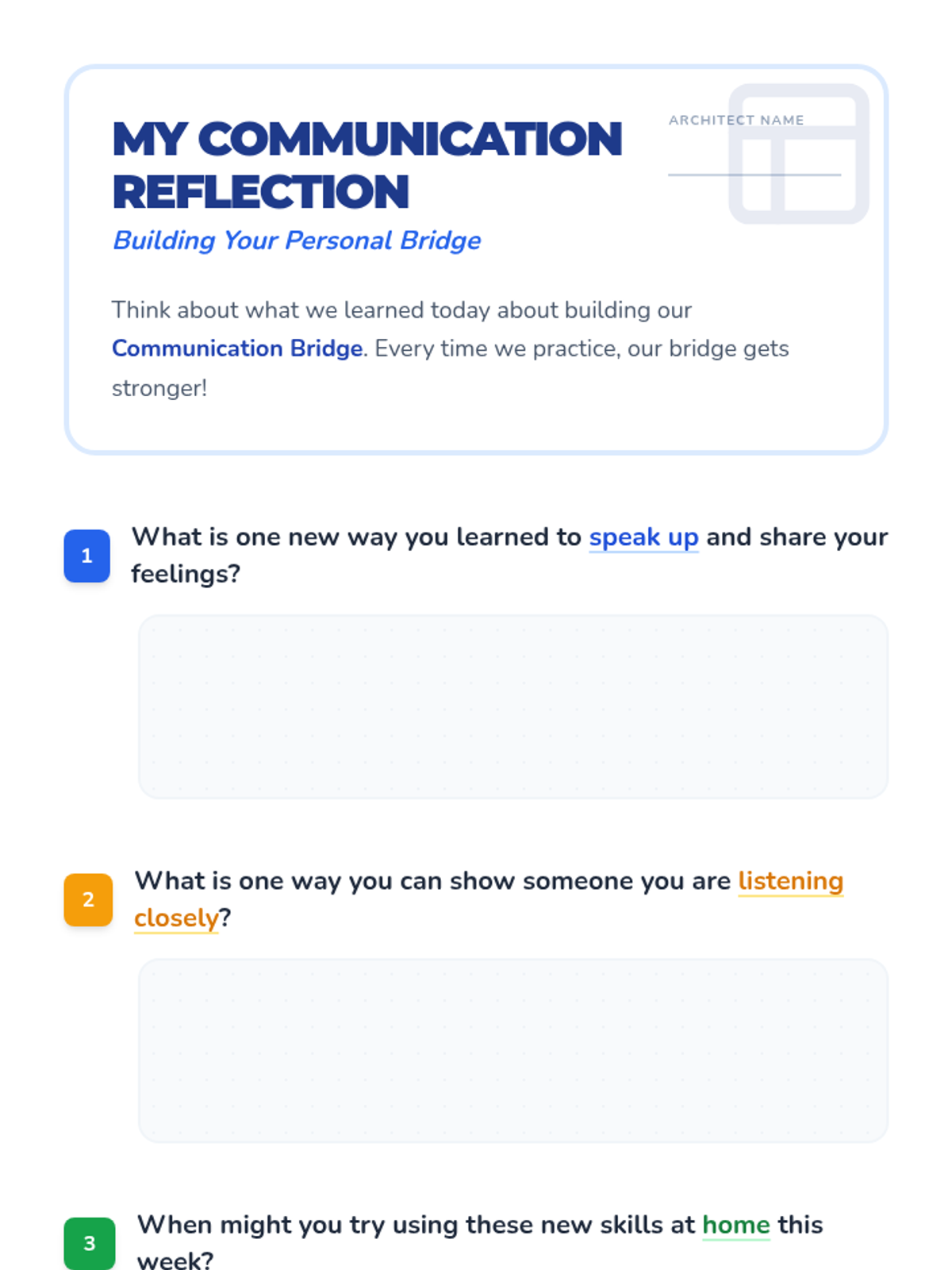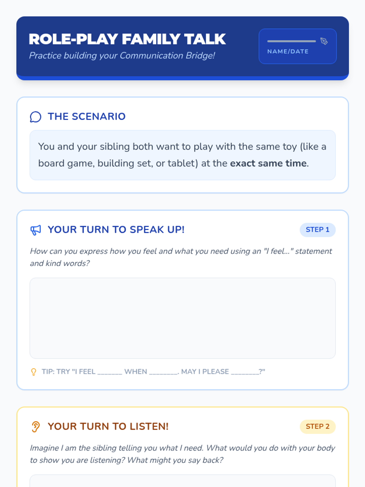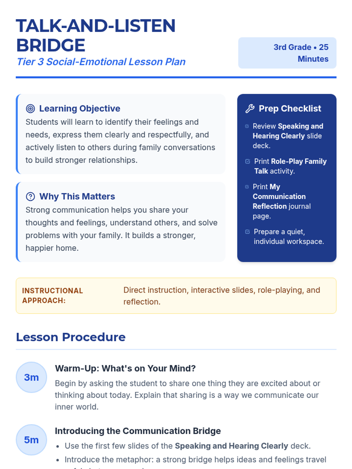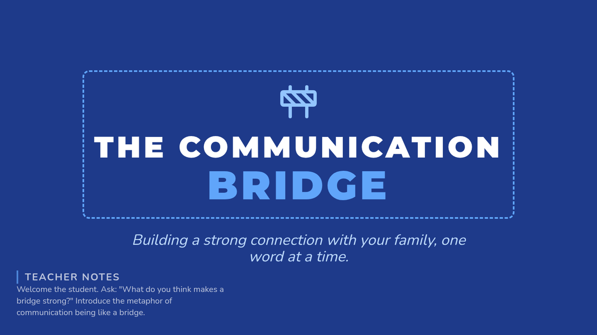 This Tier 3 intervention lesson teaches a 3rd-grade student how to build a 'communication bridge' with family members by using 'I feel' statements, asking for needs respectfully, and practicing active listening.