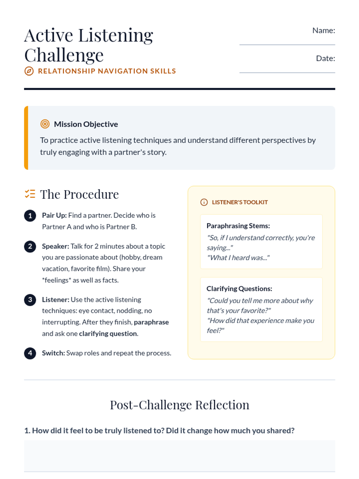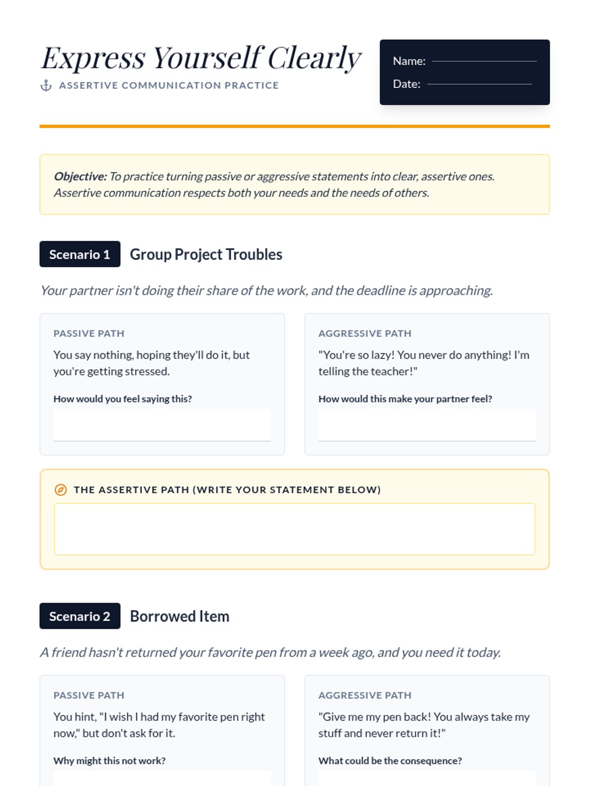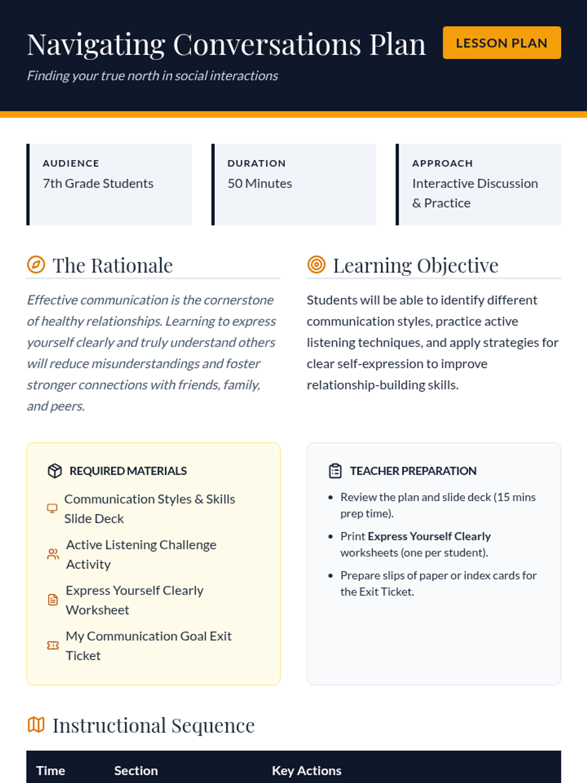 A 50-minute lesson for 7th graders focusing on communication styles (passive, aggressive, assertive) and active listening techniques to build stronger relationships.
