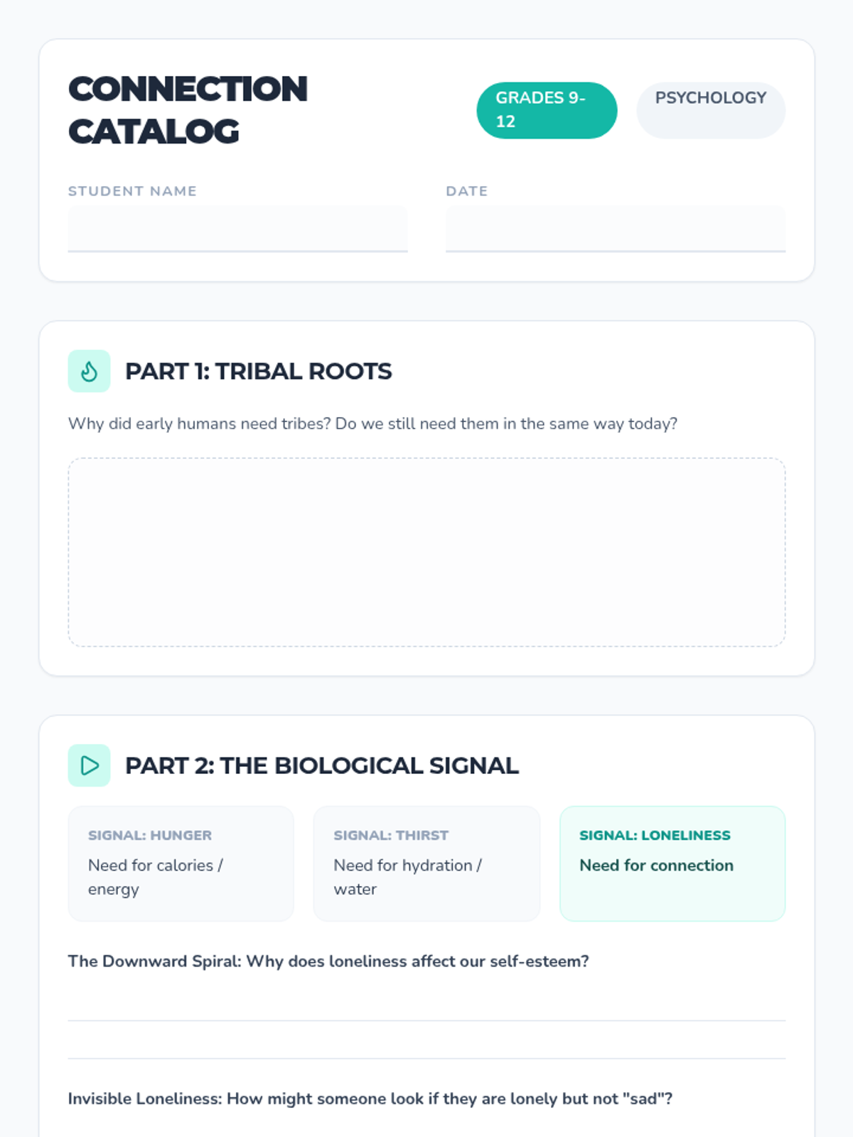 Students explore the biological and evolutionary roots of loneliness, analyzing the "downward spiral" of isolation and comparing modern digital interactions to nutritious social connection.