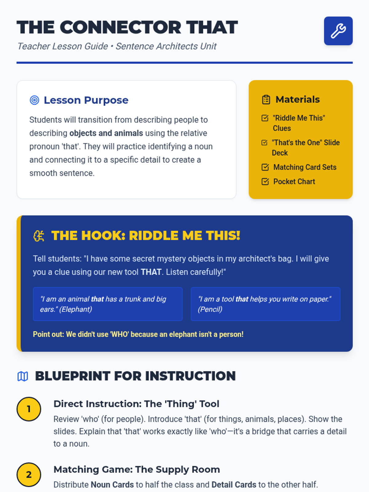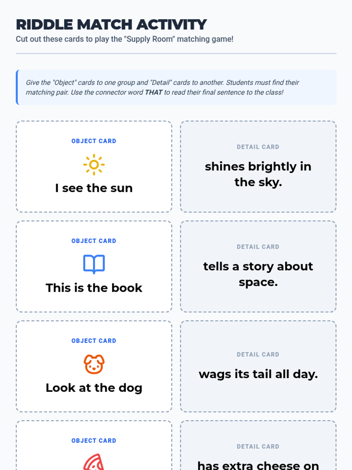 Students focus on using 'that' to describe objects and animals, participating in a riddle-based matching game.