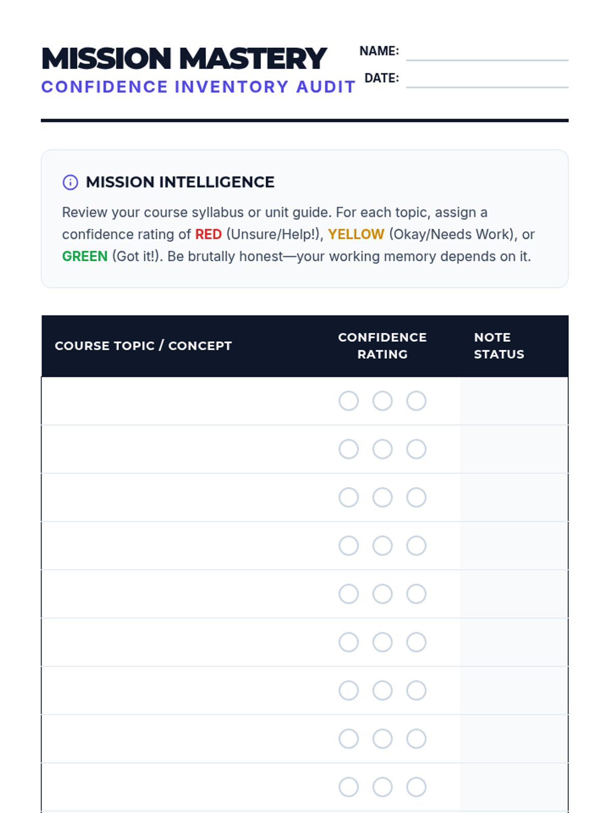 Students perform a content audit of their courses, using a Red-Yellow-Green confidence system to identify areas needing heavy working memory support.
