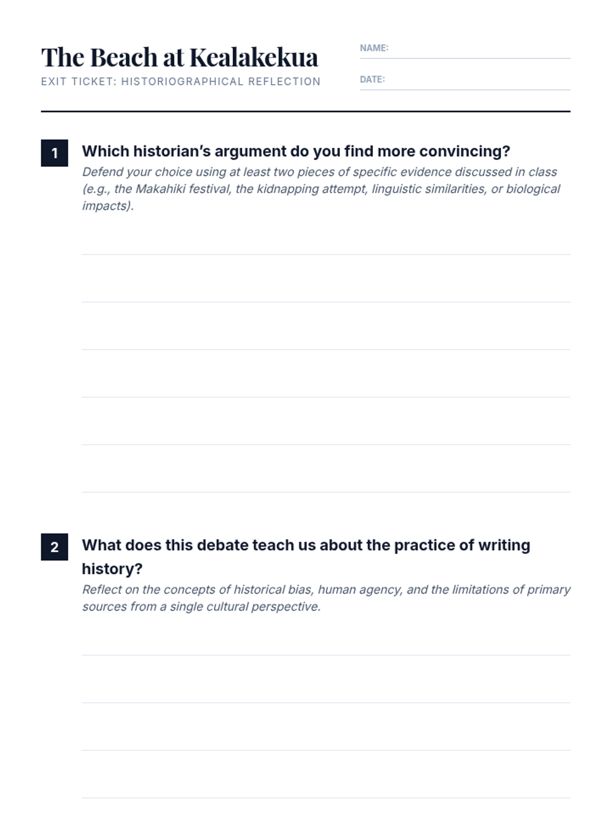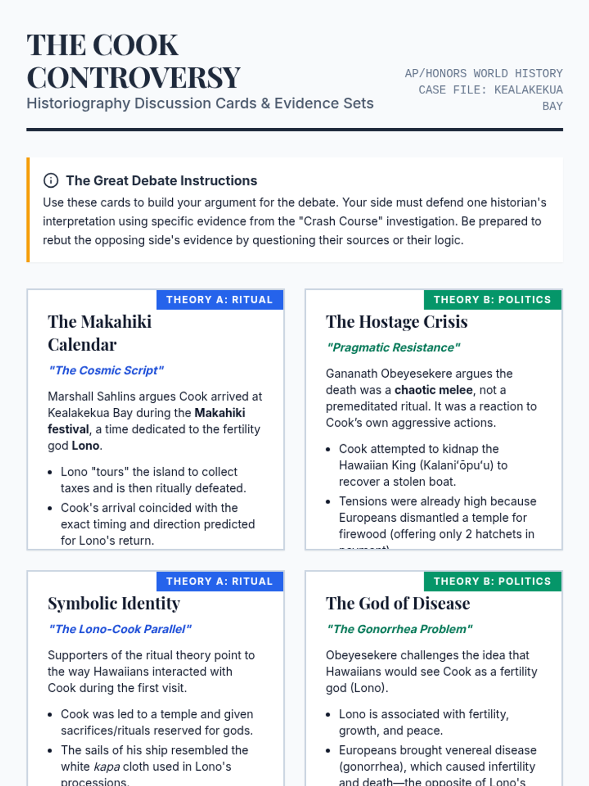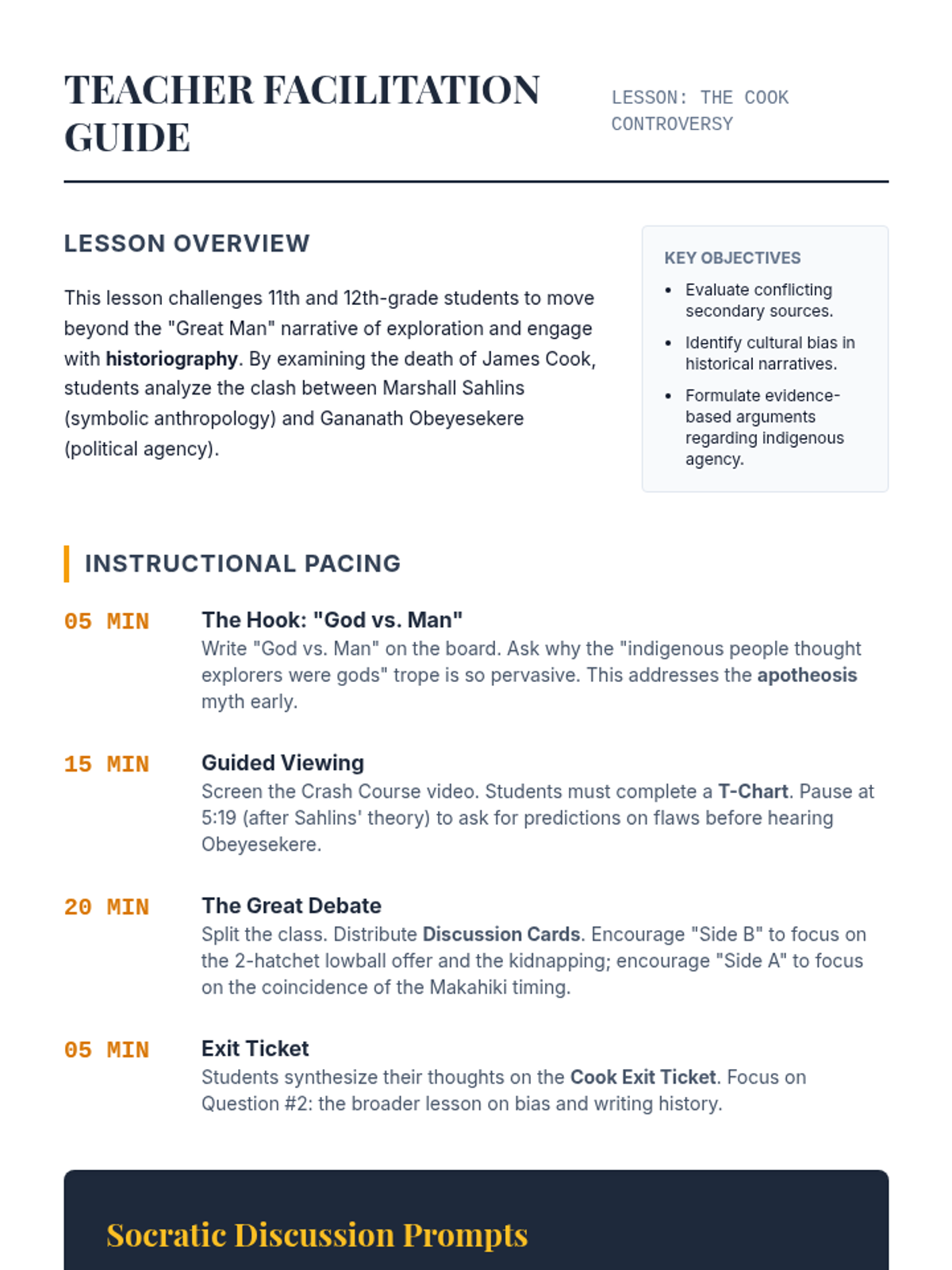 A high-school level historiography lesson examining the conflicting theories surrounding Captain James Cook's death in Hawaii. Students analyze the debate between Marshall Sahlins and Gananath Obeyesekere to understand how historical narratives are constructed and influenced by cultural bias.