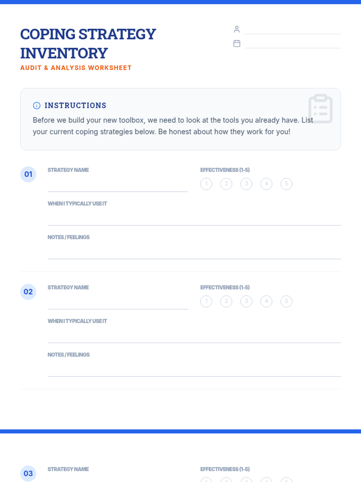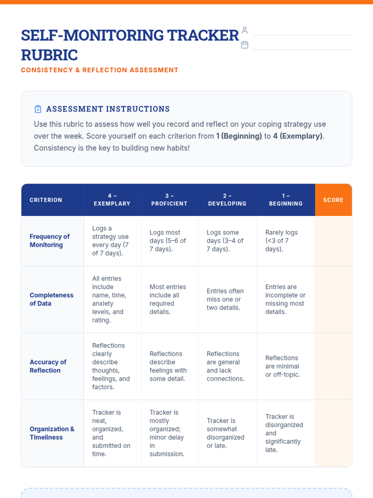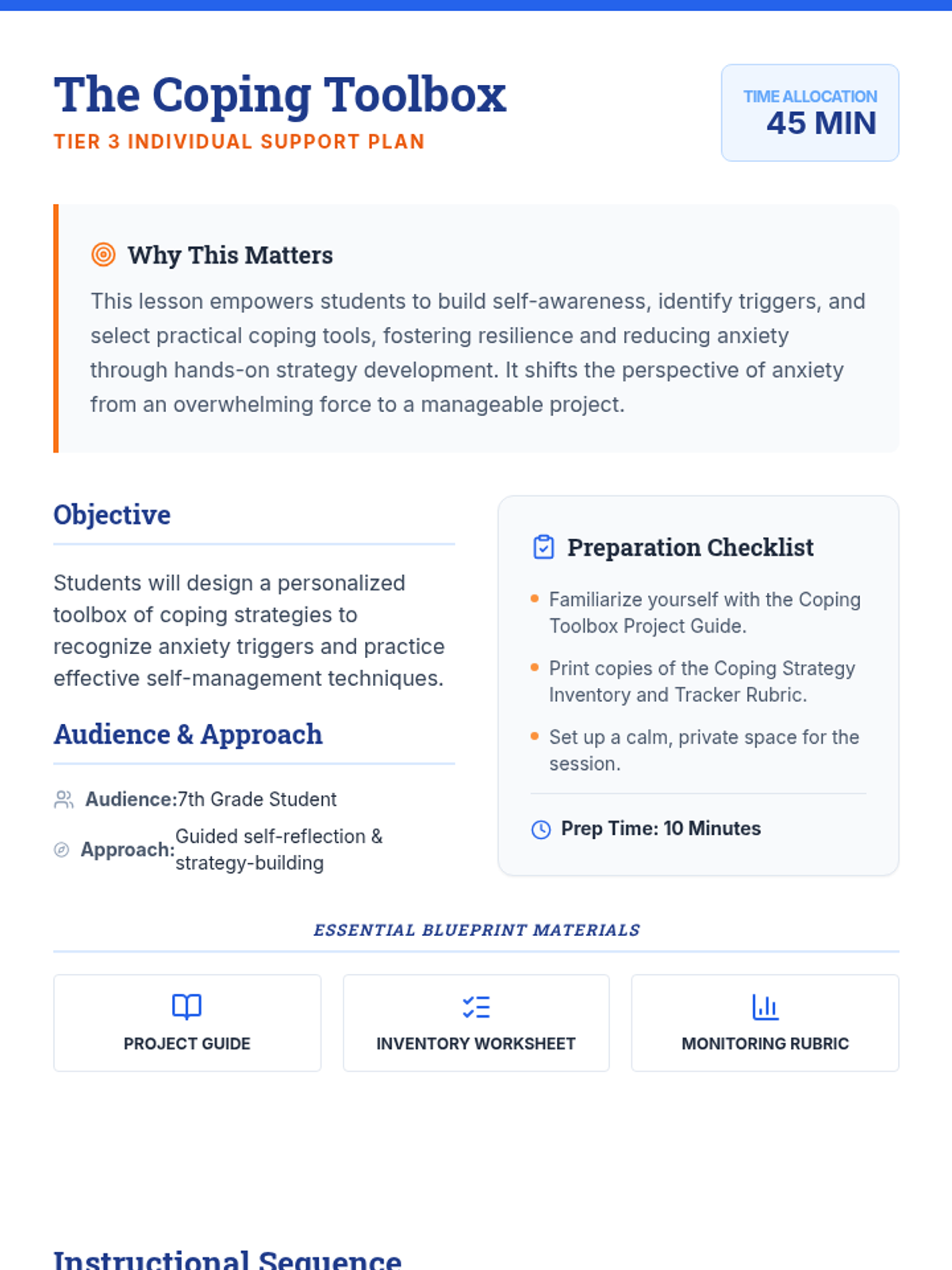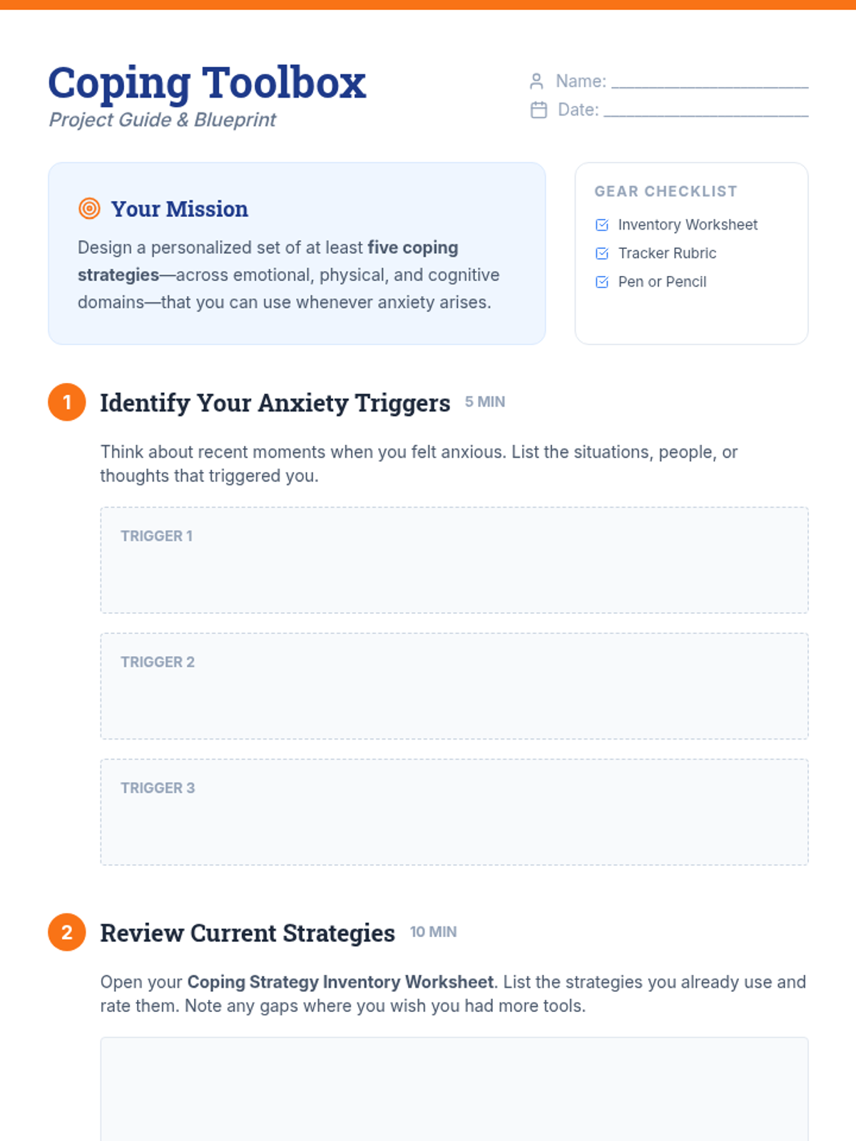 A 45-minute individual project for a 7th grade student to design a personalized coping toolbox for managing anxiety, featuring a strategy inventory, a step-by-step project guide, and a self-monitoring plan.