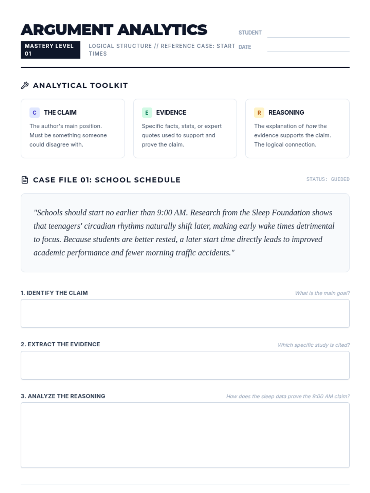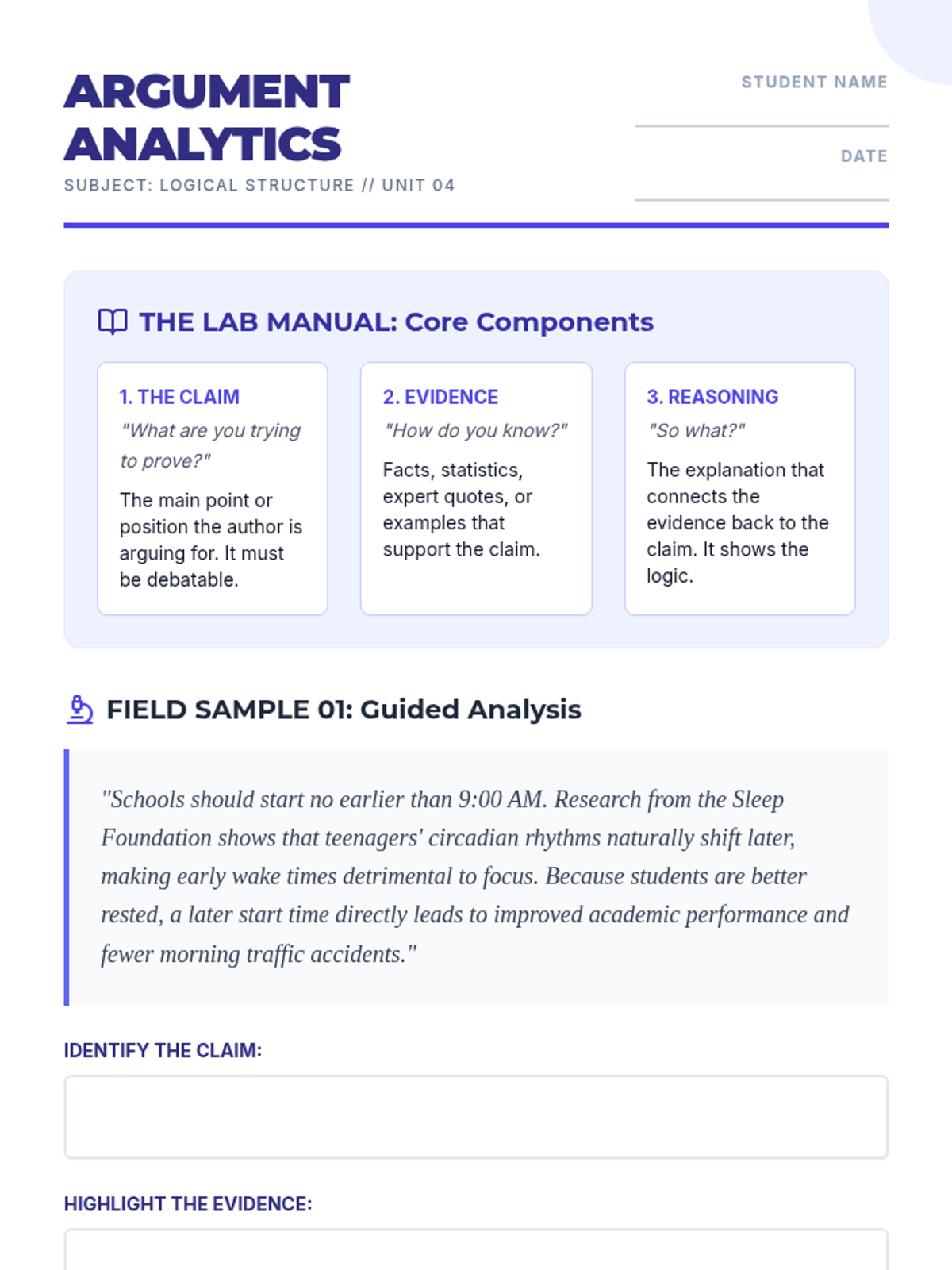A lesson focused on breaking down the components of an argument: claim, evidence, and reasoning. Students will learn to identify these elements and evaluate their logical connections.