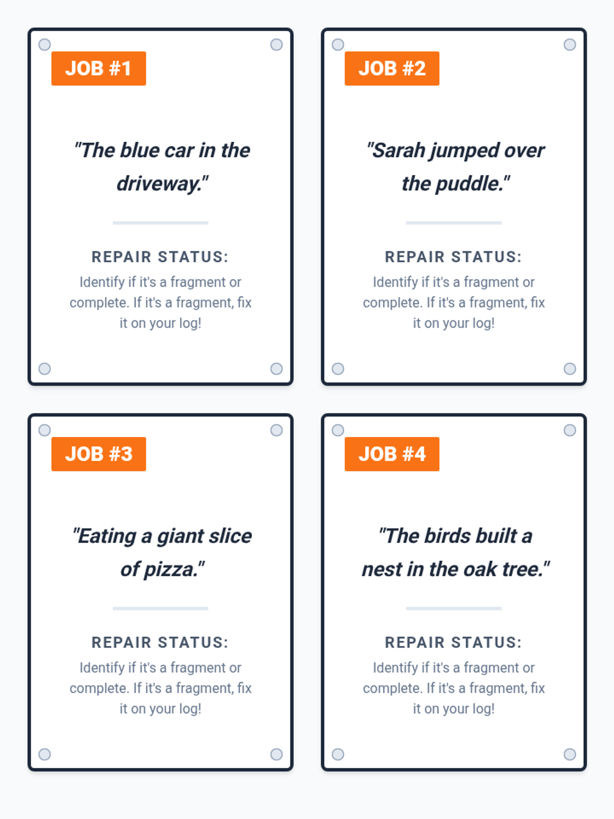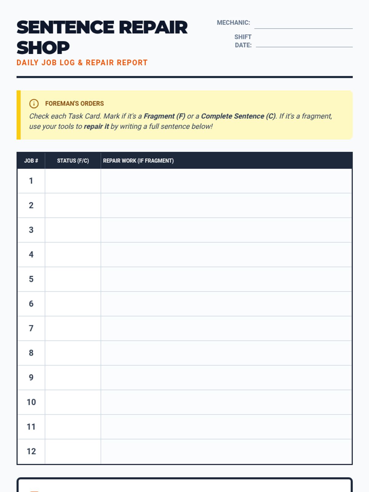 A quick-fire warm-up activity where students visit the 'Sentence Repair Shop' to identify and fix broken sentence fragments. Students use task cards and a job log to demonstrate their mastery of complete sentences.
