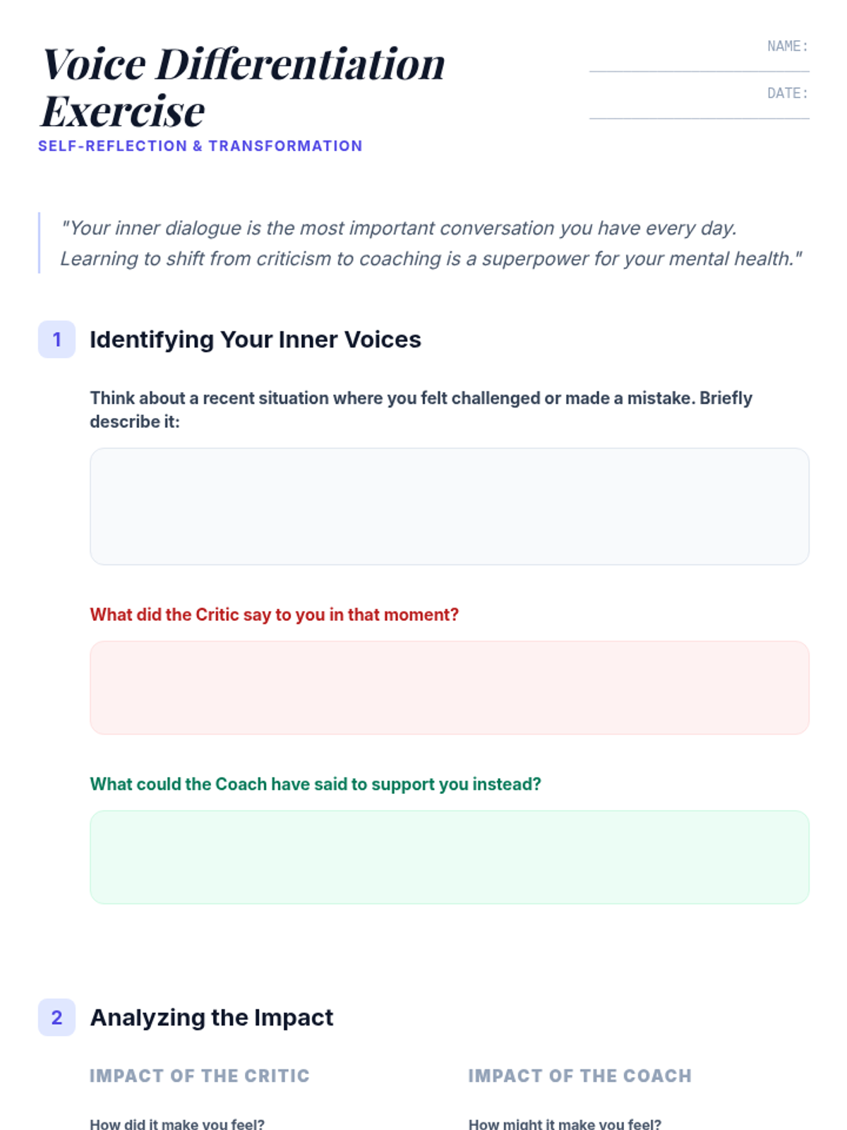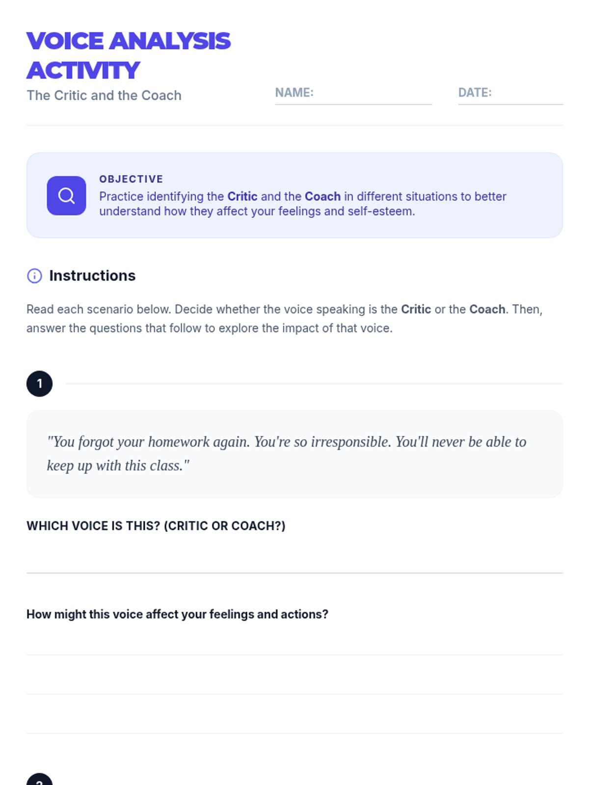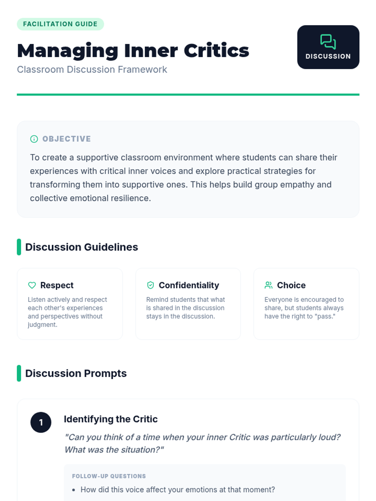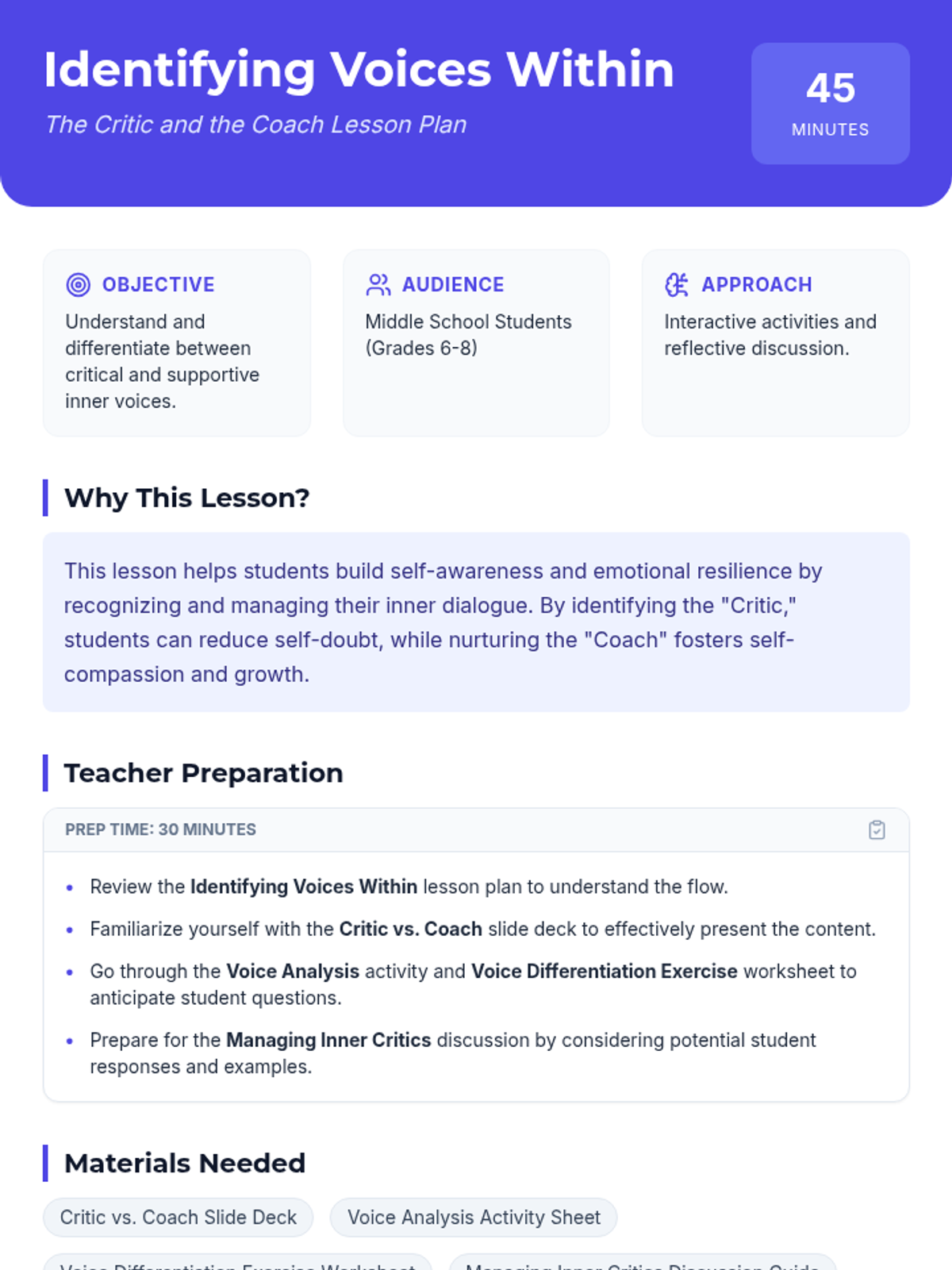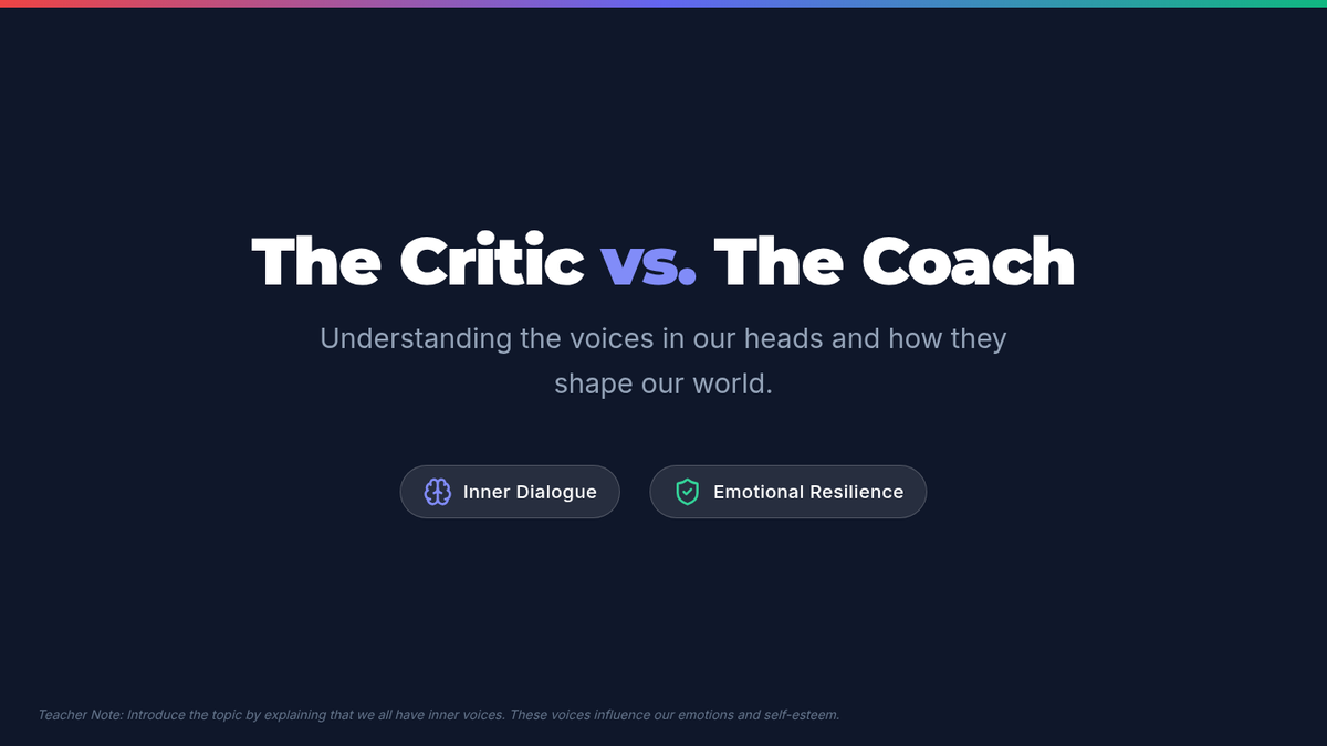 This lesson helps middle school students build self-awareness and emotional resilience by learning to identify and manage their inner dialogue, specifically differentiating between the 'Critic' and the 'Coach'.