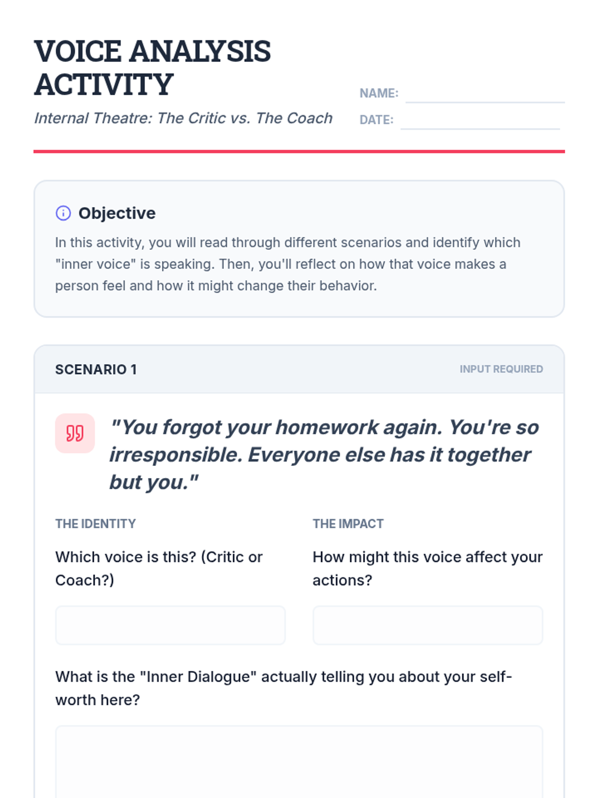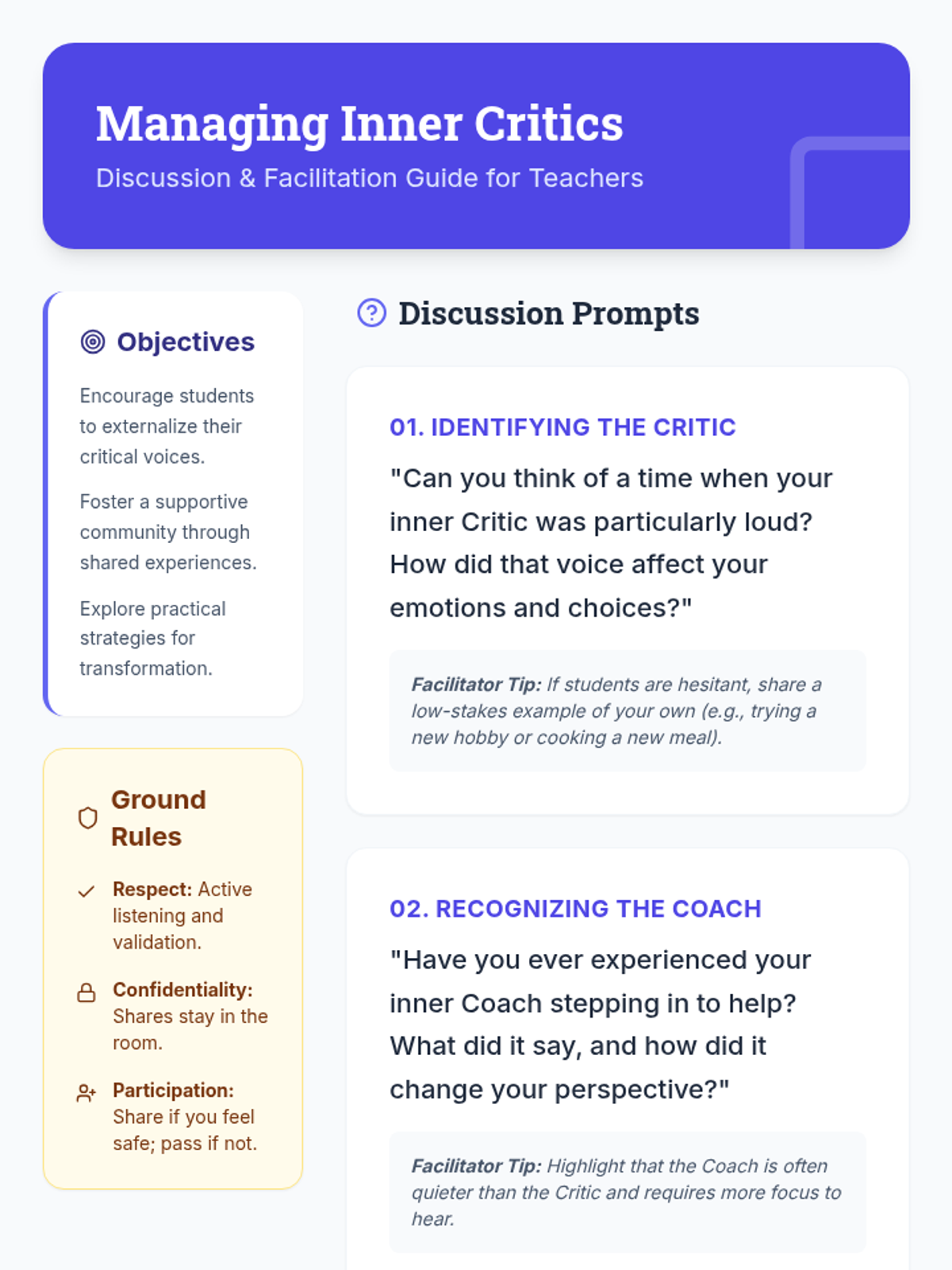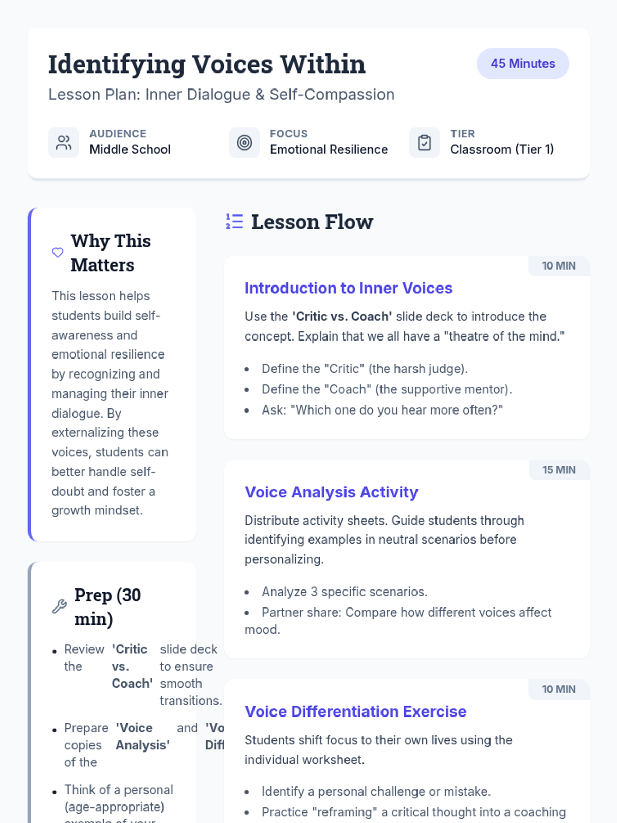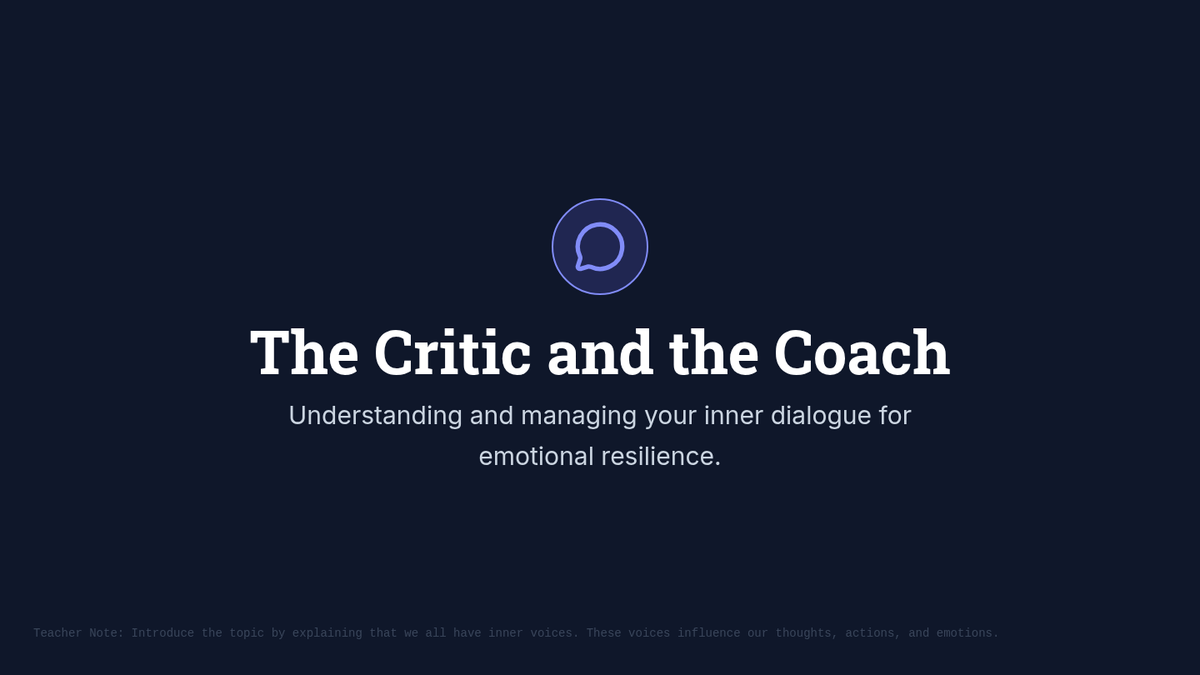 This lesson helps middle school students build self-awareness and emotional resilience by recognizing and managing their inner dialogue, specifically differentiating between the 'Inner Critic' and the 'Inner Coach'.