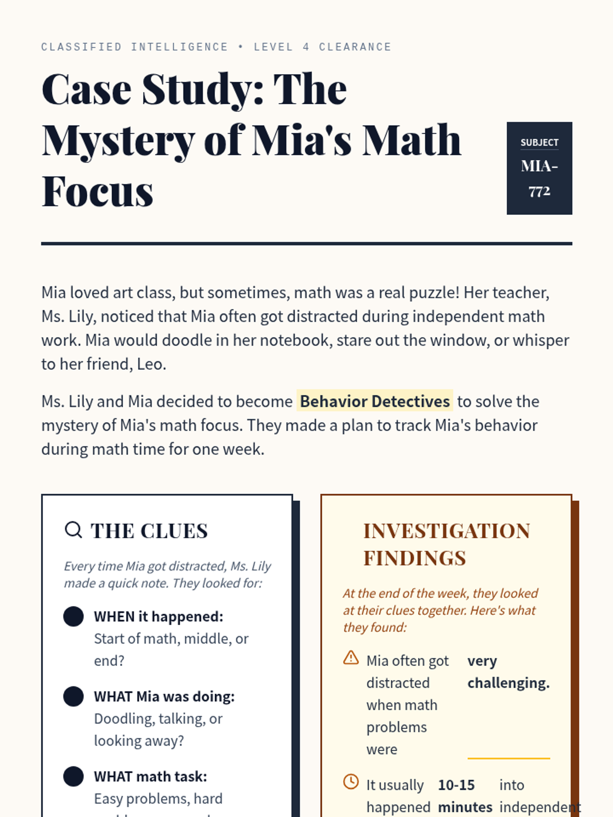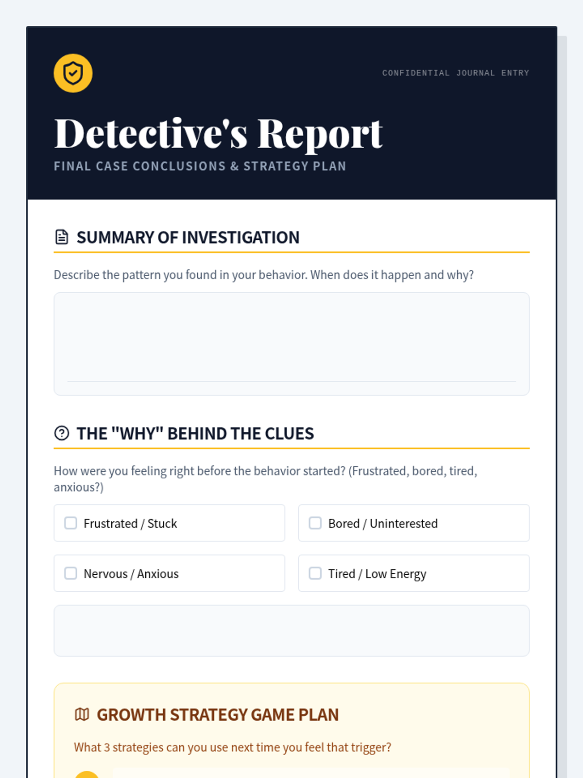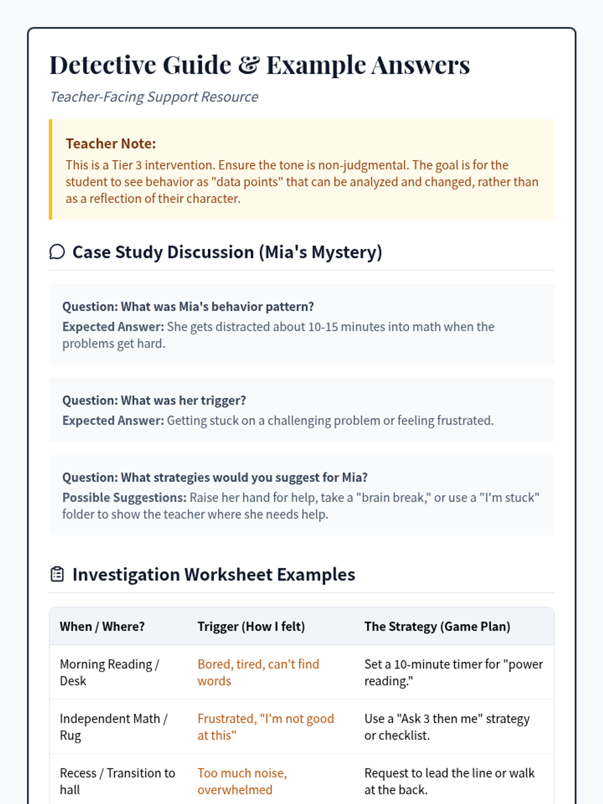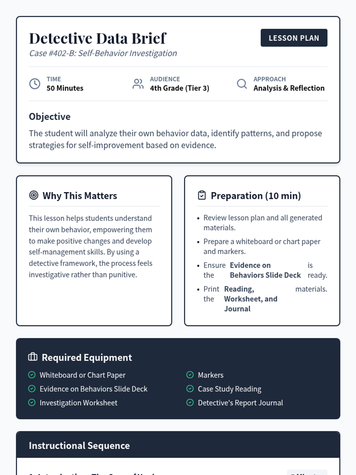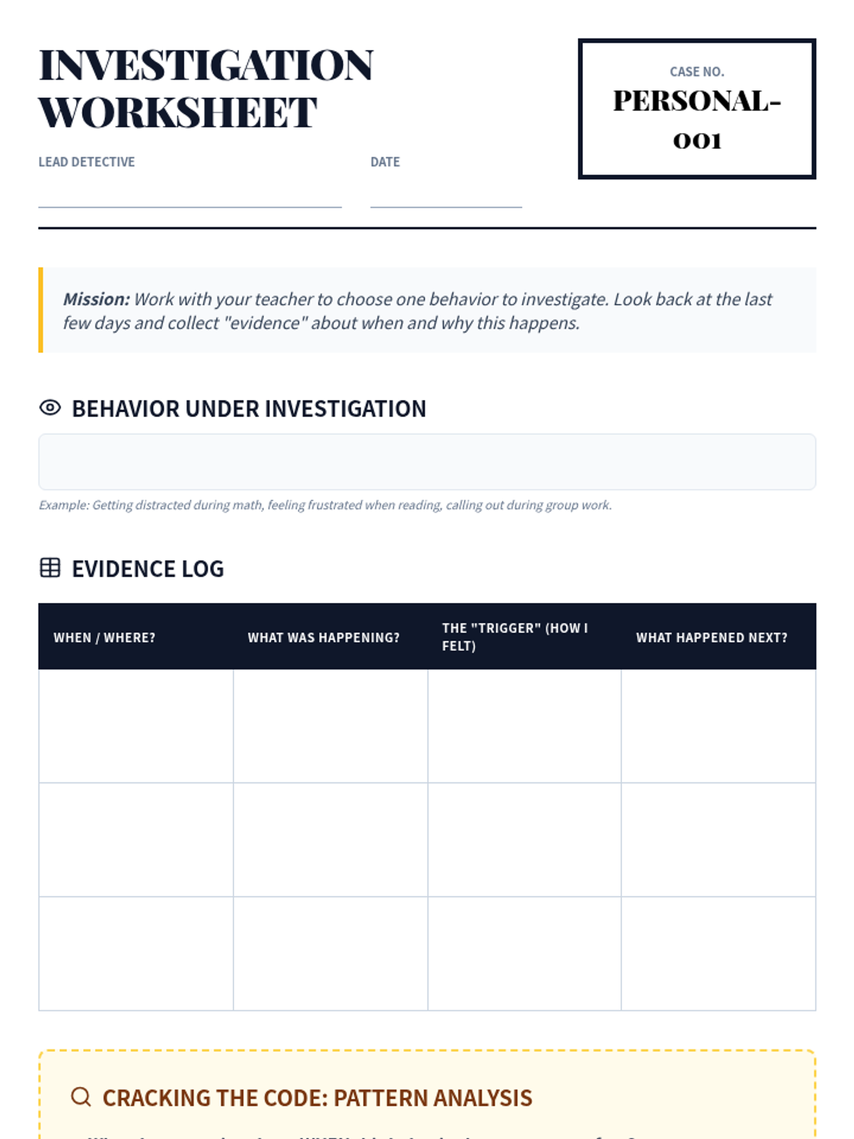 A Tier 3 individual mini-unit for 4th-grade students to analyze their own behavior patterns using a detective theme, fostering self-awareness and self-management skills.