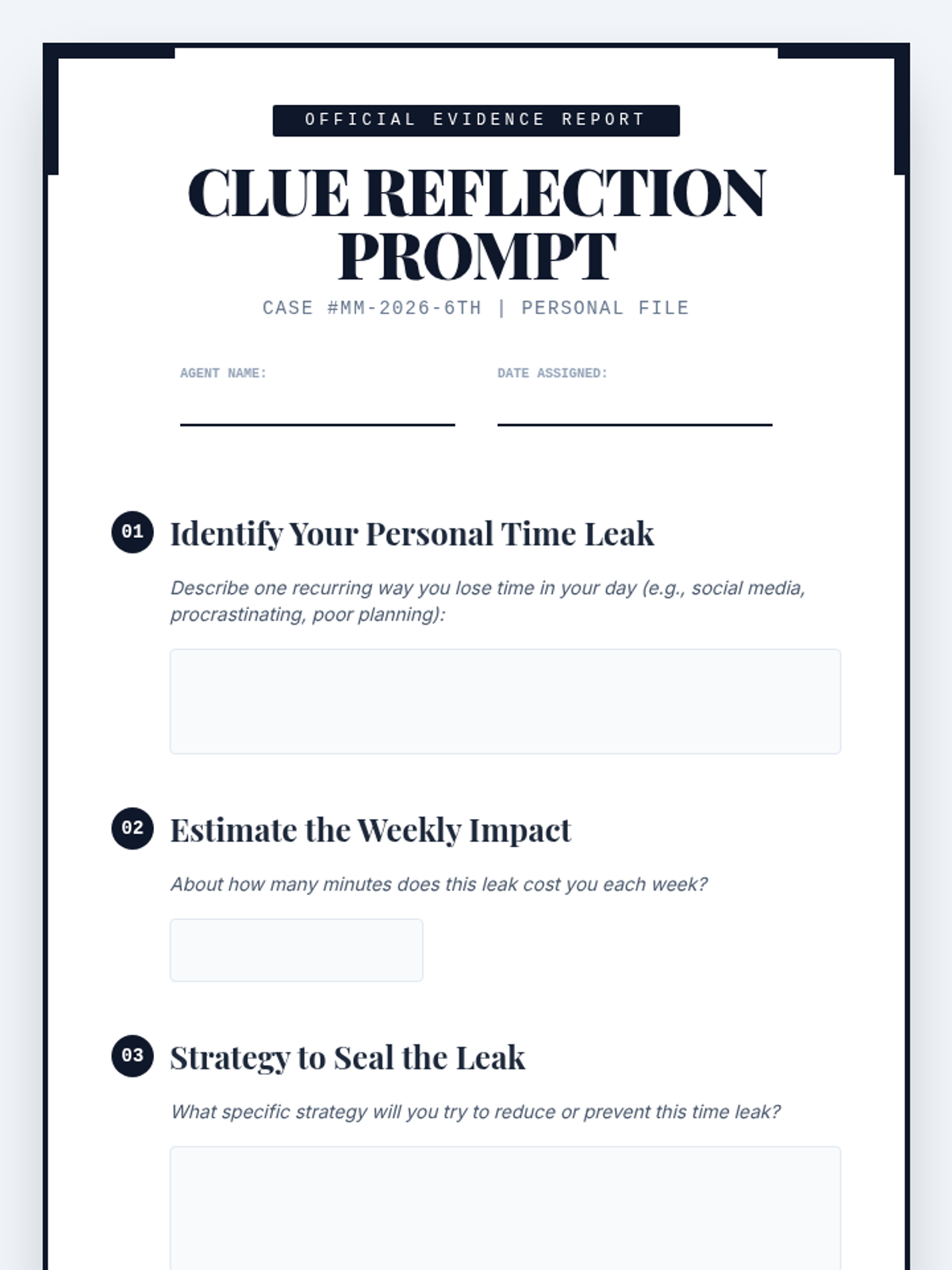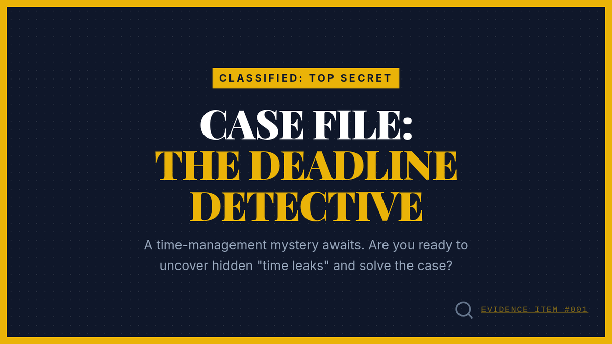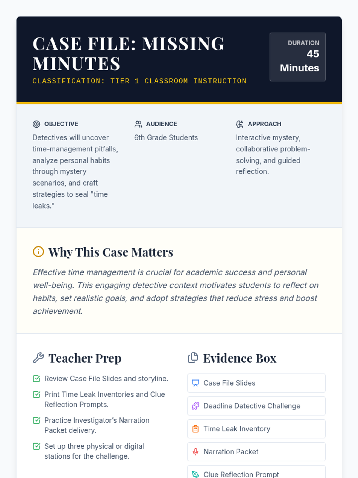 A 45-minute detective-themed lesson for 6th graders to identify time-management pitfalls (time leaks) and develop practical strategies for productivity and academic success.