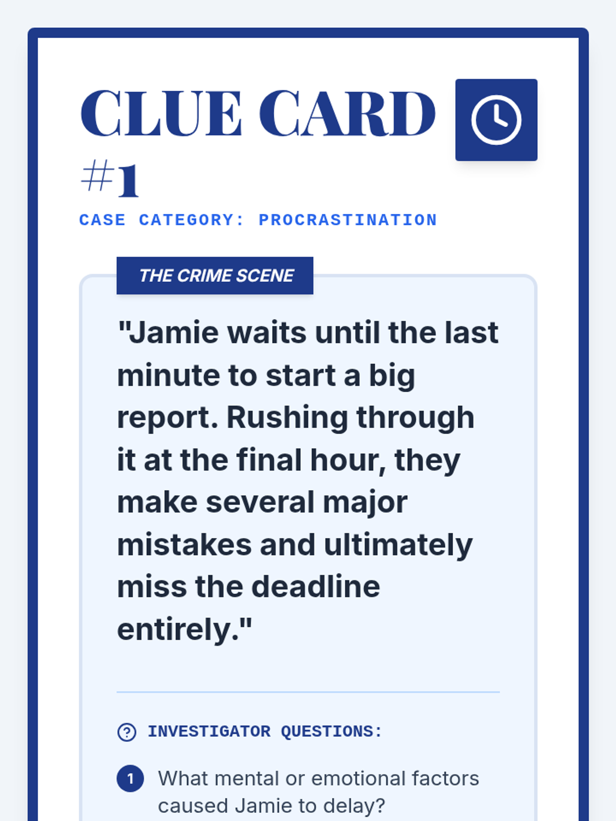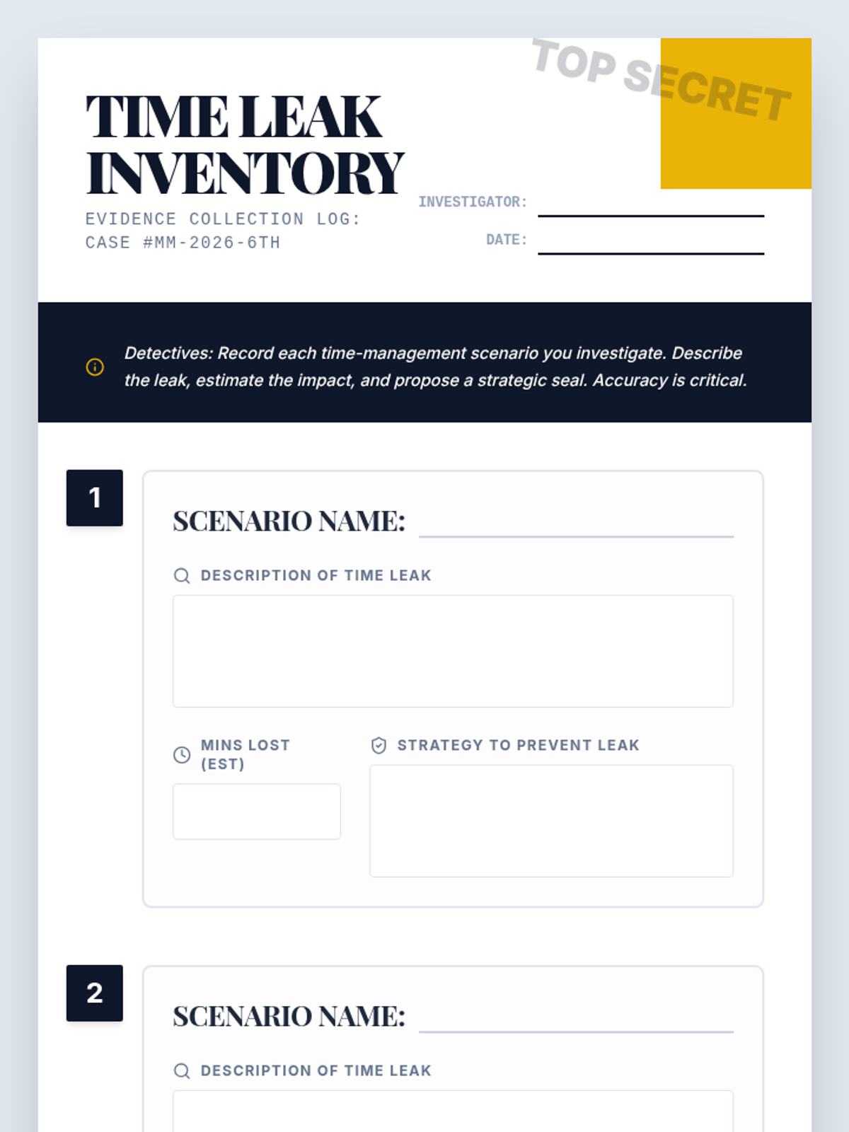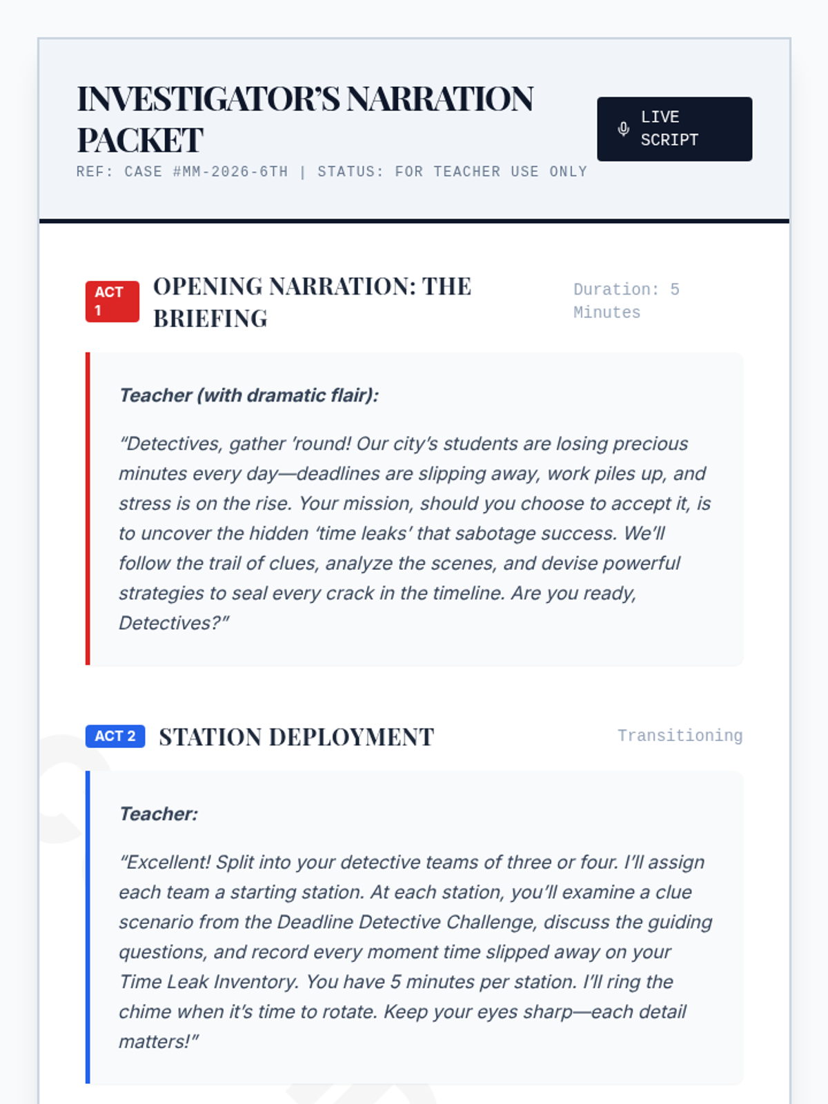 A 45-minute detective-themed lesson for 6th graders to identify time-management pitfalls (time leaks) and develop practical strategies for productivity and academic success.