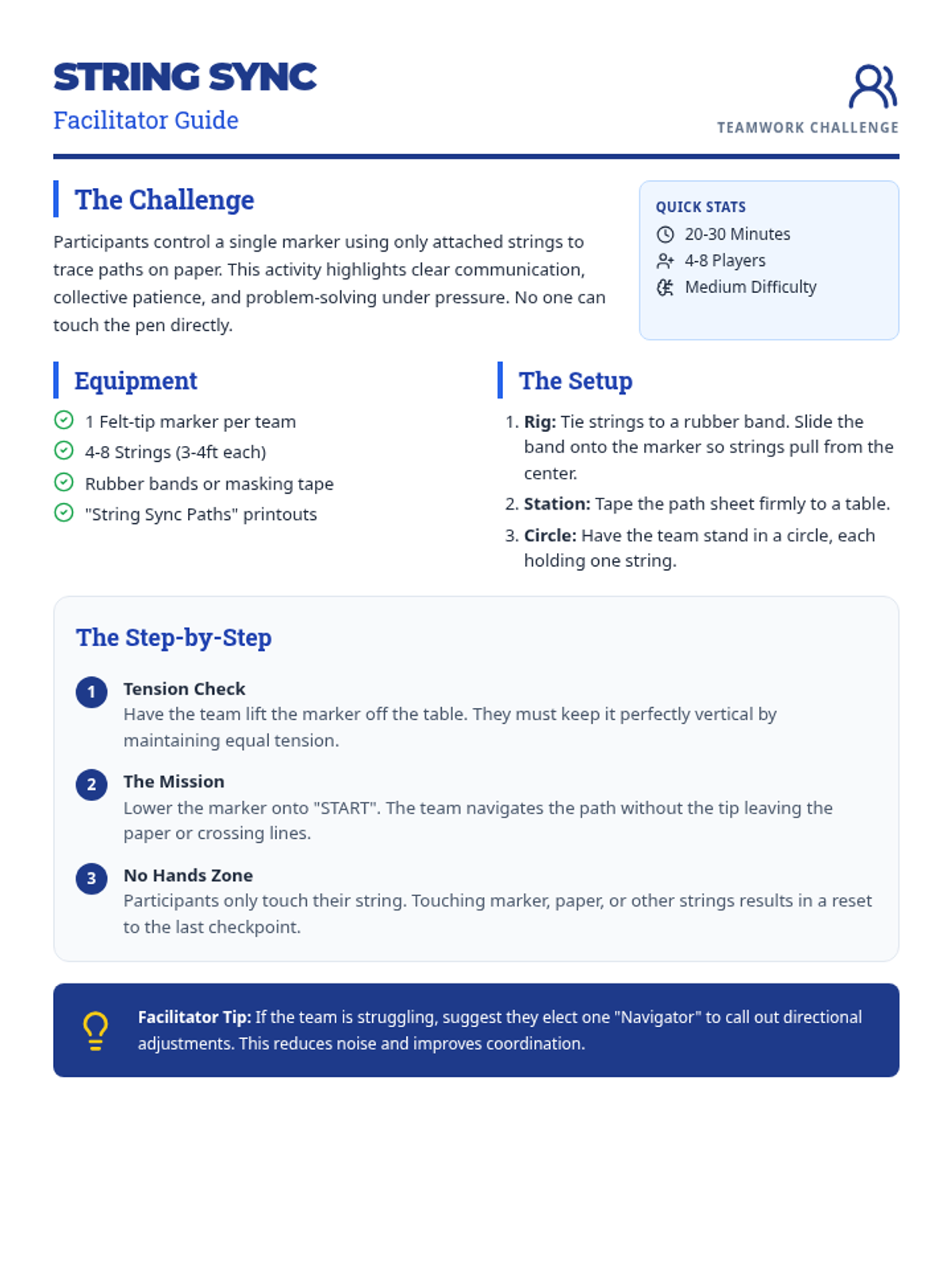 A high-energy teamwork activity where participants must coordinate movements using strings to control a single marker and trace complex paths.